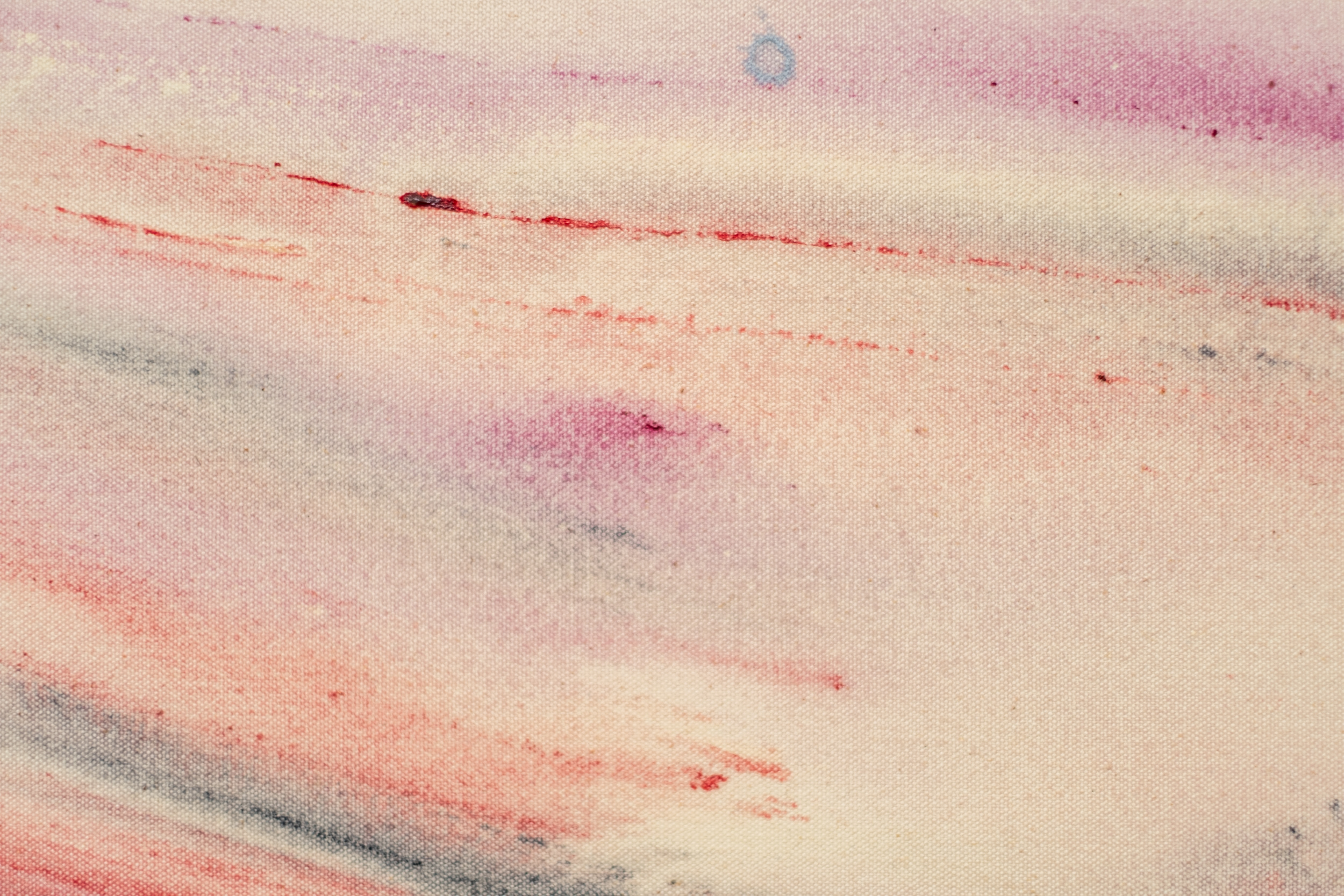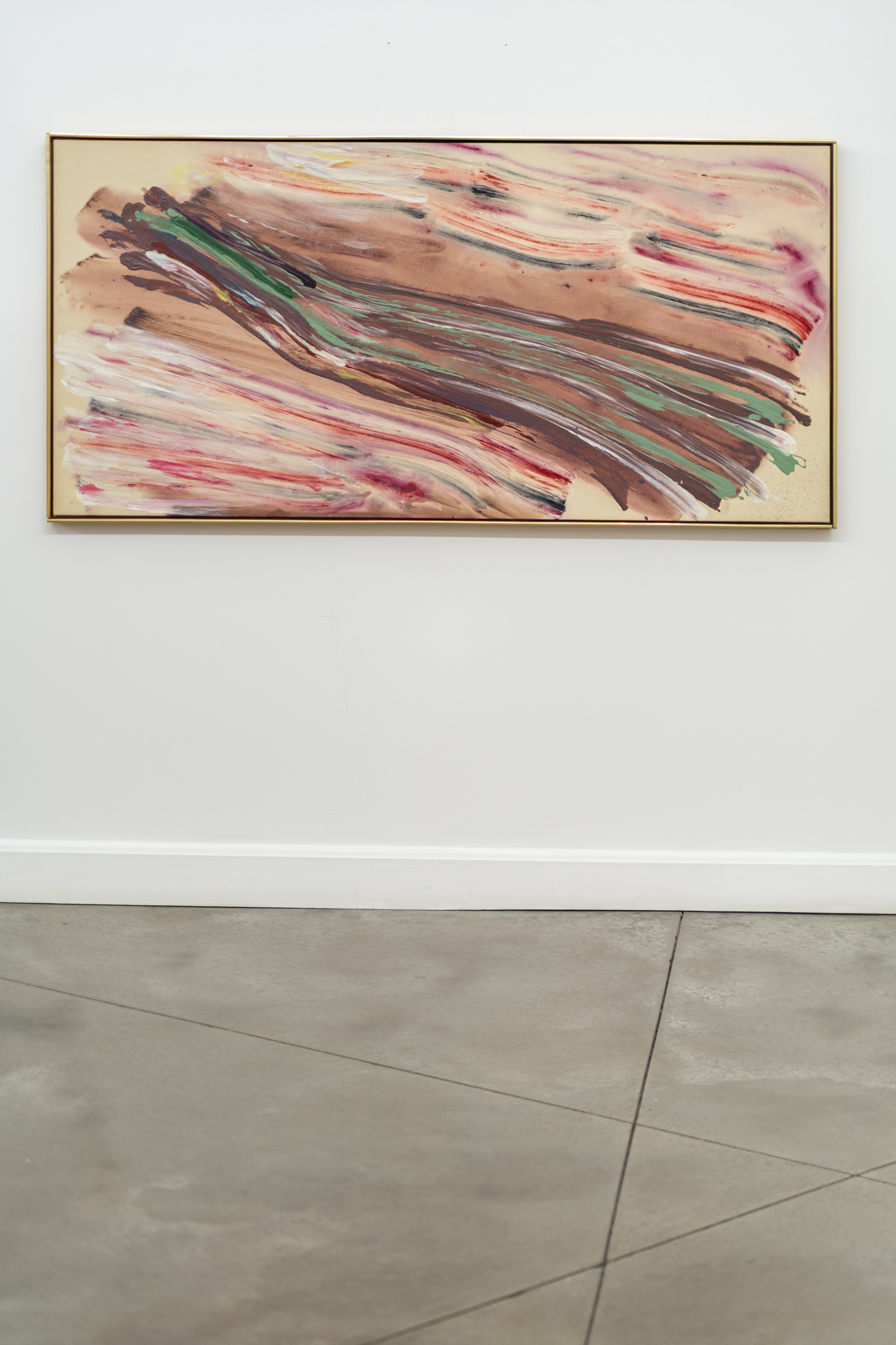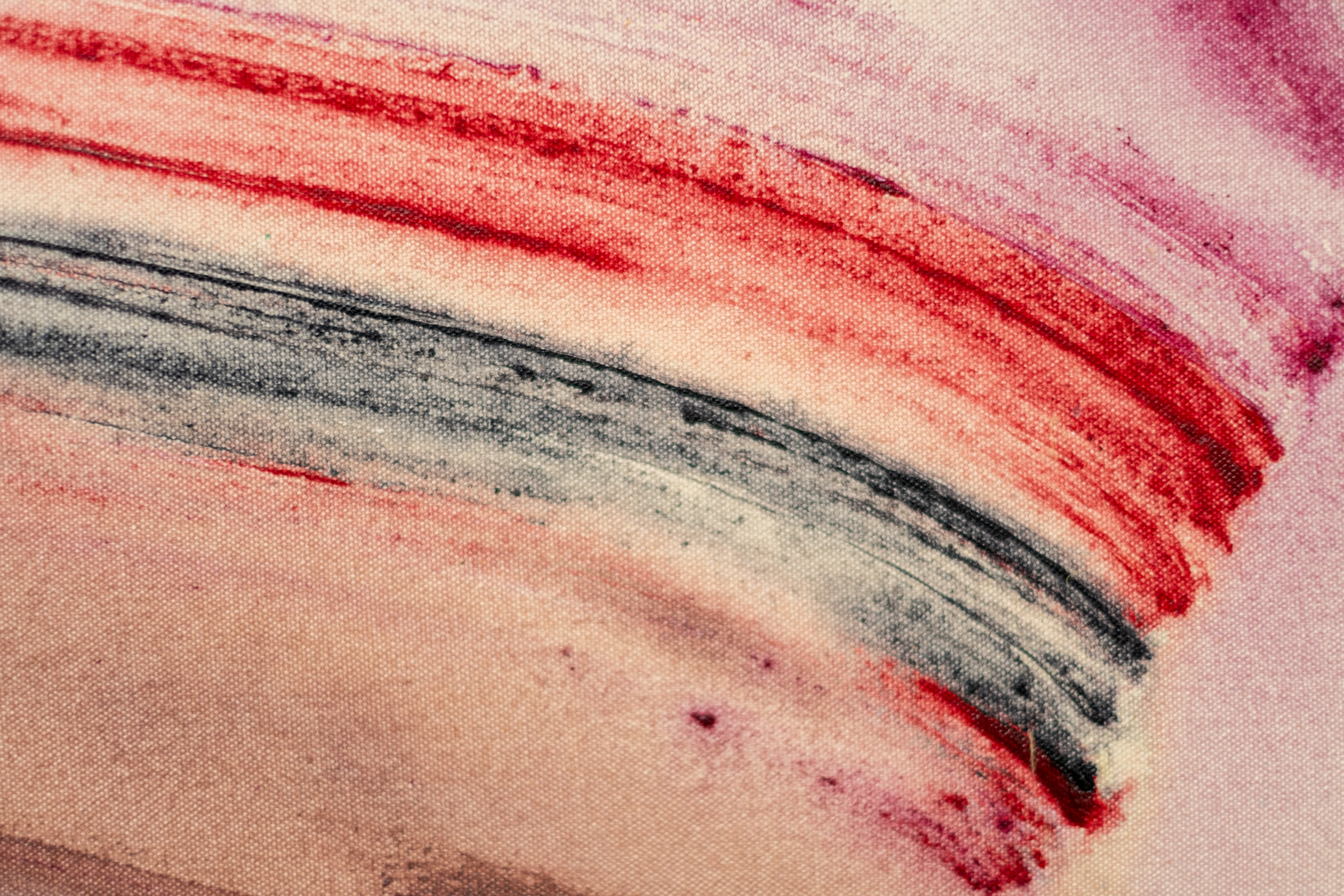 This colourful contemporary abstract painting is by Carol Sutton.In the 1970s, the paintings of a young Carol Sutton caught the attention of one of America’s best-known art critics, Clement Greenberg, who visited her studio often. The prolific artist was known for creating large-scale works painted on canvases that were placed on the floor. Sutton was appreciated for her bold use of colour and her intuitive understanding of light. This piece showcases deliciously fresh ‘peppermint’ colours—pinks, greens, red, and white that flow in fluid lines across the canvas. The intense colours are grounded by the addition of chocolate brown and black.