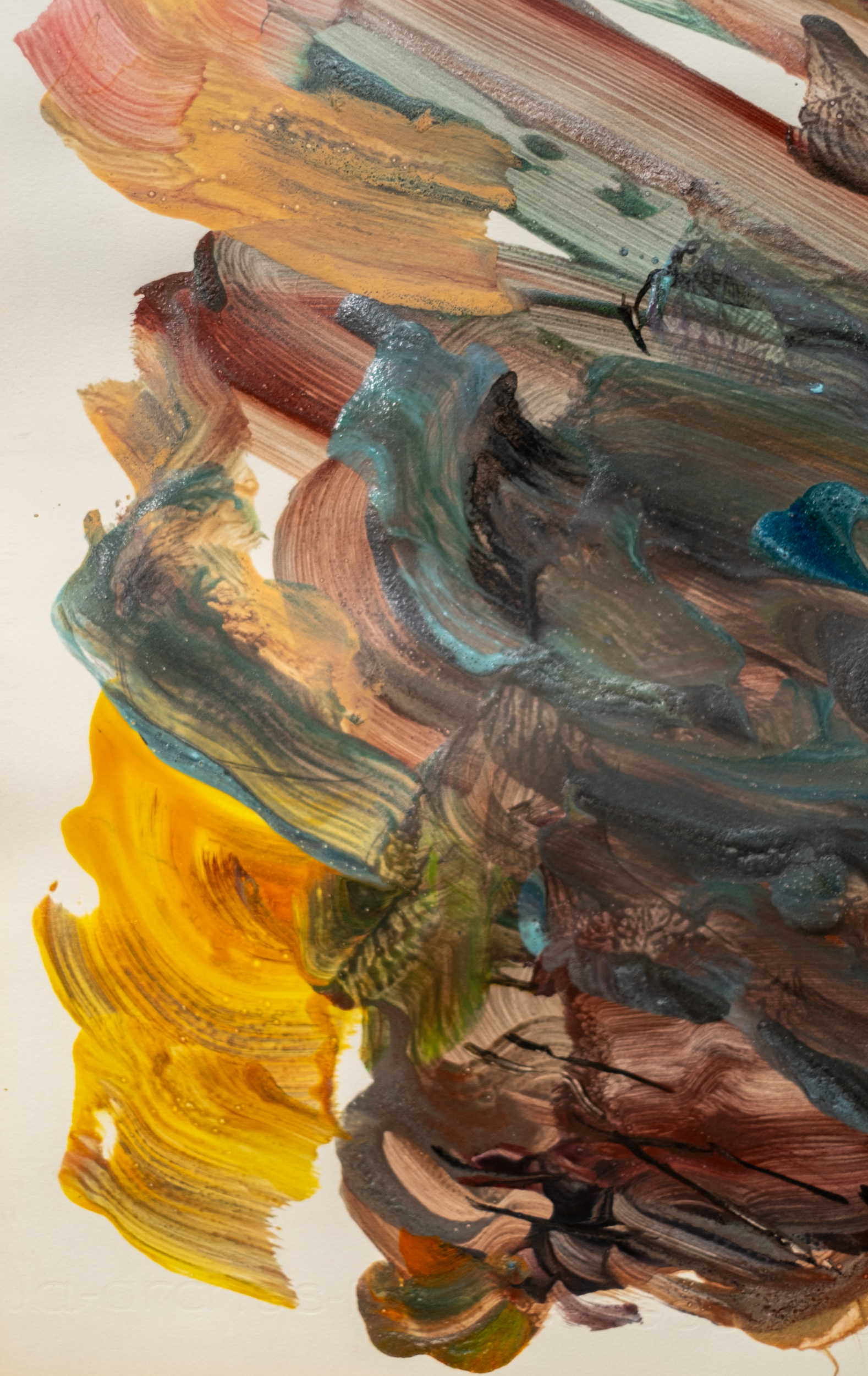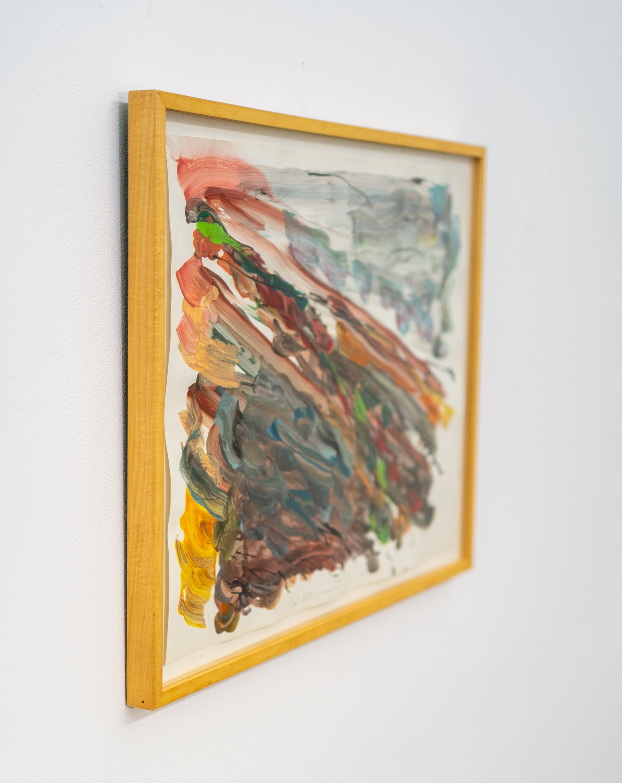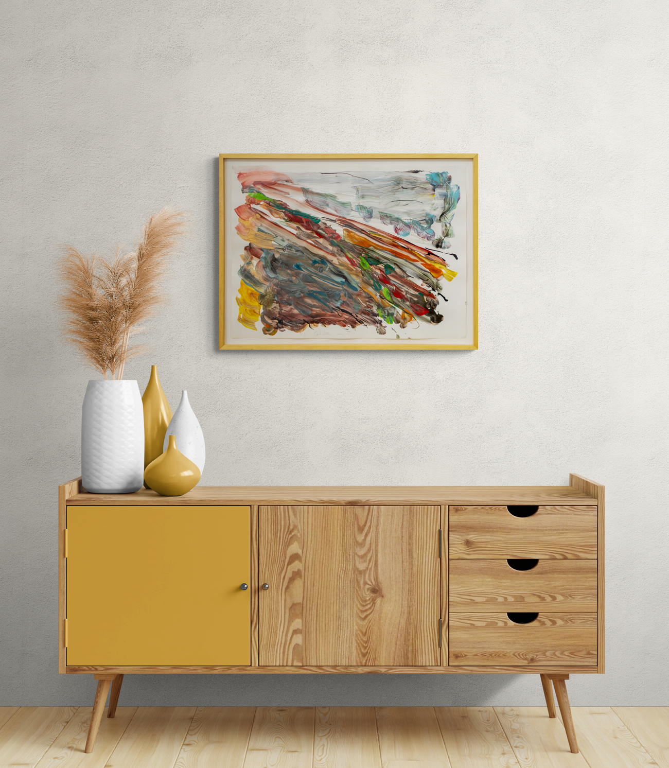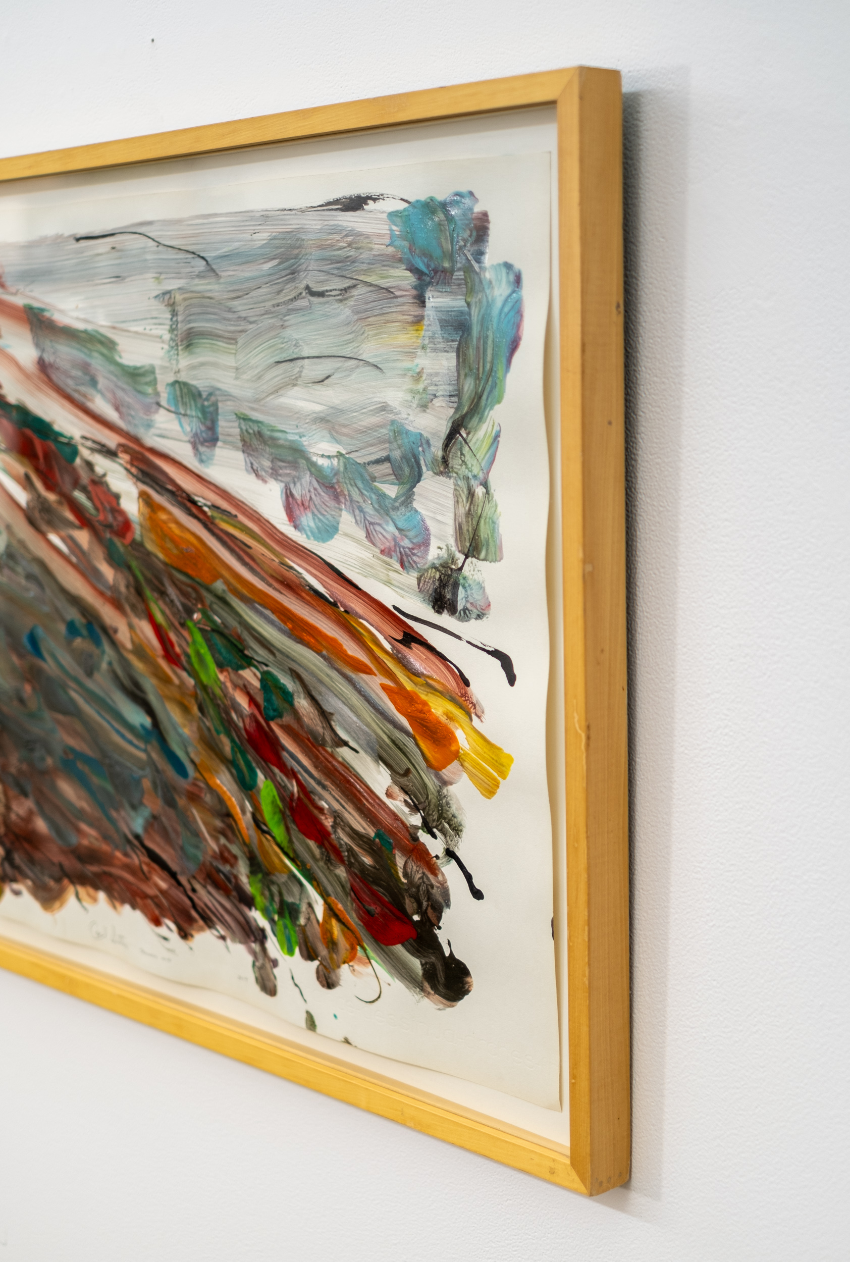 This contemporary abstract acrylic painting is by Carol Sutton.A flurry of colour and gestural brushstrokes dance across the canvas in this engaging acrylic painting by artist Carol Sutton. In the 1970s, she was considered one of the finest abstract artists in Canada, known for her intuitive colour choices and her masterful use of light. This is one of a series of works she called ‘Untitled.’ The palette here is fresh and modern—a rainbow of colours in blues, pinks, oranges, yellows, greens, accented by black and earth tones that provide contrast.
