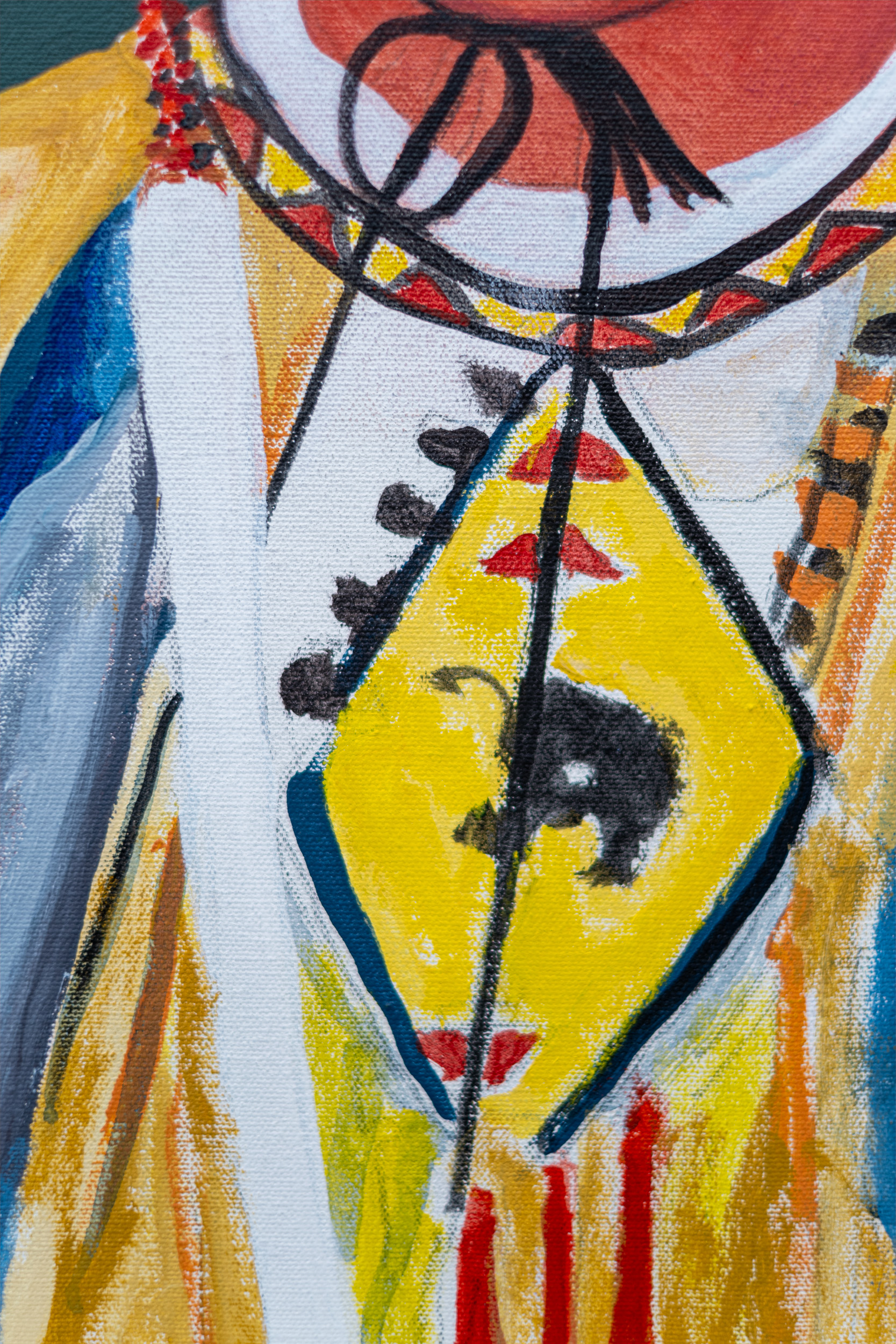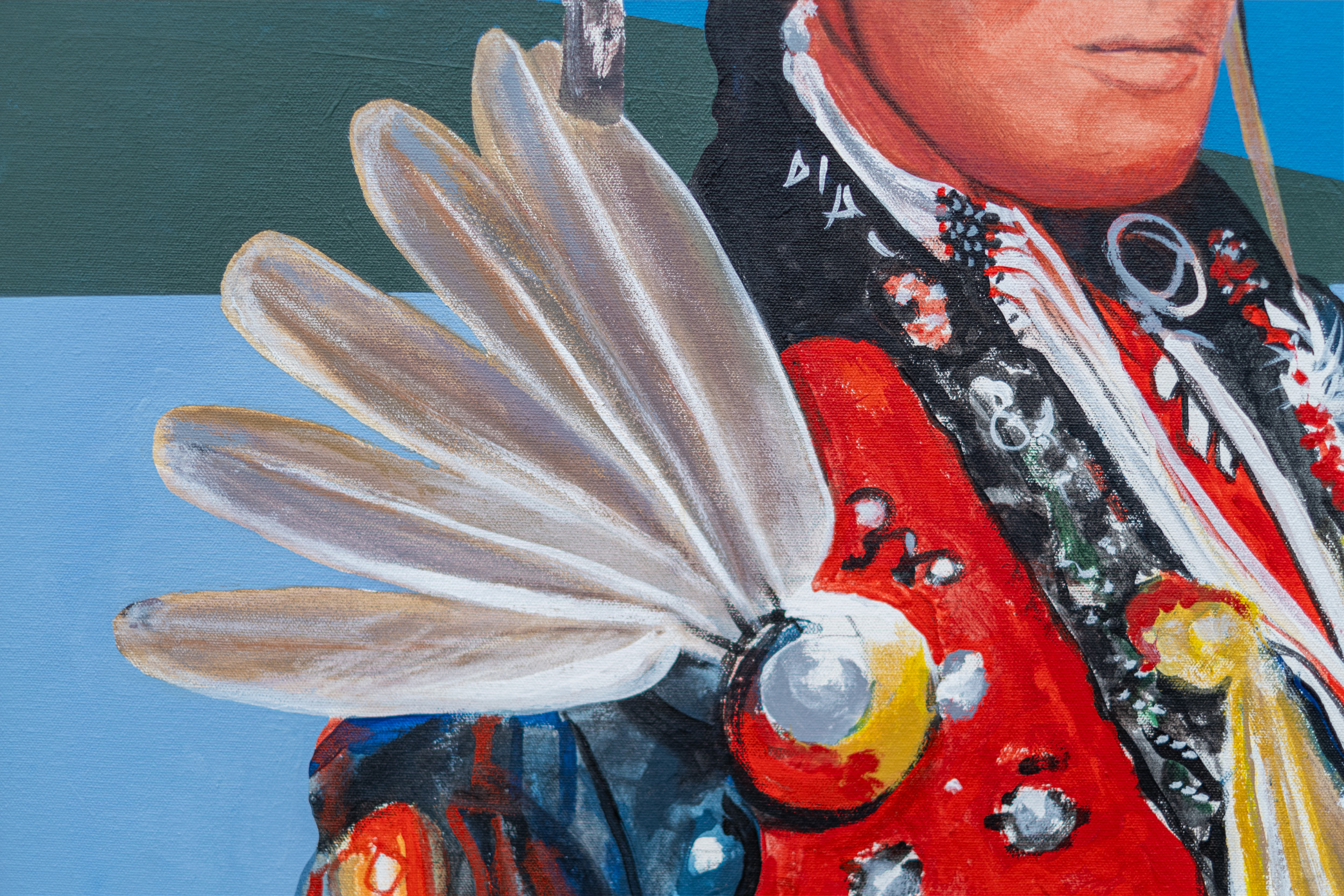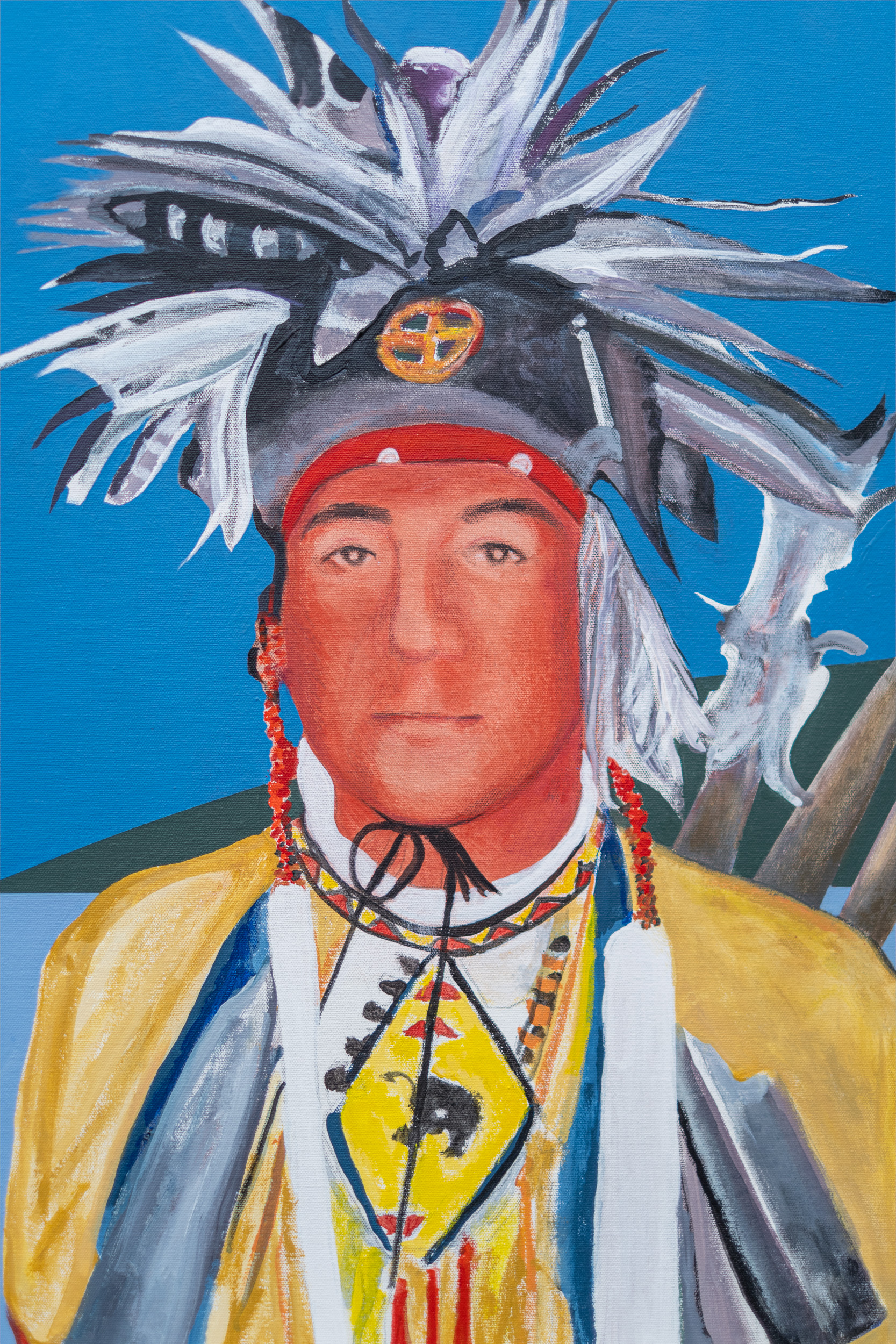 This contemporary painting by Charles Pachter features a historic indigenous figure.Resoundingly Canadian, much loved artistic polymath, Charles Pachter is perhaps best known for his colourful pop art that depicts iconic images like the Canadian flag, the maple leaf, the moose and the Queen. But, he has also created artwork that commemorates significant figures and moments from our nation’s past. This is one of a series of paintings inspired by a famous indigenous chief from the Ojibwe tribe in Ontario named William Yellowhead. Here he is seen in full traditional dress alongside his son, facing the viewer. The colour palette is characteristic of Pachter’s love of bright colours—red, yellow and orange against a deep blue backdrop. Yellowhead was a much respected leader who fought in the War of 1812 alongside both Canadian and British soldiers against invading American armies. He later went on to establish an alliance of three separate Chippewa communities that continues to this day.