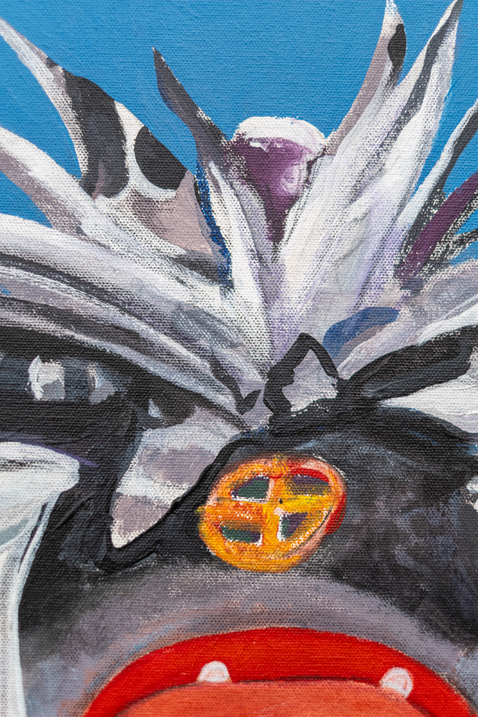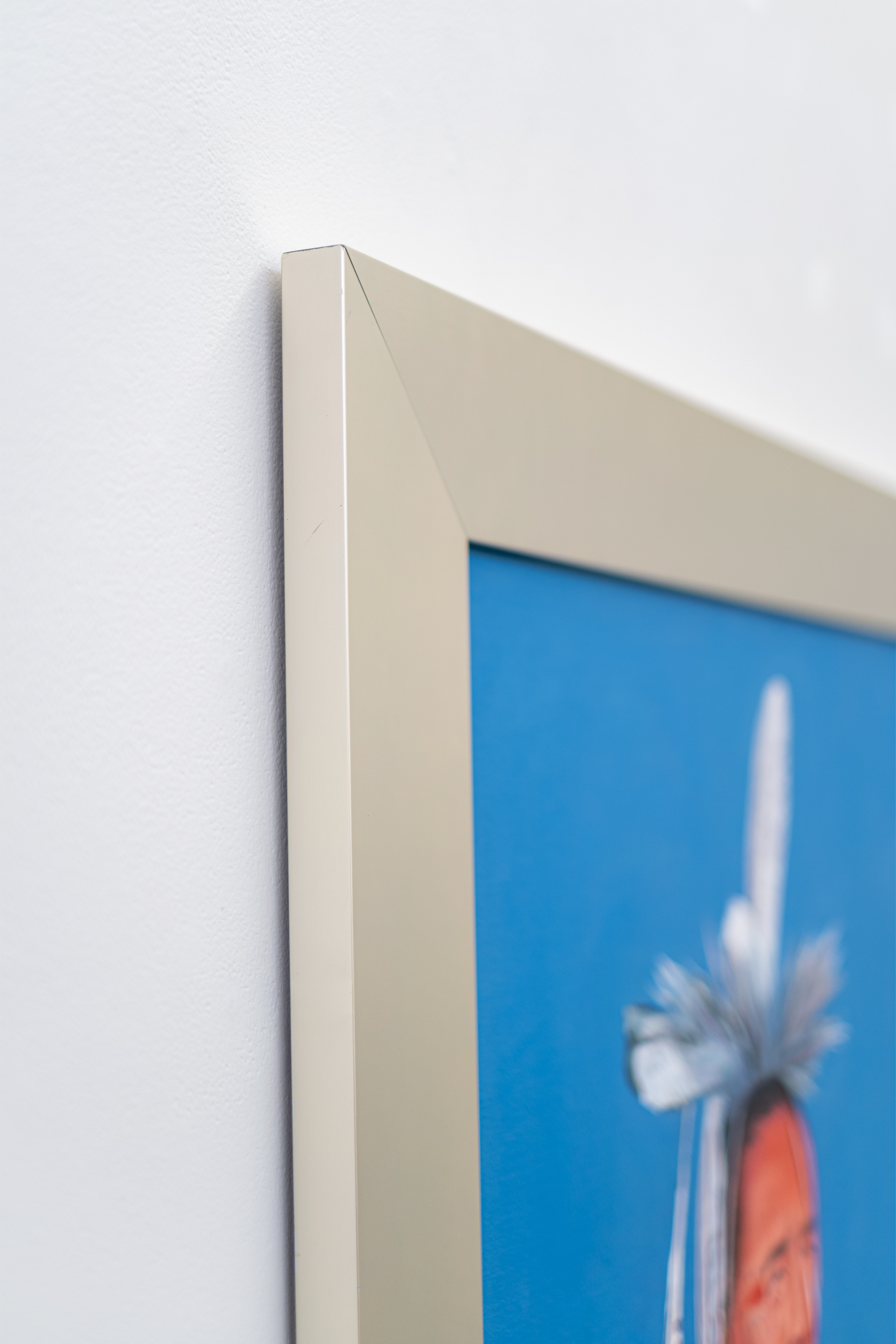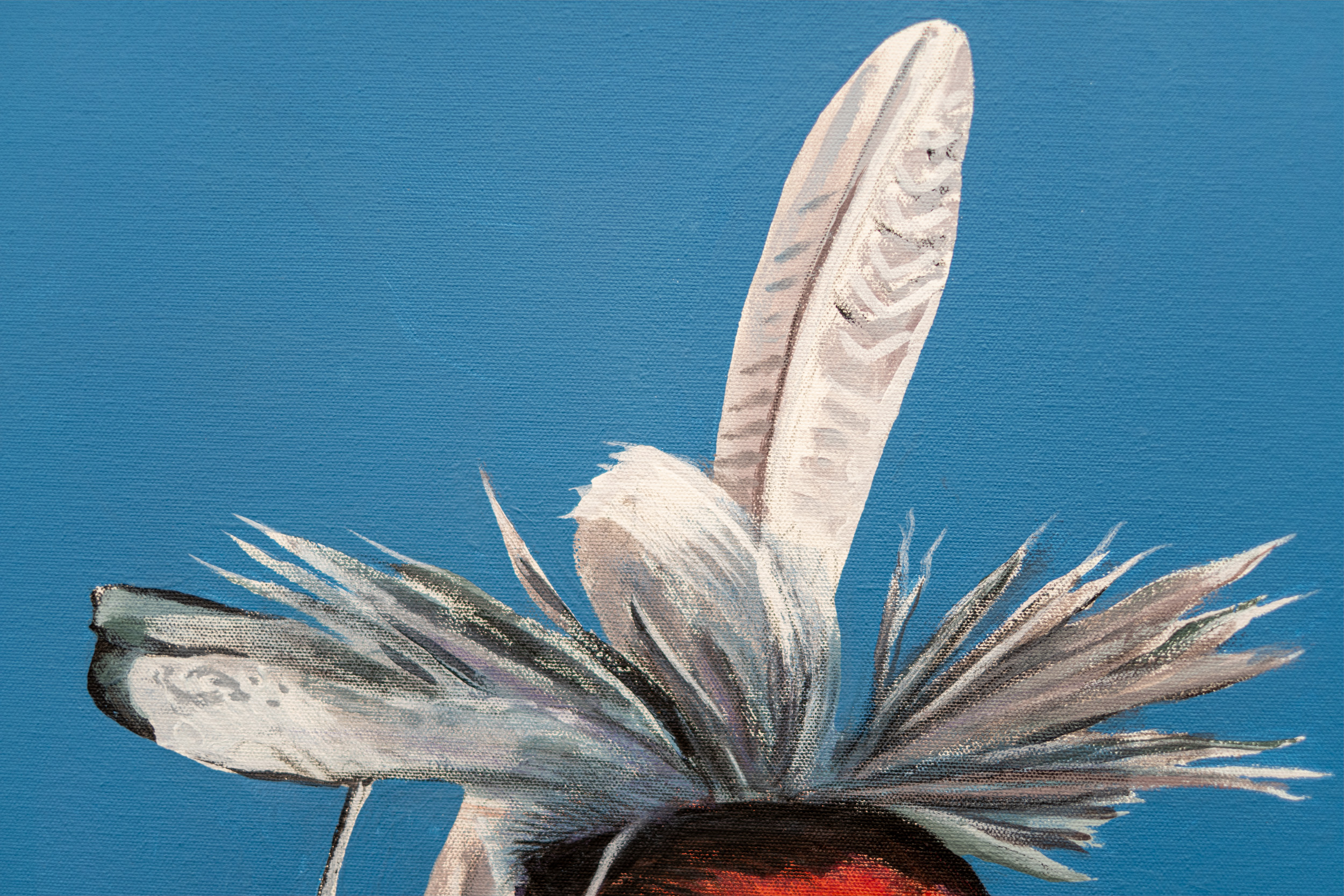 This contemporary painting by Charles Pachter features a historic indigenous figure.Resoundingly Canadian, much loved artistic polymath, Charles Pachter is perhaps best known for his colourful pop art that depicts iconic images like the Canadian flag, the maple leaf, the moose and the Queen. But, he has also created artwork that commemorates significant figures and moments from our nation’s past. This is one of a series of paintings inspired by a famous indigenous chief from the Ojibwe tribe in Ontario named William Yellowhead. Here he is seen in full traditional dress alongside his son, facing the viewer. The colour palette is characteristic of Pachter’s love of bright colours—red, yellow and orange against a deep blue backdrop. Yellowhead was a much respected leader who fought in the War of 1812 alongside both Canadian and British soldiers against invading American armies. He later went on to establish an alliance of three separate Chippewa communities that continues to this day.