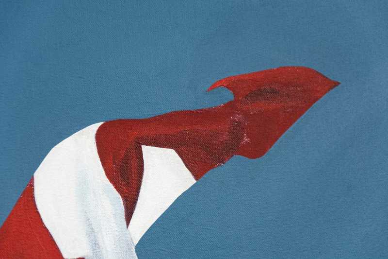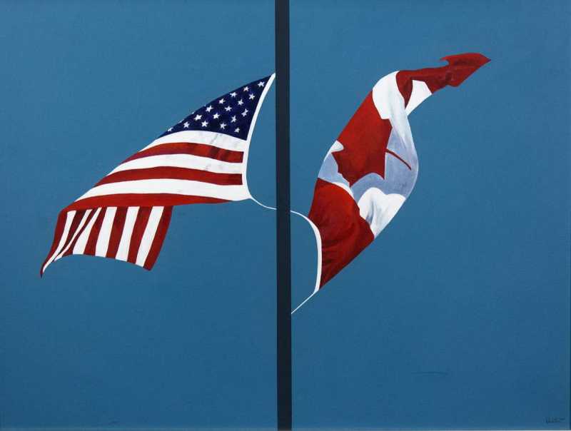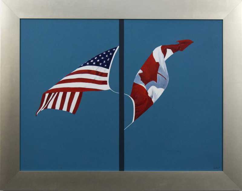 Bold painting of the Canadian and American flags dancing from the same pole on a sky blue ground. This political work speaks to continued friendly relations between neighboring countries. Other similar series of the Canadian and American flags produced by Pachter hang in the Canadian Embassy in Washington, as well as in Canada House in London.In flying the flags from the same pole and placing one below the other, the artist has broken the rules regarding flags for both nations. Pachter is known for merging playful even irreverent elements with deeply iconic imagery.
