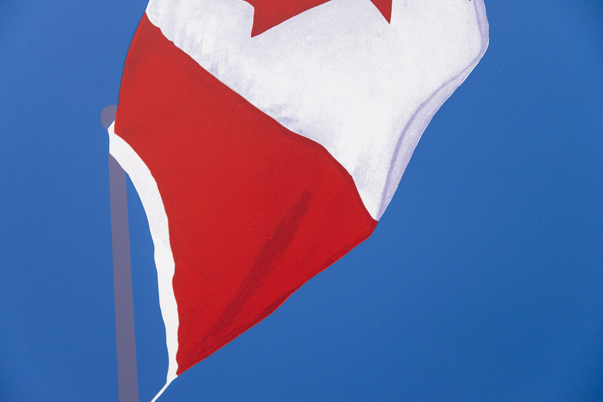Here, the clean, graphic lines of the Canadian flag atop a pole appears to flutter in the breeze. The royal blue background makes the bright red and white of the flag pop. One of a series.