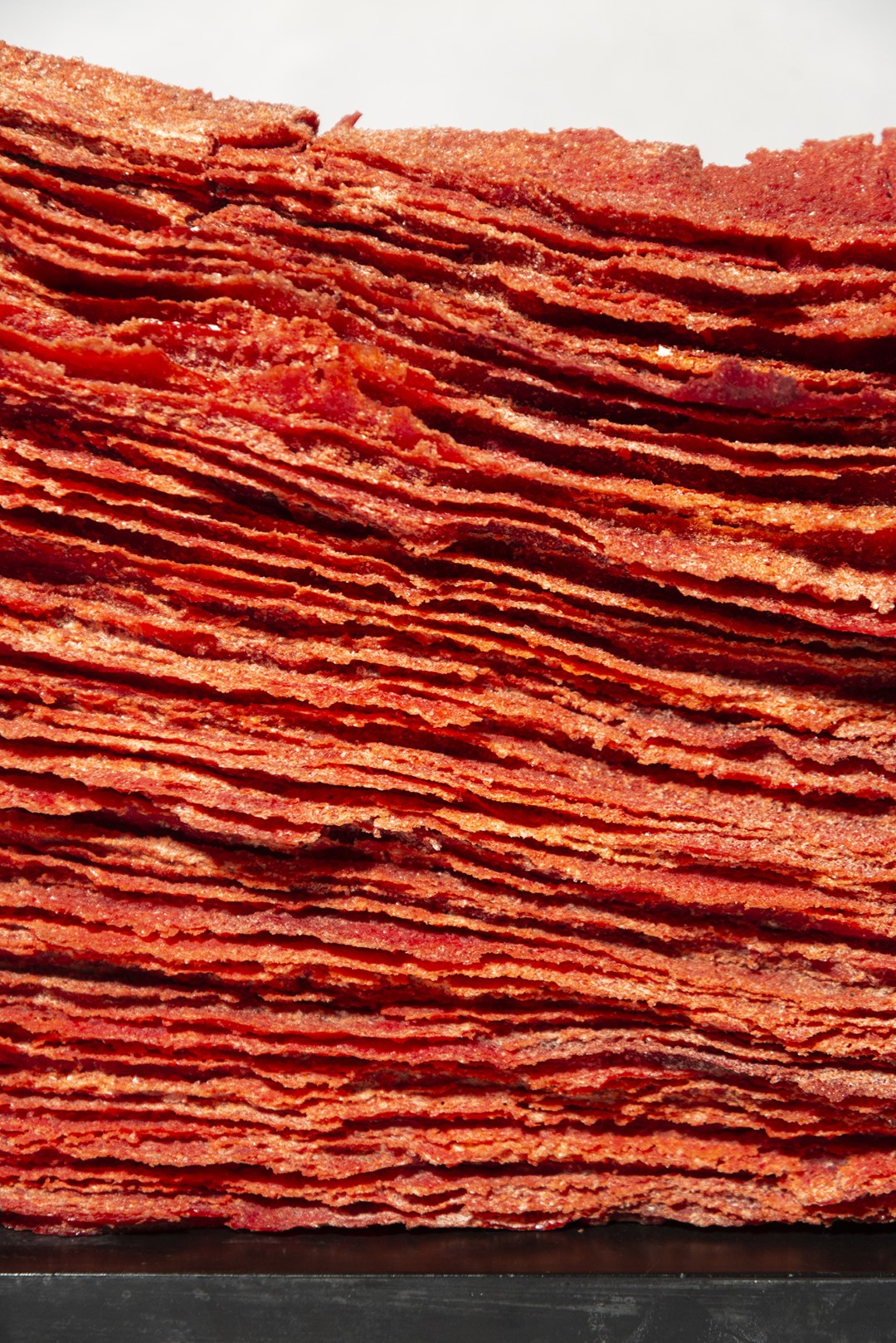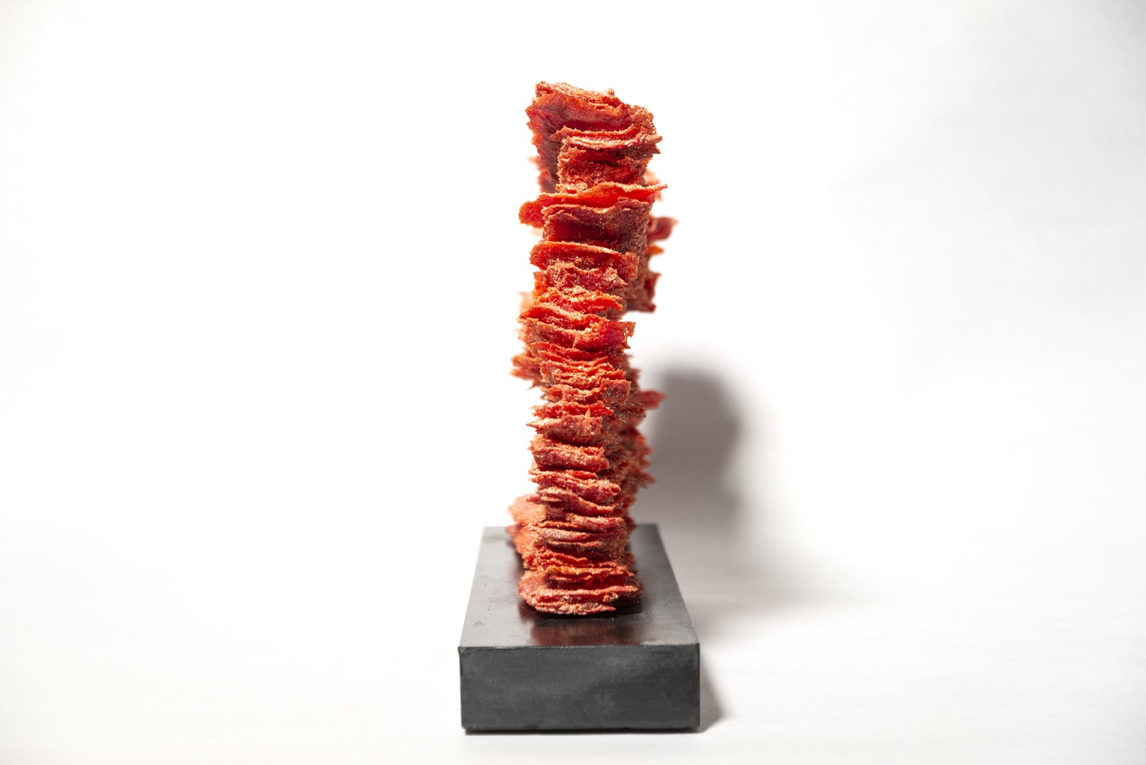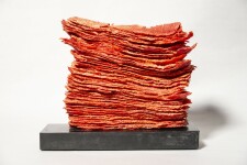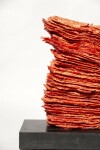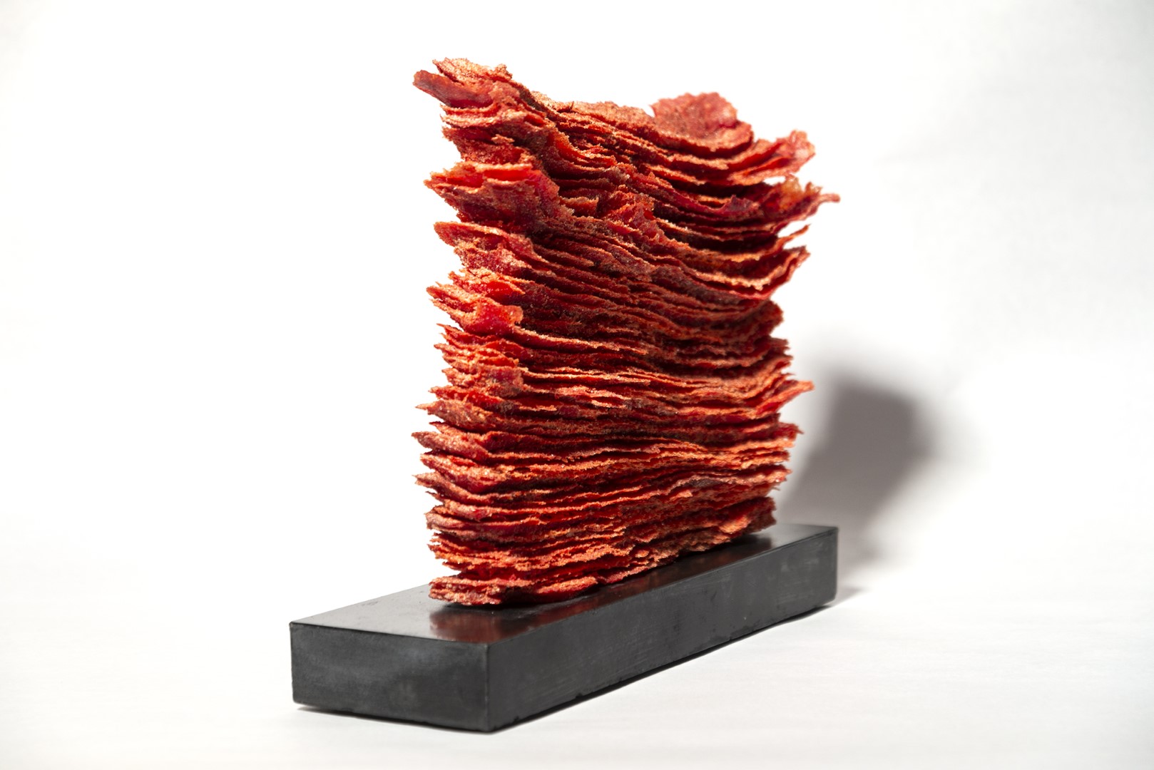This contemporary glass sculpture inspired by nature is designed as a tabletop piece.Cheryl Wilson Smith is an award-winning glass artist who has created a series of stunning sculptures from recycled glass. Their form and textures are inspired by the rugged beauty of her remote Northern Ontario home. This piece, in a bright red, resembles a wall built layer by layer in a narrow rectangular shape. ‘Dearg Mur’ means ‘red wall’ in Gaelic. The sculpture sits on a dark gray base. One of the ‘Boundaries’ series is designed to be ‘an exploration of boundaries…both political and personal.’
