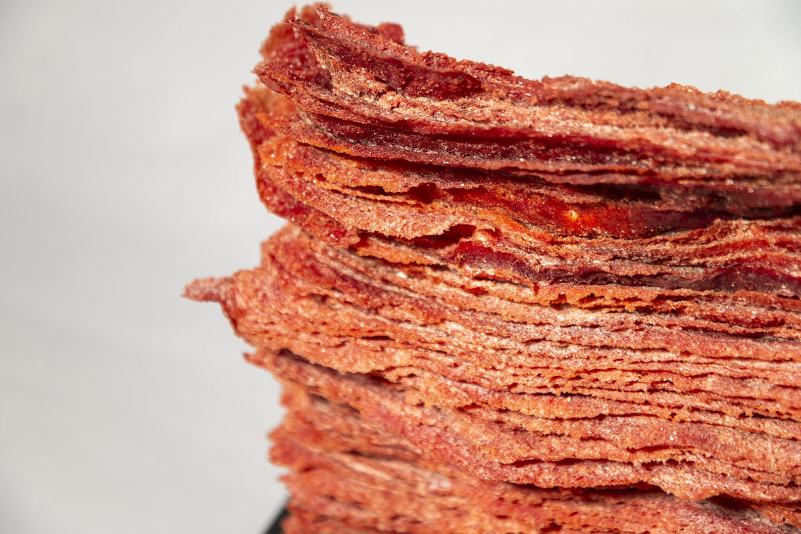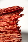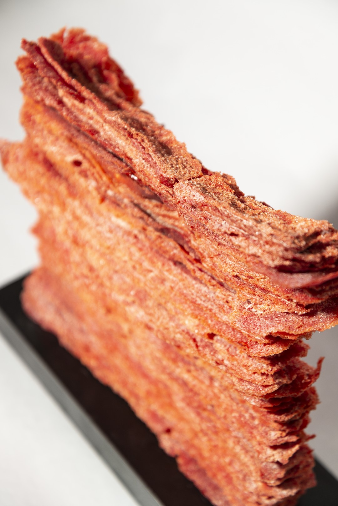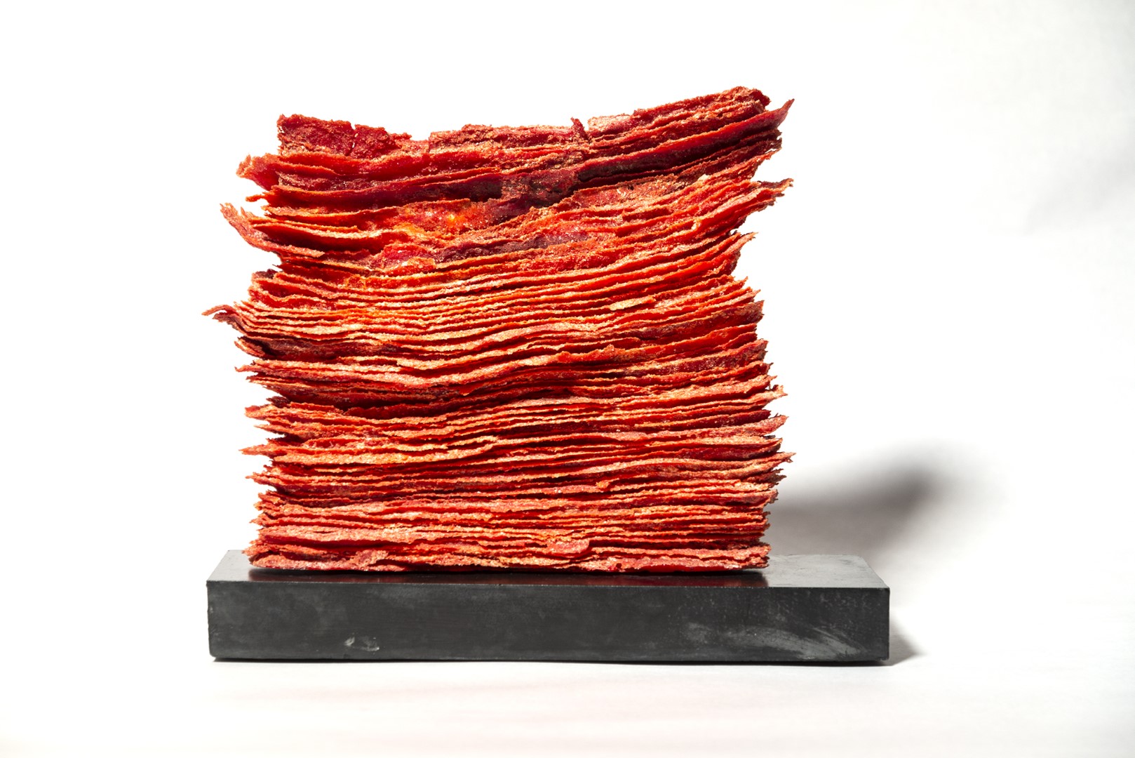 This contemporary glass sculpture inspired by nature is designed as a tabletop piece.Cheryl Wilson Smith is an award-winning glass artist who has created a series of stunning sculptures from recycled glass. Their form and textures are inspired by the rugged beauty of her remote Northern Ontario home. This piece, in a bright red, resembles a wall built layer by layer in a narrow rectangular shape. ‘Dearg Mur’ means ‘red wall’ in Gaelic. The sculpture sits on a dark gray base. One of the ‘Boundaries’ series is designed to be ‘an exploration of boundaries…both political and personal.’