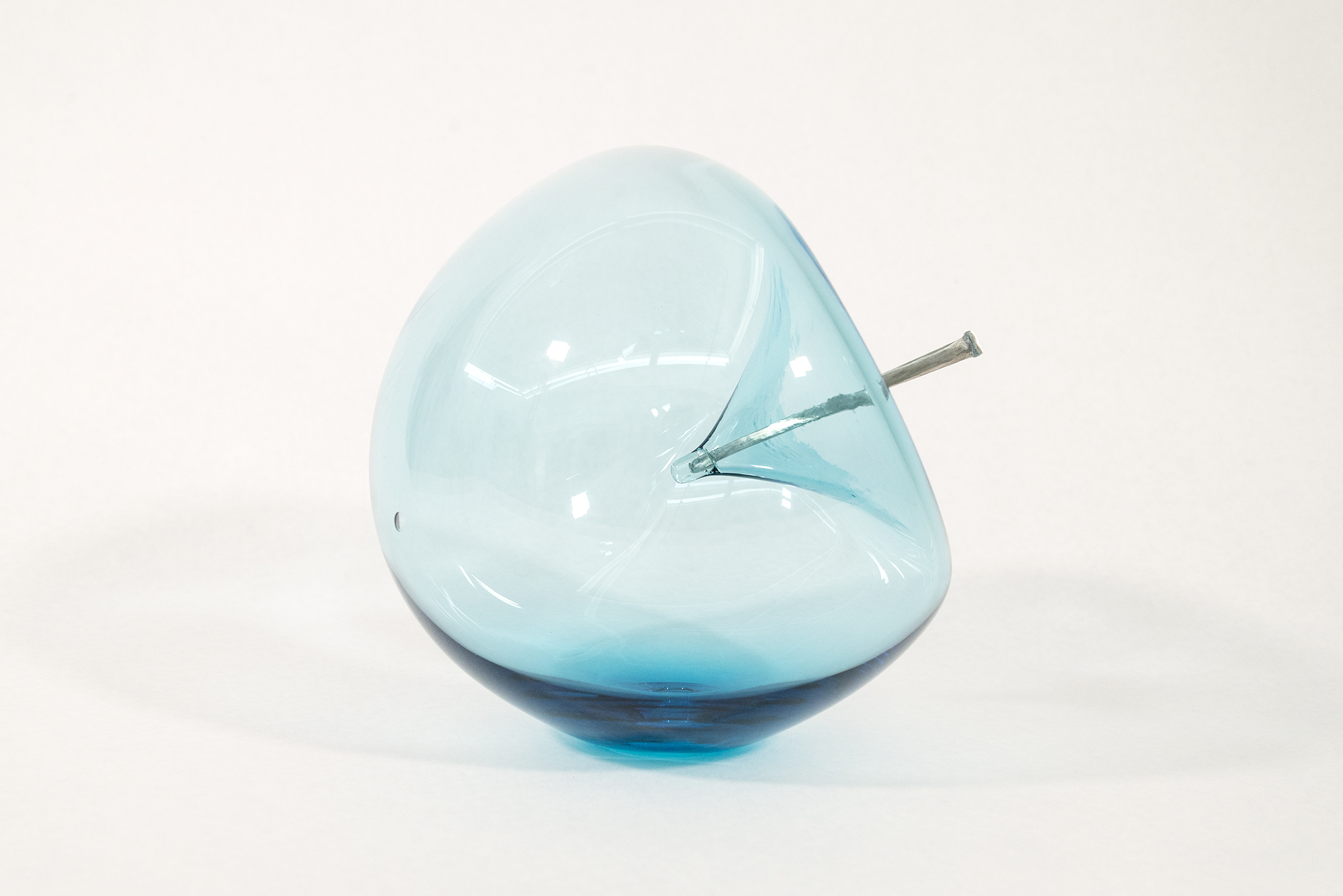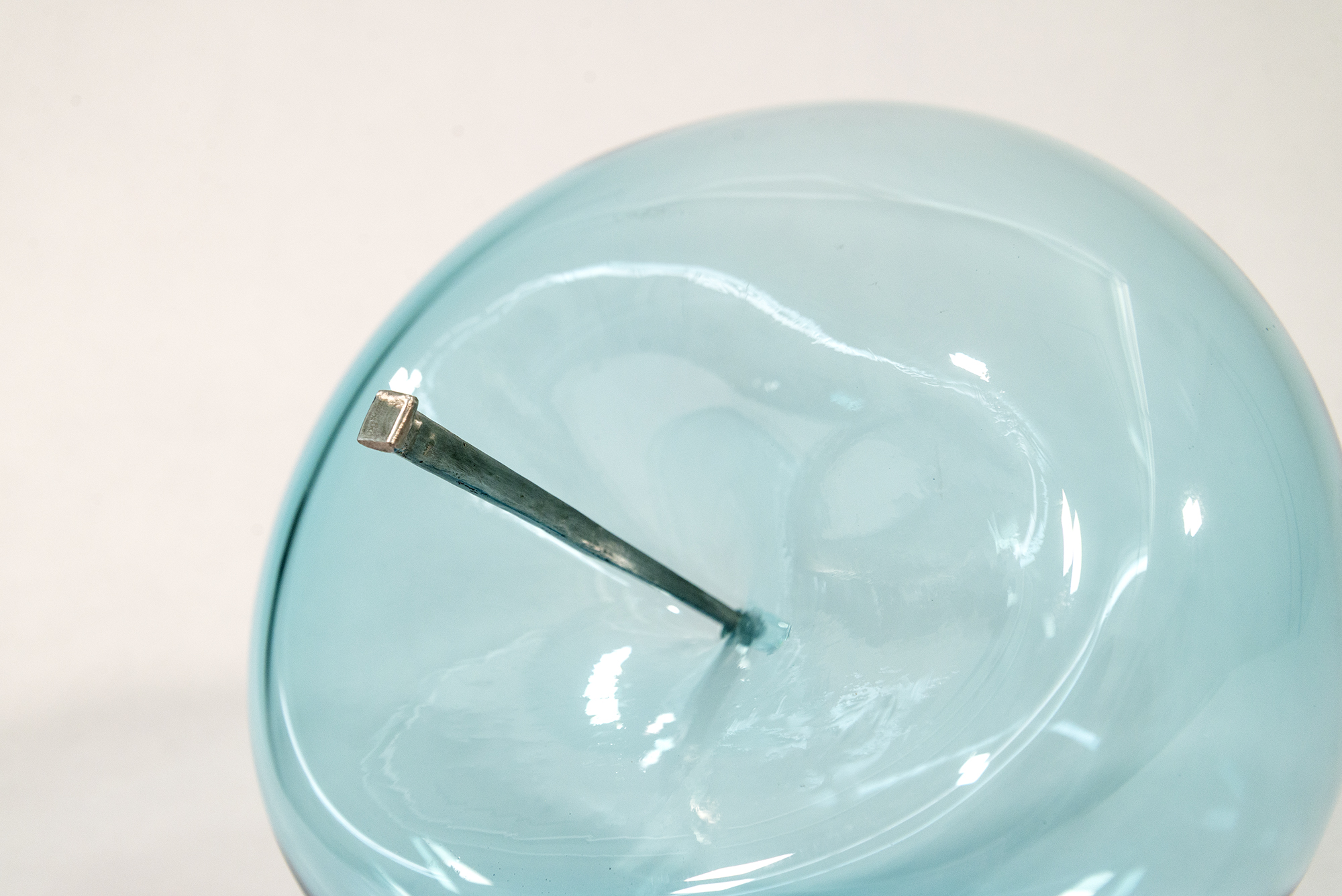 A single ‘bubble’ of translucent blue glass appears deflated and pierced by an iron nail. Light naturally reflects off of and shines through the glass, so it appears to glow from within.