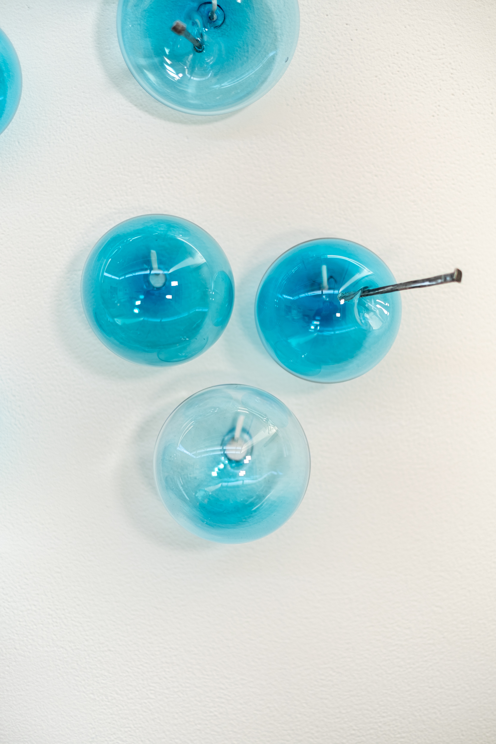 This contemporary wall sculpture features bubbles of blue glass.Cheryl Wilson Smith is known for her uniquely beautiful glasswork—its form, colour and texture is often inspired by the rugged natural beauty of her home and studio in northern Ontario. This current series explores a different narrative that symbolizes life’s joys and challenges. The elegant composition features fourteen clear turquoise-blue blown glass bubbles; some inflated, others deflated and pierced by iron nails arranged in a cascading pattern. Light naturally shines through the glass forming shadows as the bubbles appear to float on the wall. The title refers to a popular colloquial expression.