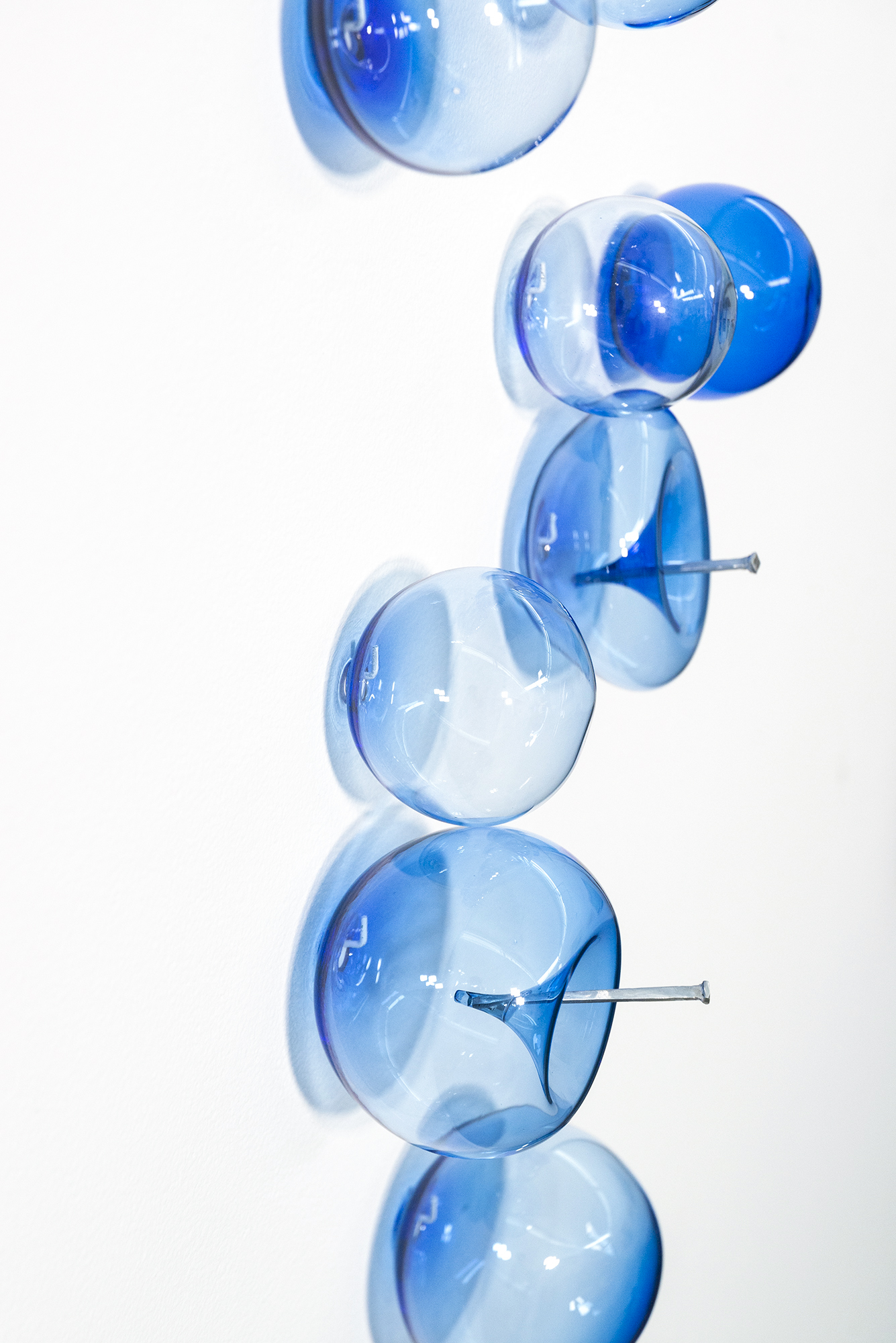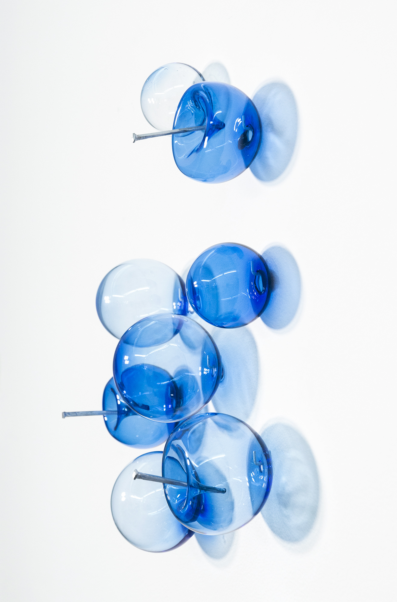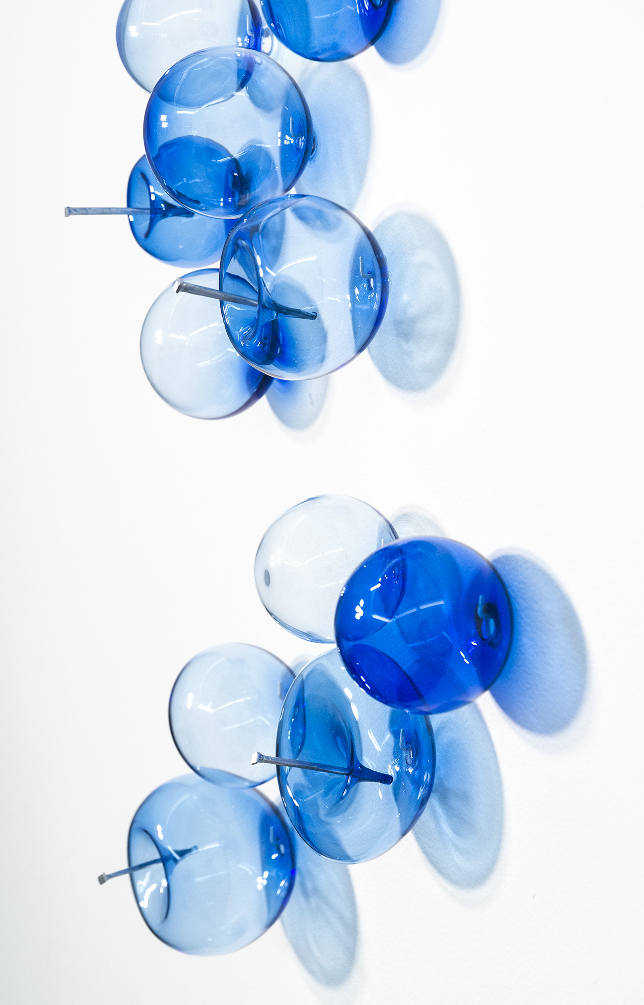 The elegant vertical composition features fourteen cerulean-colored blown glass bubbles; some inflated, others deflated and pierced by iron nails arranged in a cascading pattern.