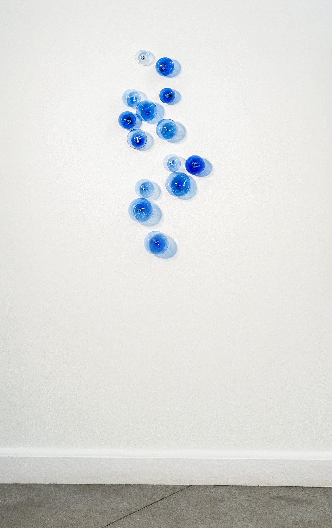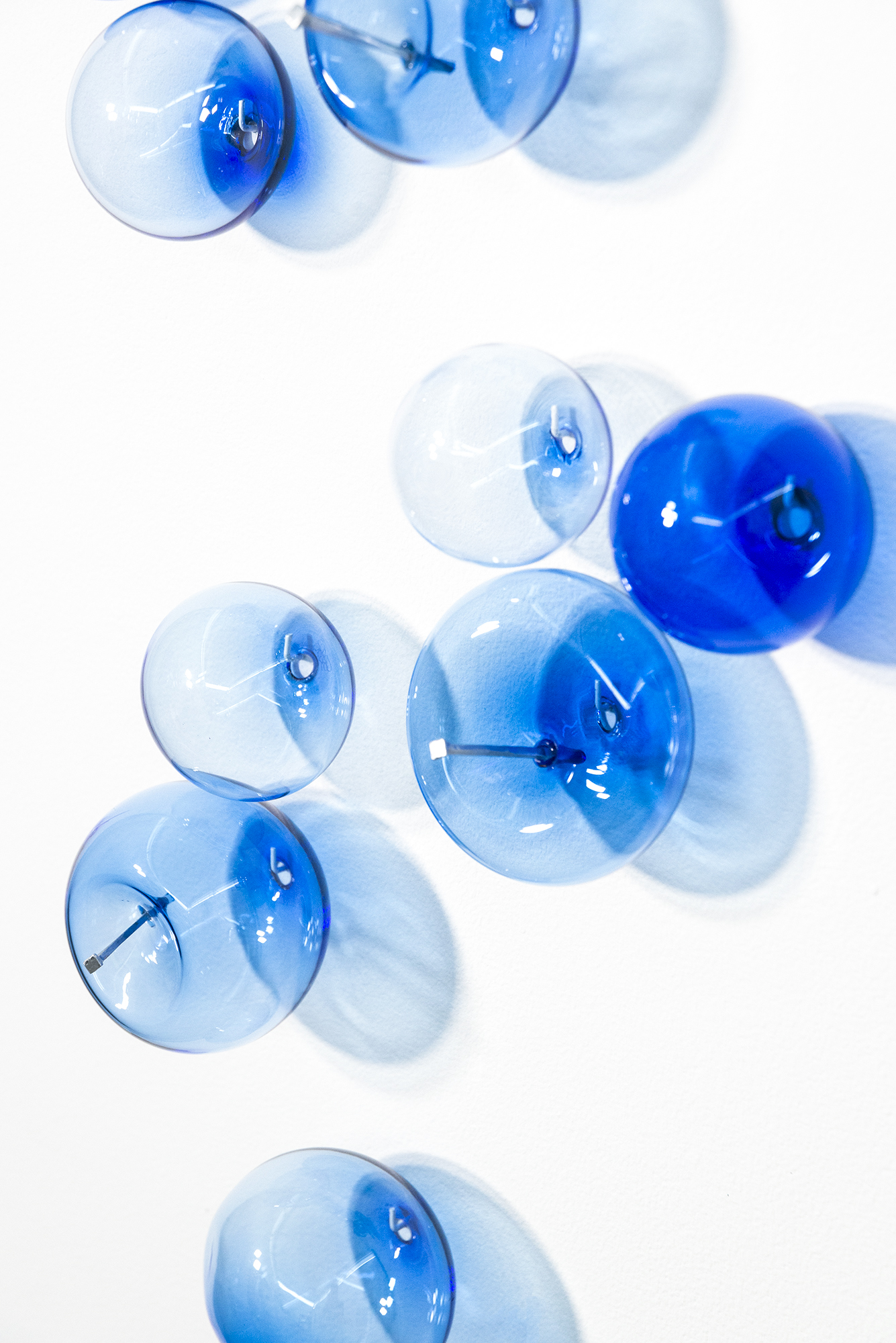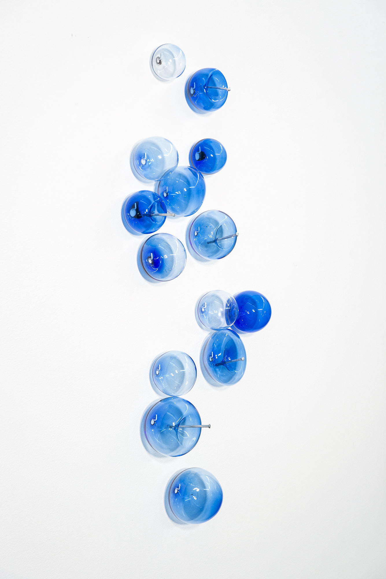 The elegant vertical composition features fourteen cerulean-colored blown glass bubbles; some inflated, others deflated and pierced by iron nails arranged in a cascading pattern.