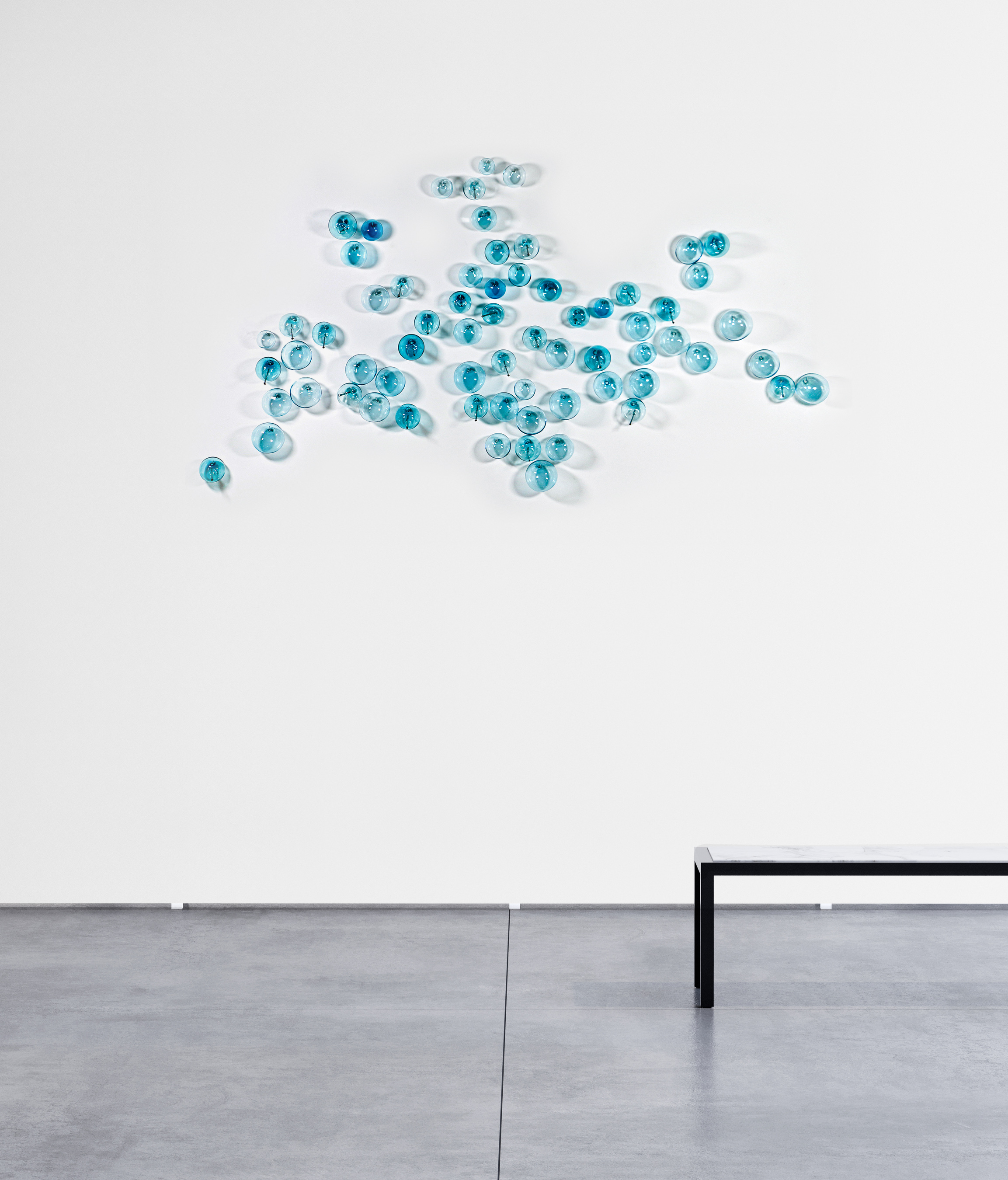 This current series explores a different narrative that symbolizes life’s joys and challenges. The elegant composition features dozens of copper blue-colored glass bubbles; some inflated, others slightly deflated and pierced by iron nails arranged in a lyrical wave-like pattern. Light naturally shines through the glass, forming shadows as the bubbles appear to float on the wall. The title refers to a popular colloquial expression.