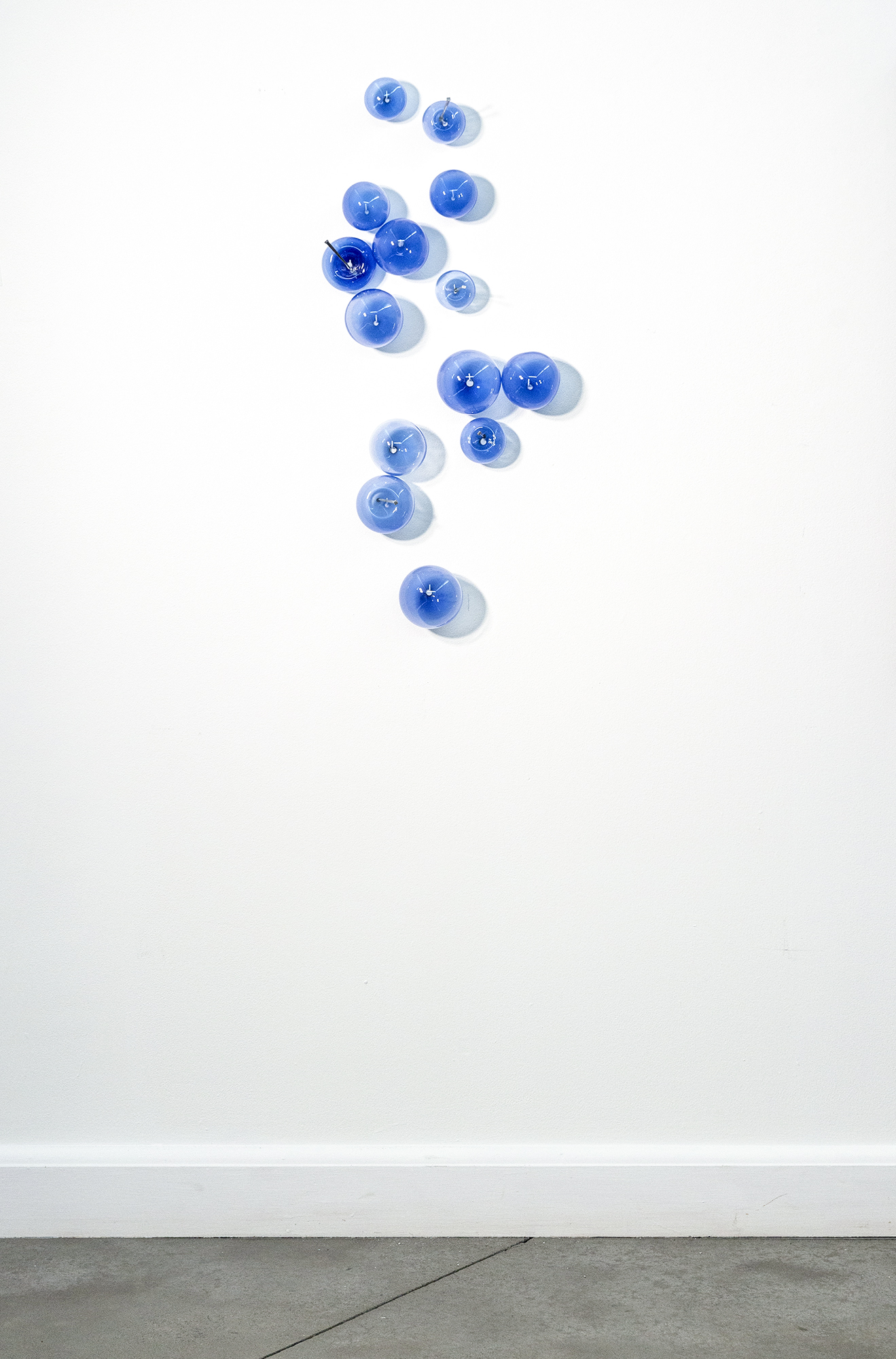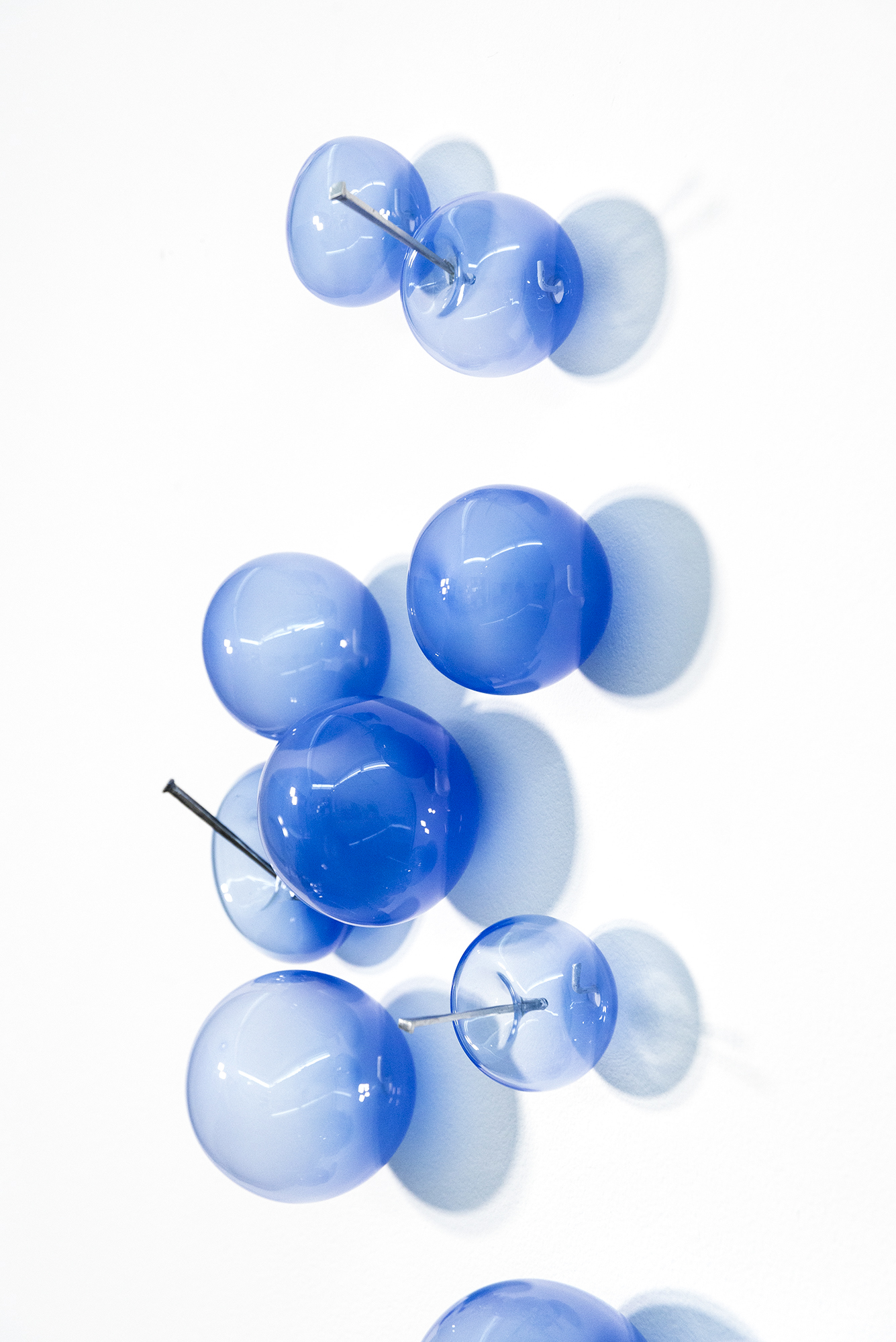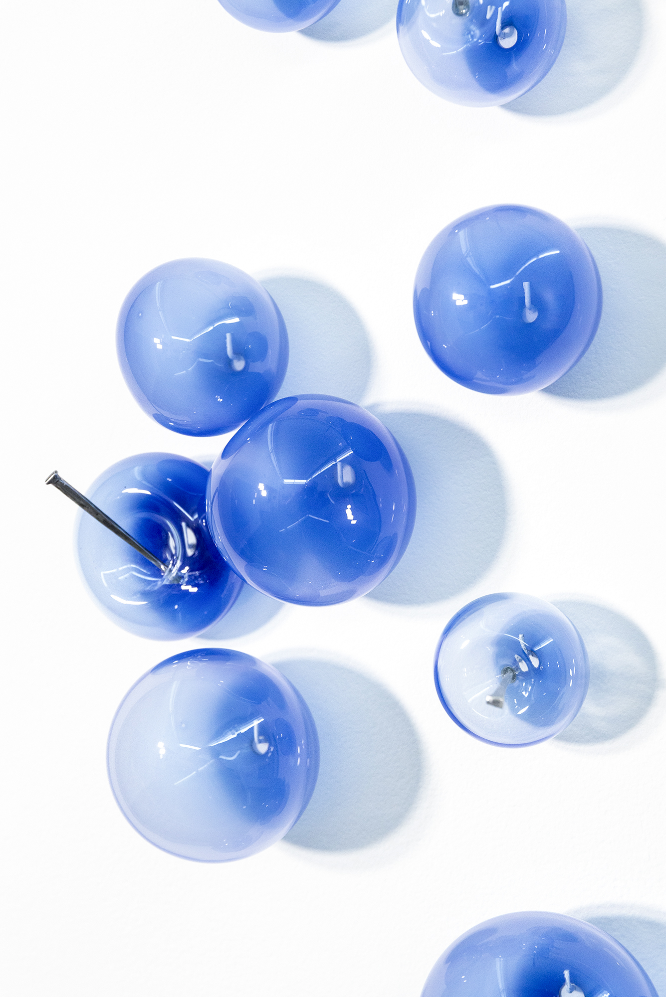 This contemporary wall sculpture features bubbles of lapis blue glass.Cheryl Wilson Smith is known for her uniquely beautiful glasswork—its form, colour and texture is often inspired by the rugged natural beauty of her home and studio in northern Ontario. This current series explores a different narrative that symbolizes life’s joys and challenges. The elegant composition features fourteen lapis-blue blown glass bubbles; some inflated, others deflated and pierced by iron nails arranged in a cascading pattern. Light naturally shines through the glass forming shadows as the bubbles appear to float on the wall. The title refers to a popular colloquial expression.