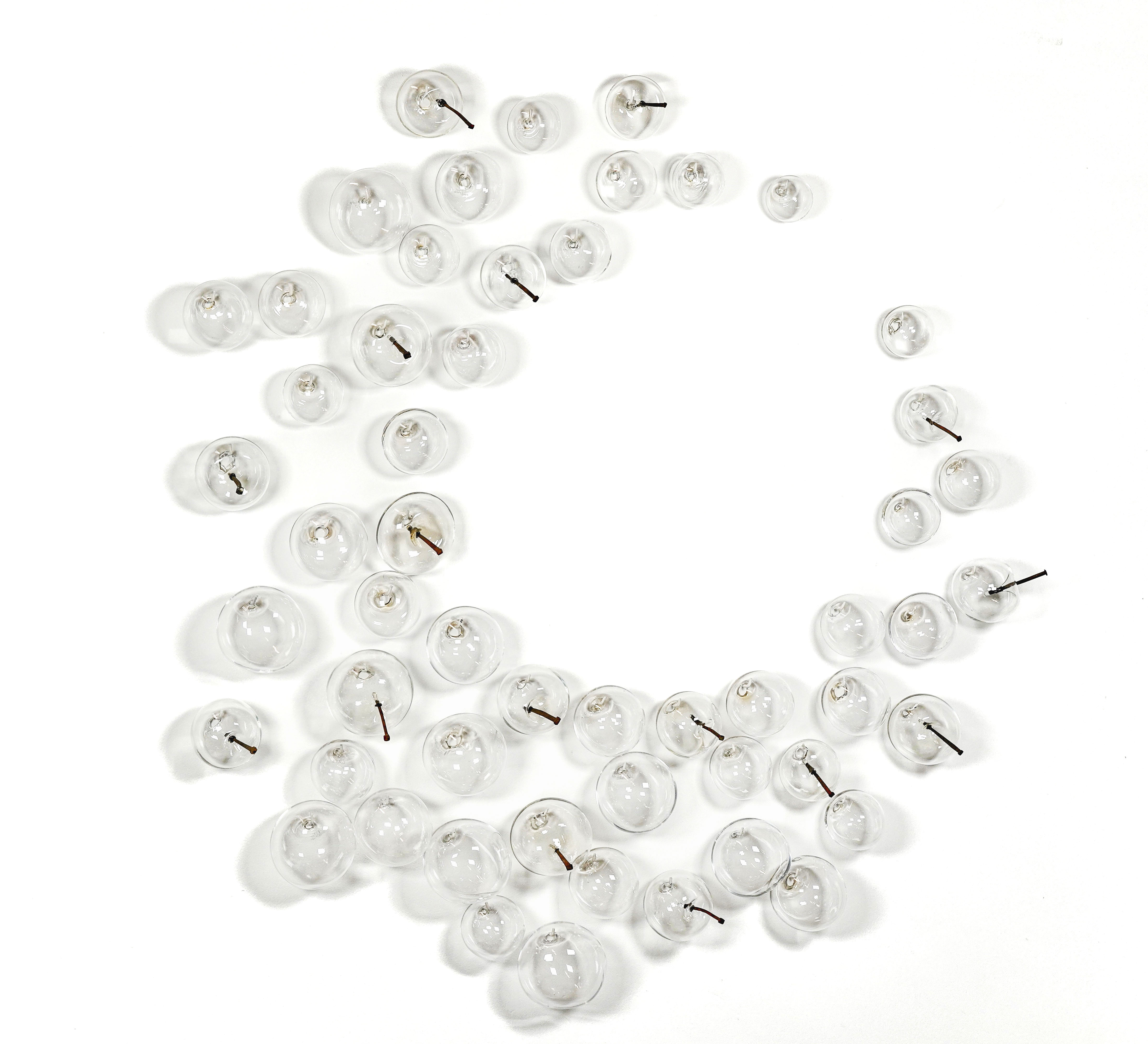 The elegant composition features more than fifty clear blown glass bubbles; some inflated, others deflated and pierced by iron nails arranged in a semi-circular pattern. Light naturally shines through the glass, forming shadows as the bubbles appear to float on the wall. The title refers to a popular colloquial expression.