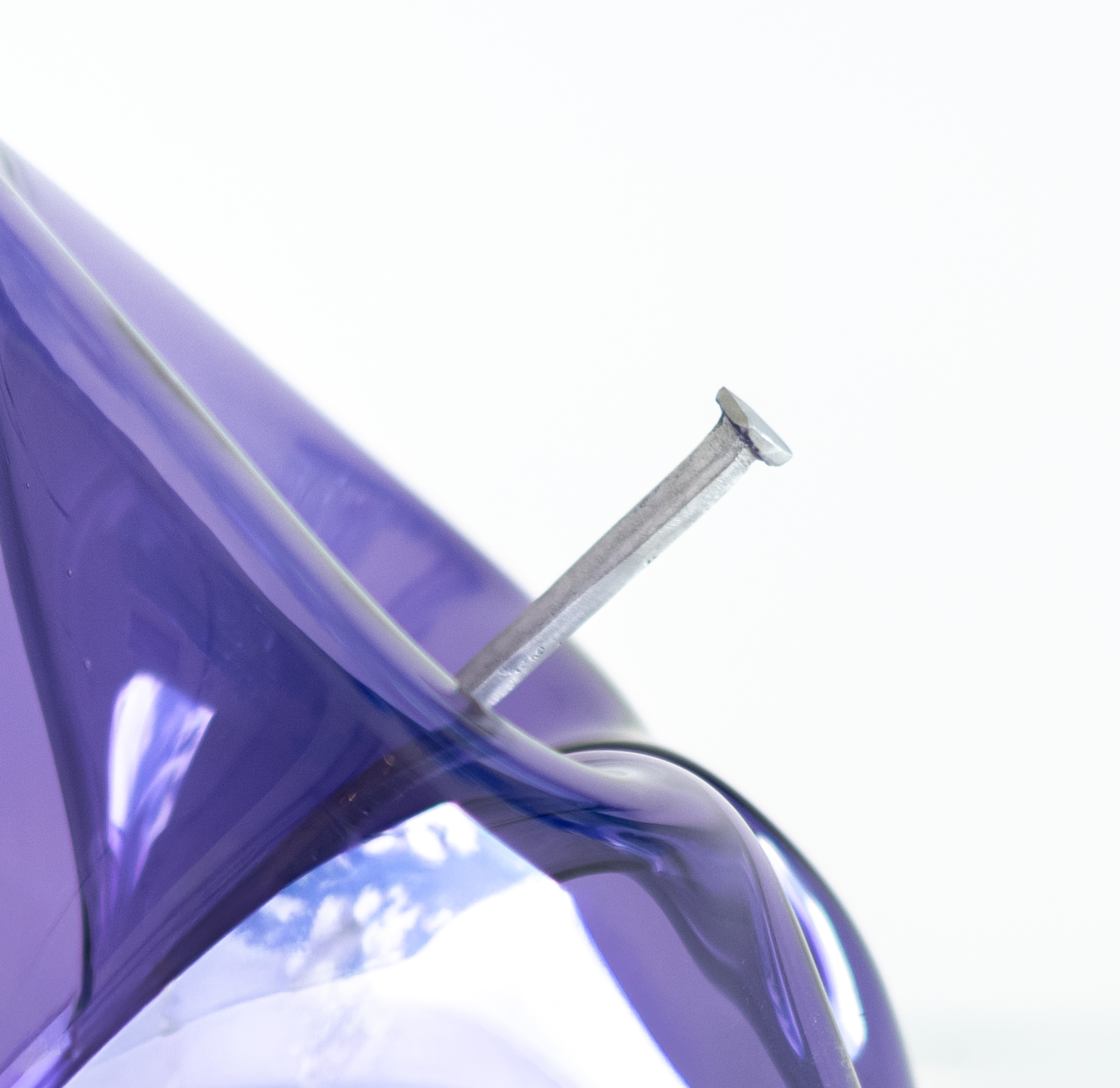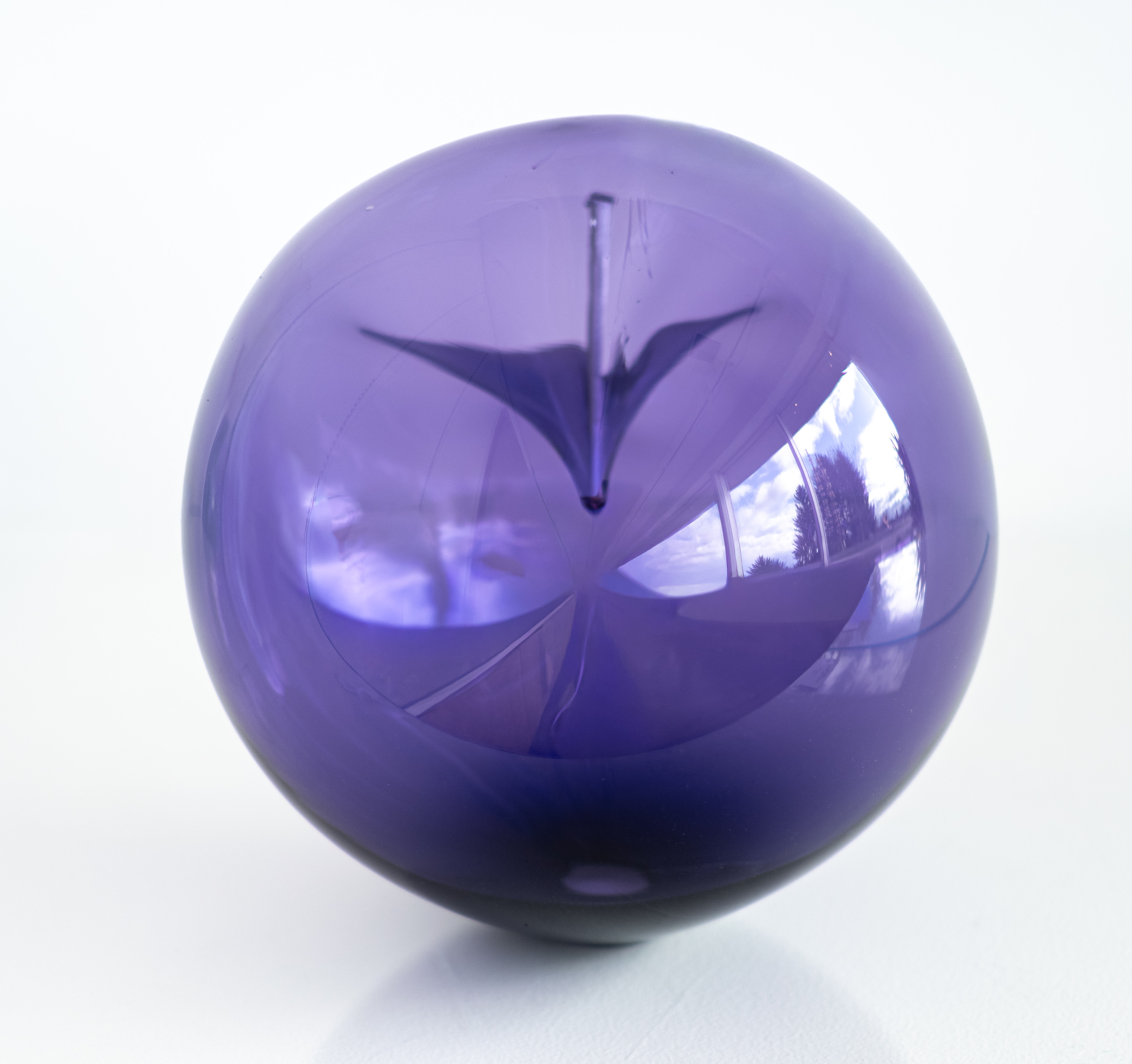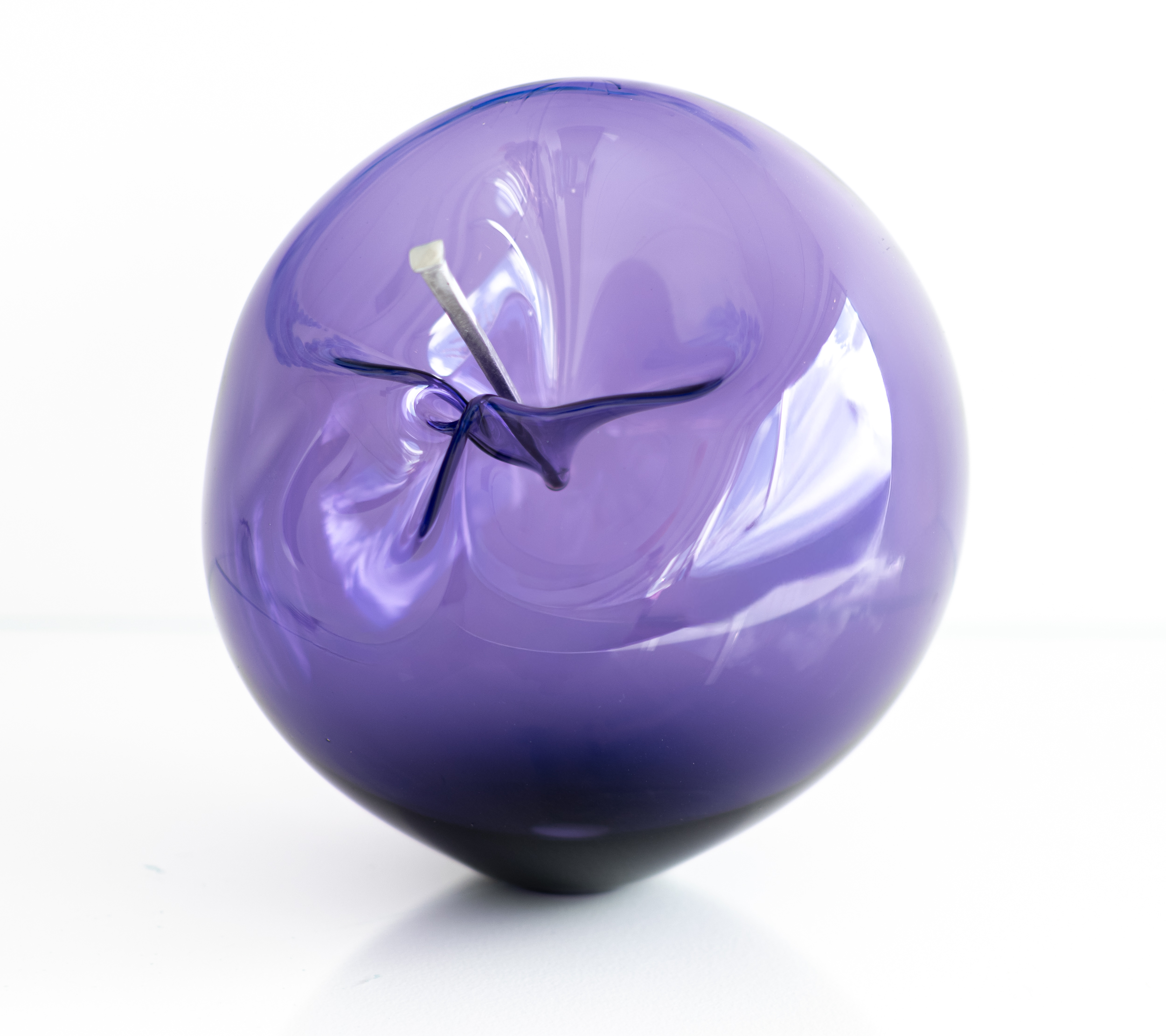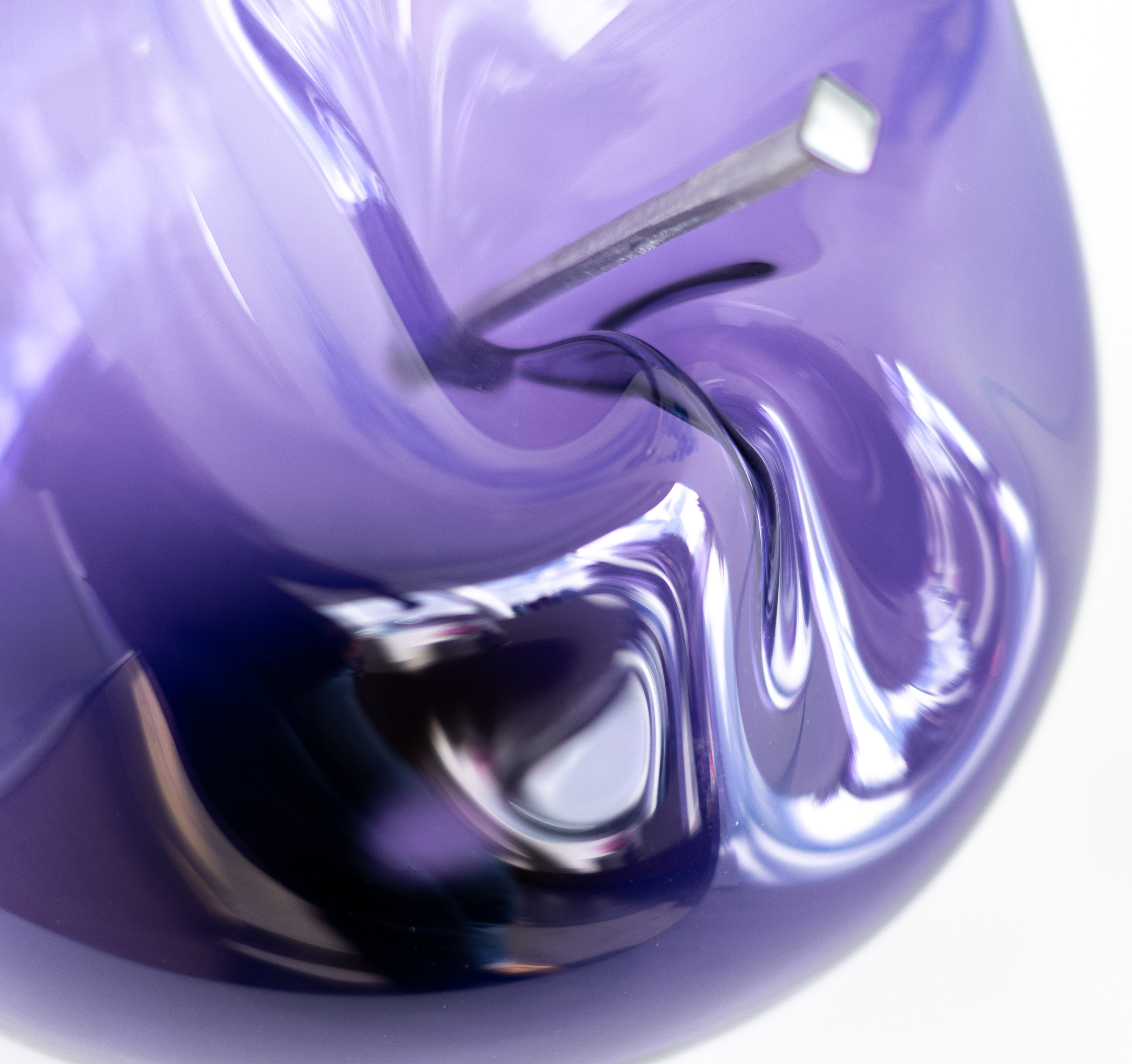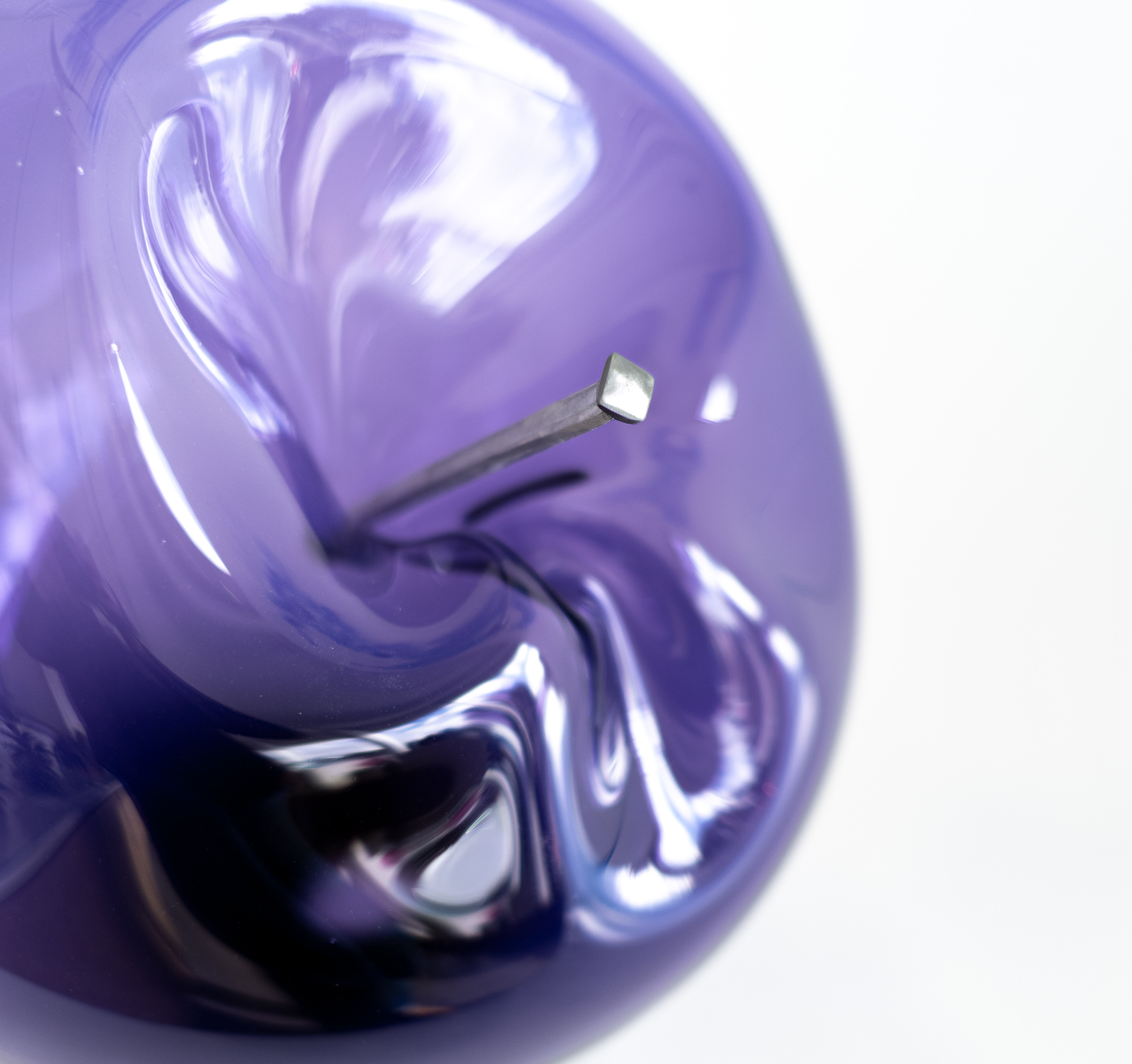 This contemporary purple glass tabletop sculpture is by Cheryl Wilson Smith.Cheryl Wilson Smith is known for her uniquely beautiful glass work—its form, colour and texture are often inspired by the rugged natural beauty of her home and studio in northern Ontario. This current series explores a different narrative that symbolizes life’s joys and challenges. A single ‘bubble’ of translucent purple glass appears deflated and pierced by a metal nail. Light naturally reflects off of and shines through the glass, so it appears to glow from within. The title refers to a popular colloquial expression.