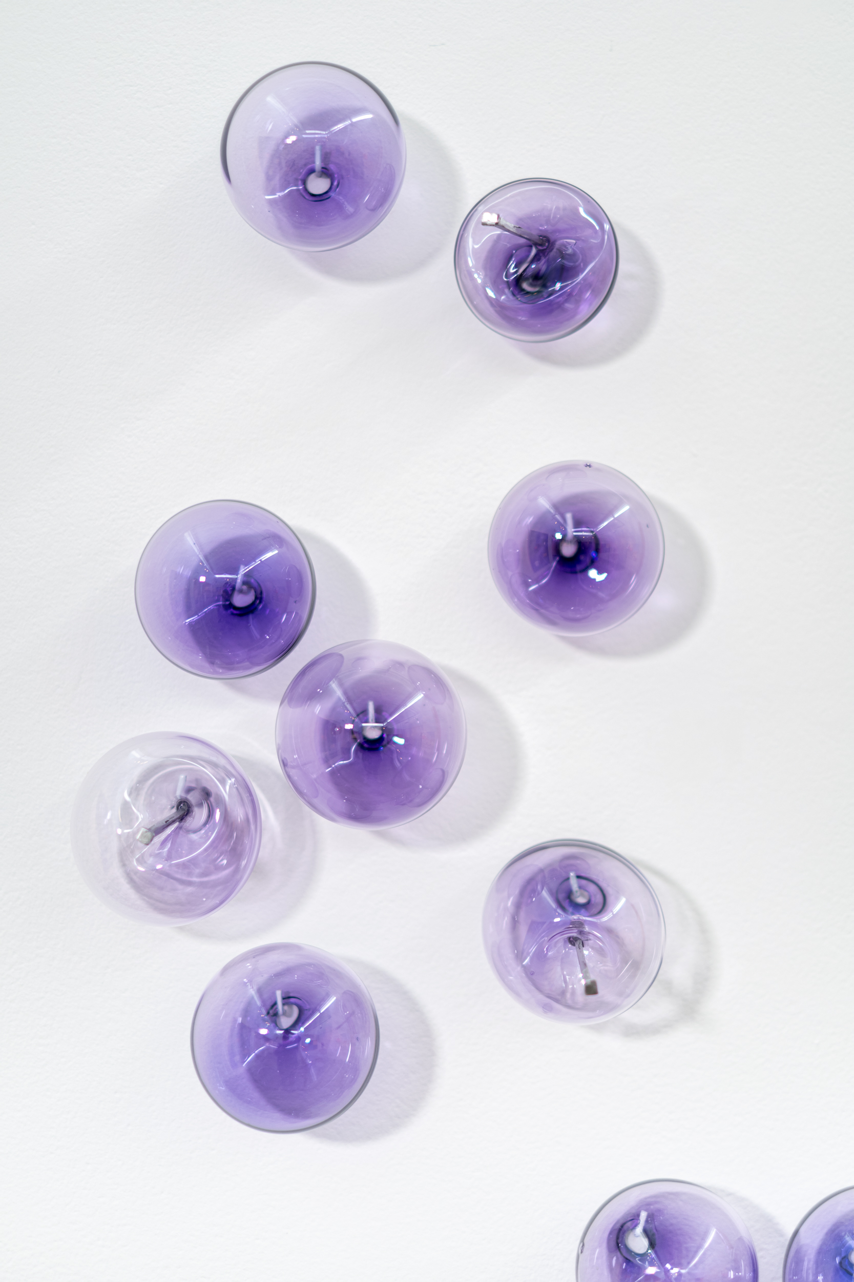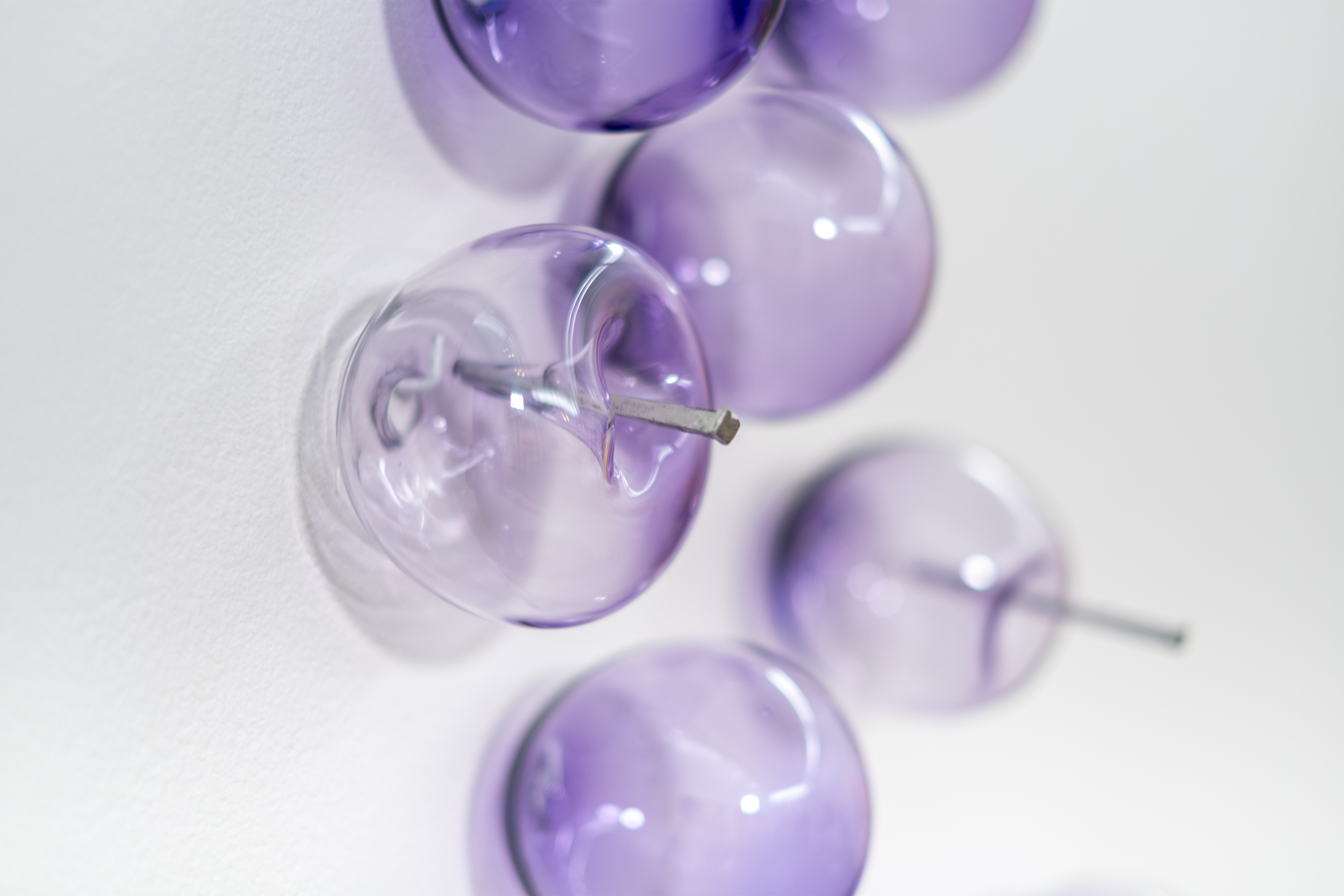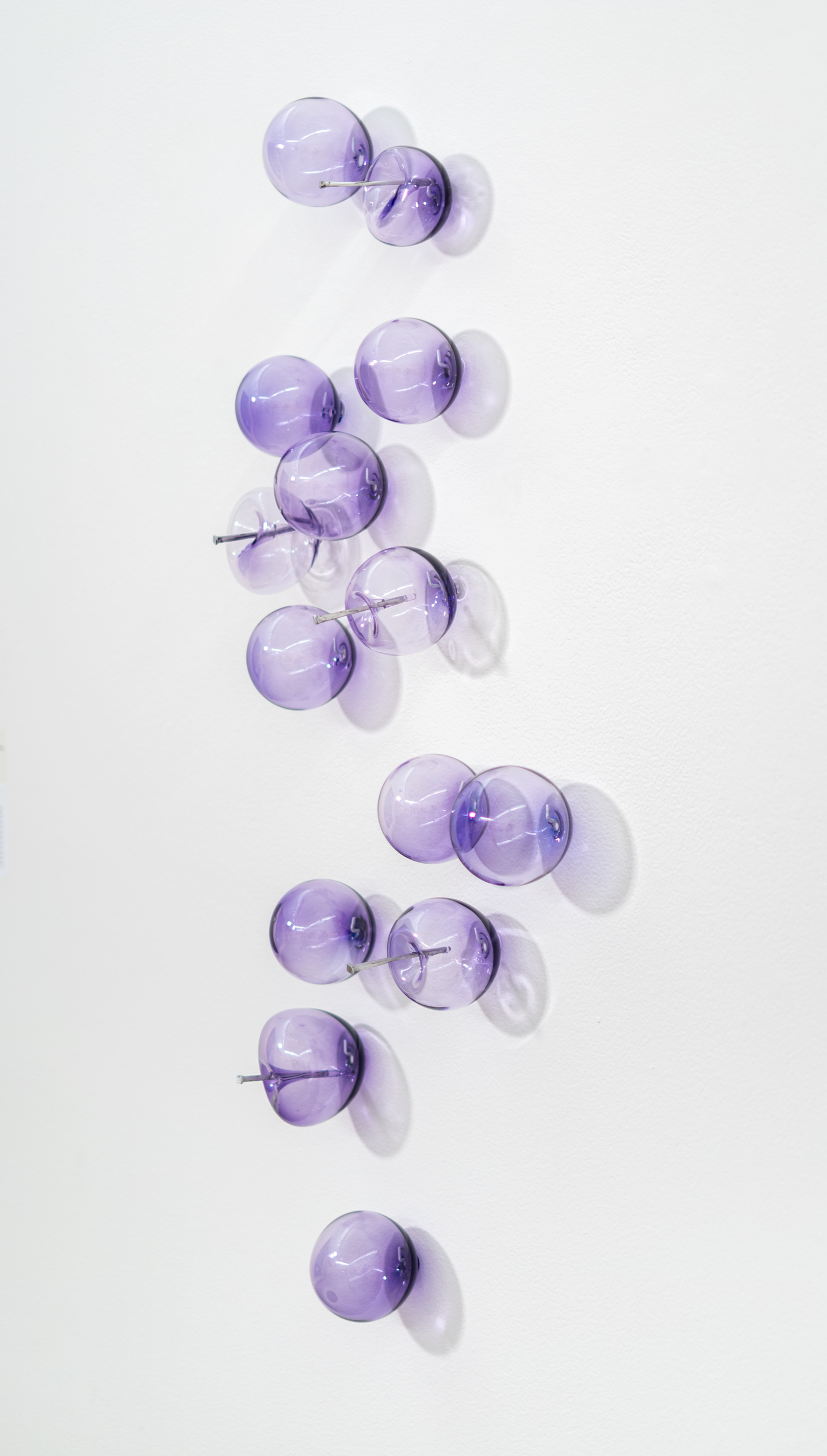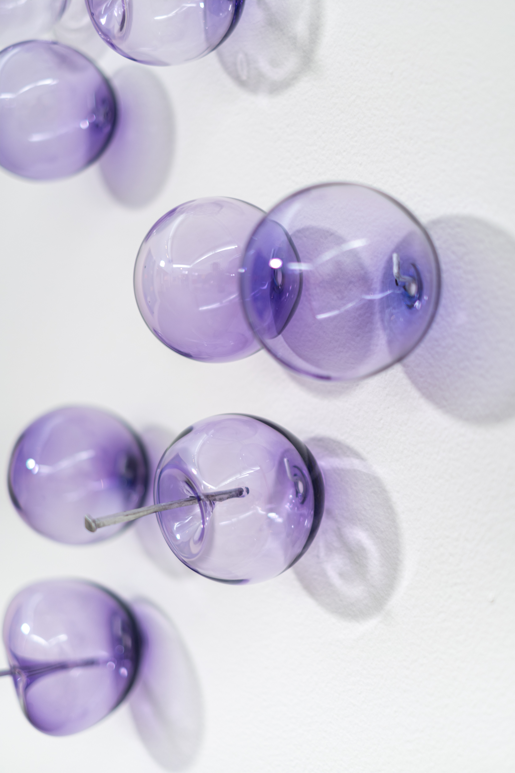 The elegant vertical composition features fourteen purple-colored blown glass bubbles; some inflated, others deflated and pierced by iron nails arranged in a cascading pattern.