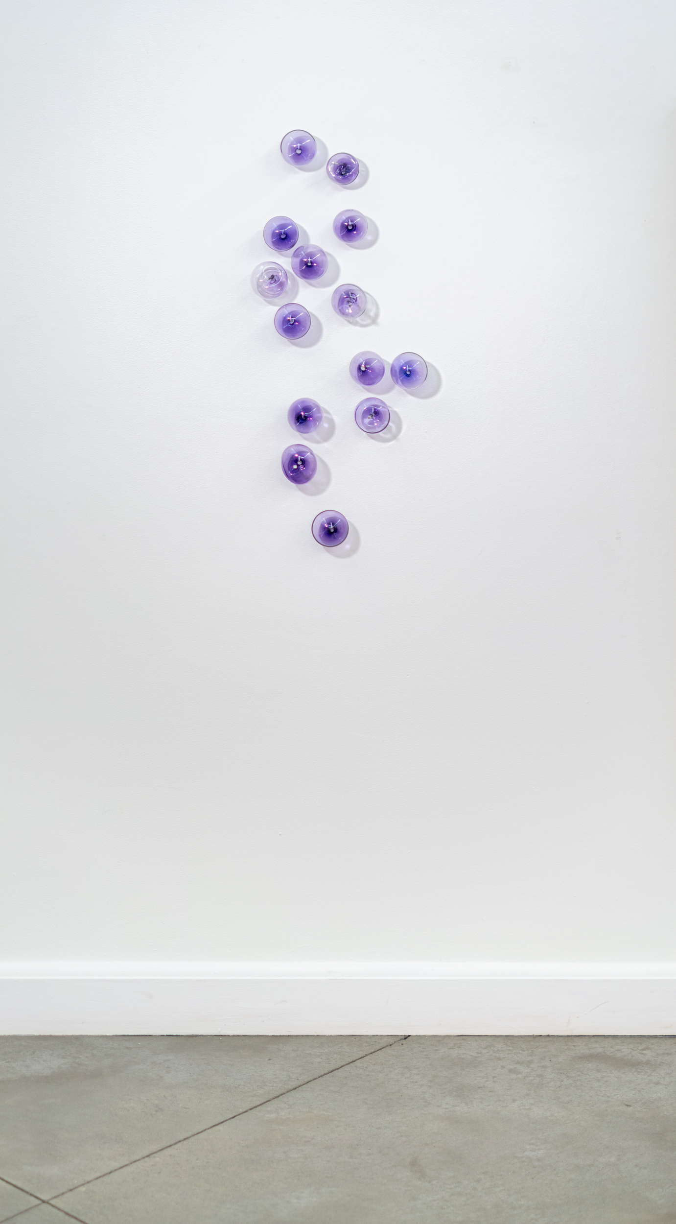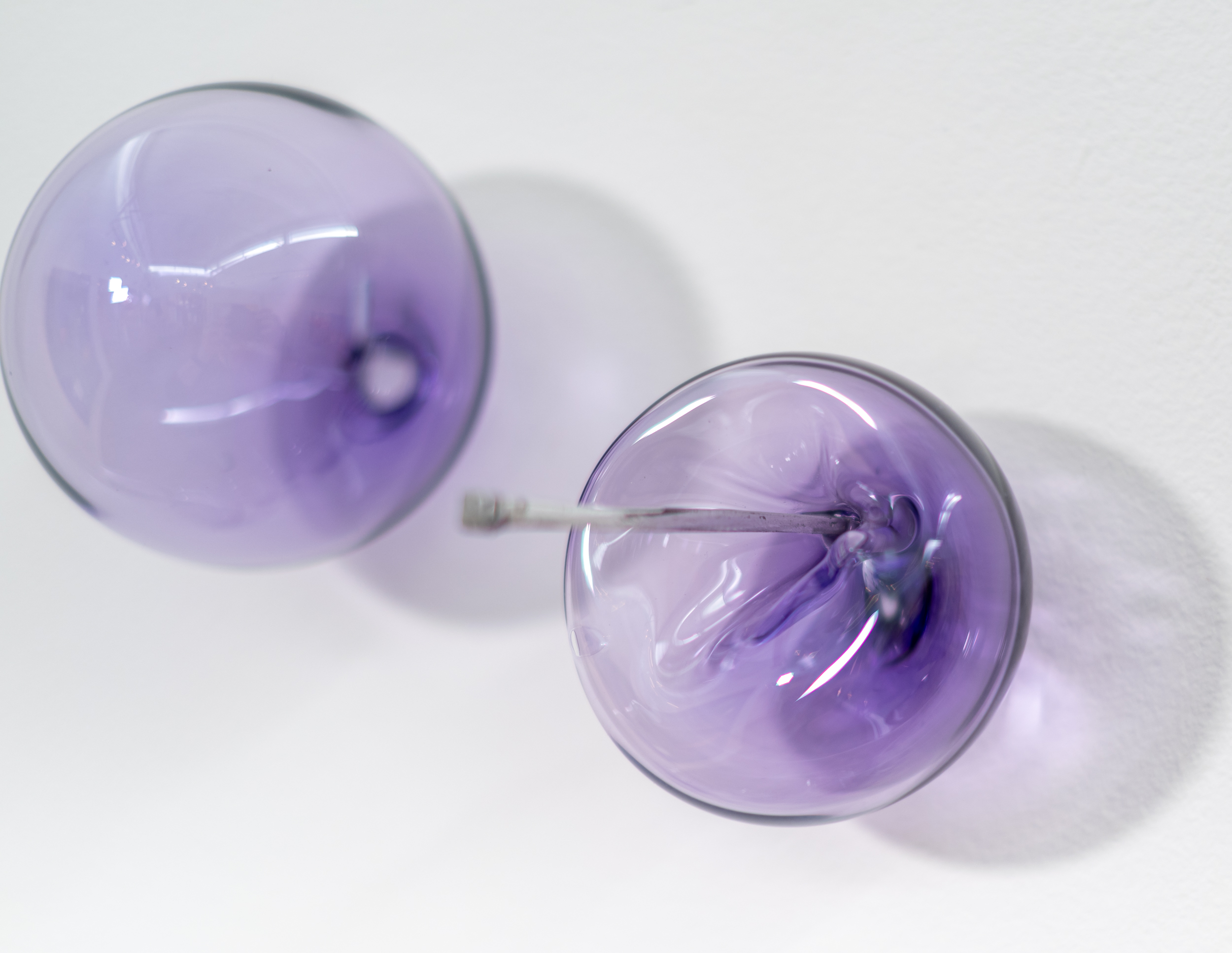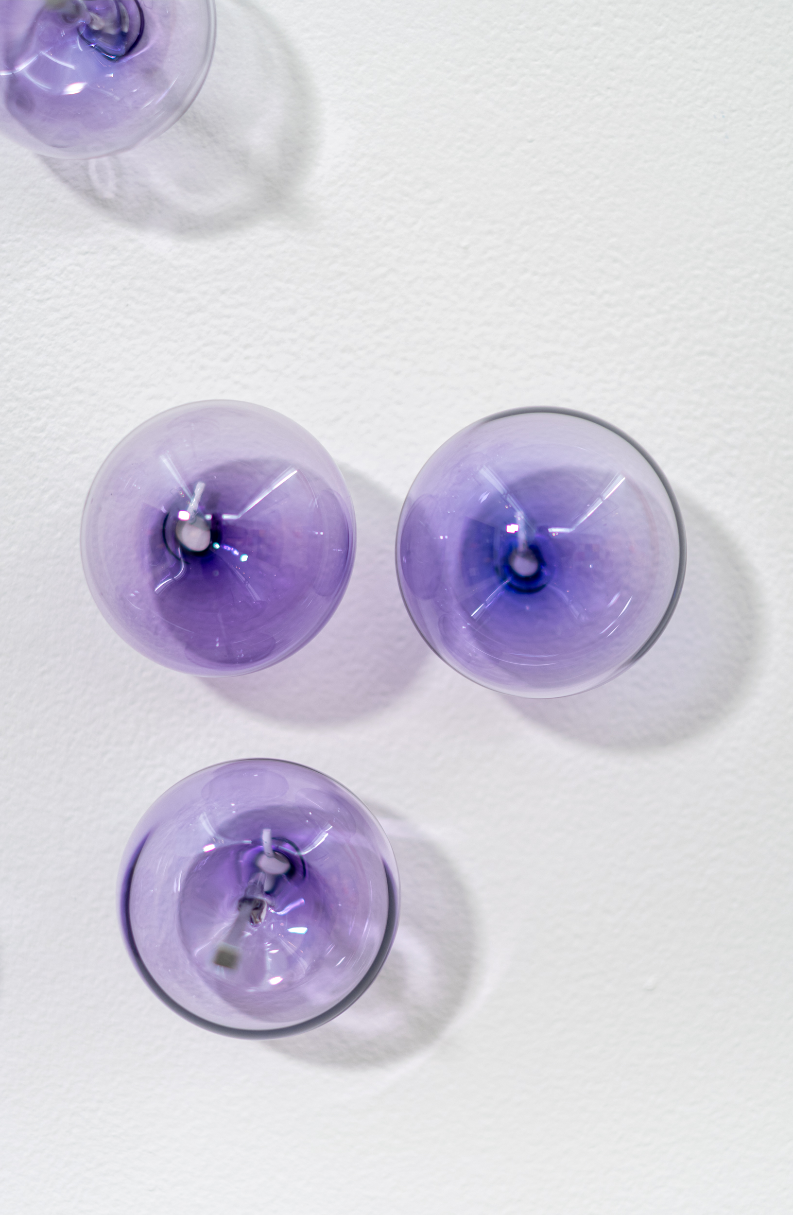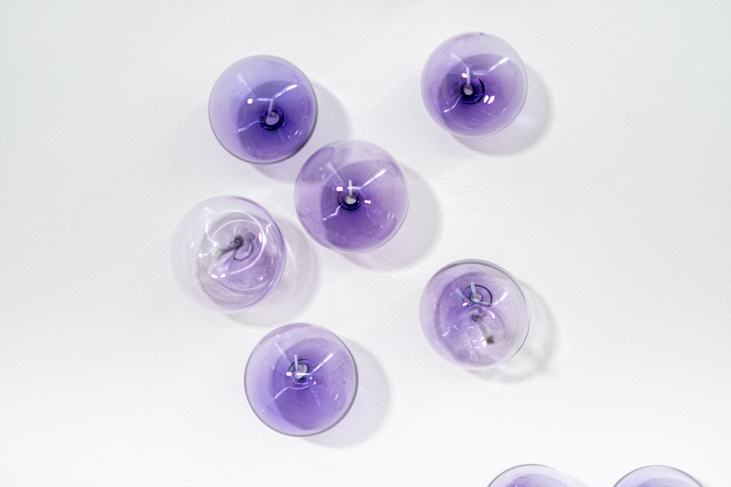 The elegant vertical composition features fourteen purple-colored blown glass bubbles; some inflated, others deflated and pierced by iron nails arranged in a cascading pattern.