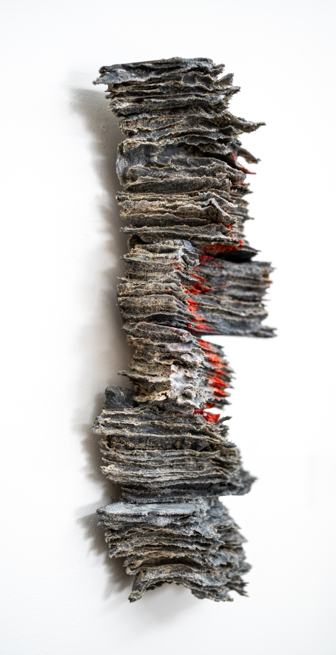 This contemporary glass wall sculpture resembles rock.Cheryl Wilson Smith’s striking wall sculptures are inspired by the remote rugged wilderness that surrounds her home in Northern Ontario. This is one of a series of finely layered glass frit (special ground glass) pieces in a charcoal colour with red highlights. The form, texture and colour resembles the beautiful ancient rocky outcrops of a boreal forest. One in a series.