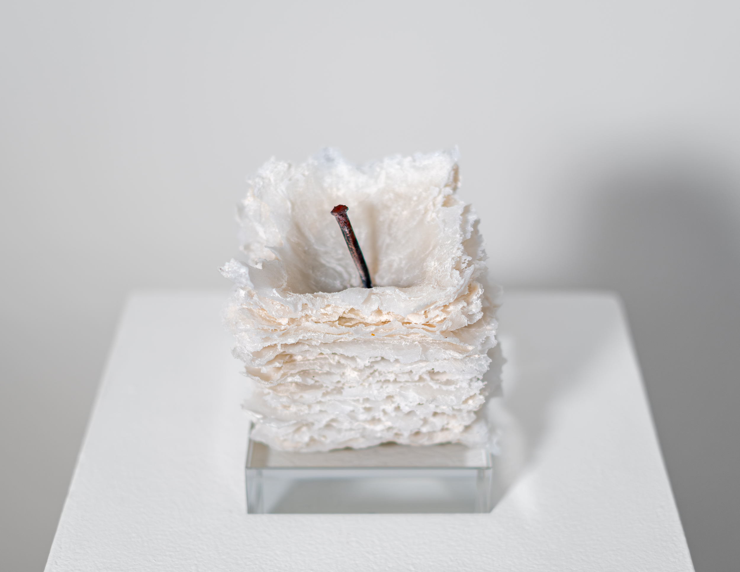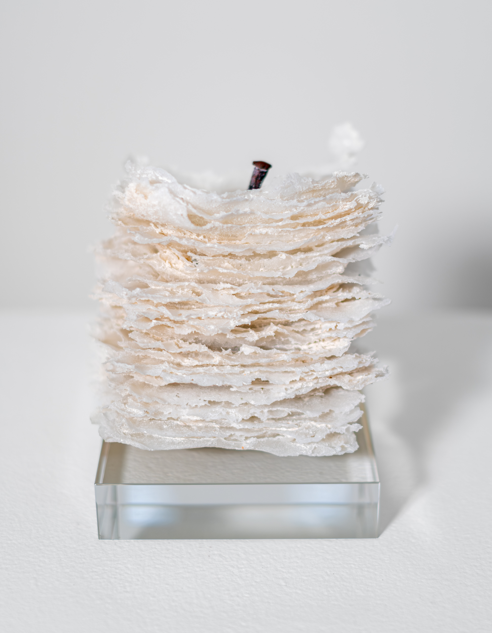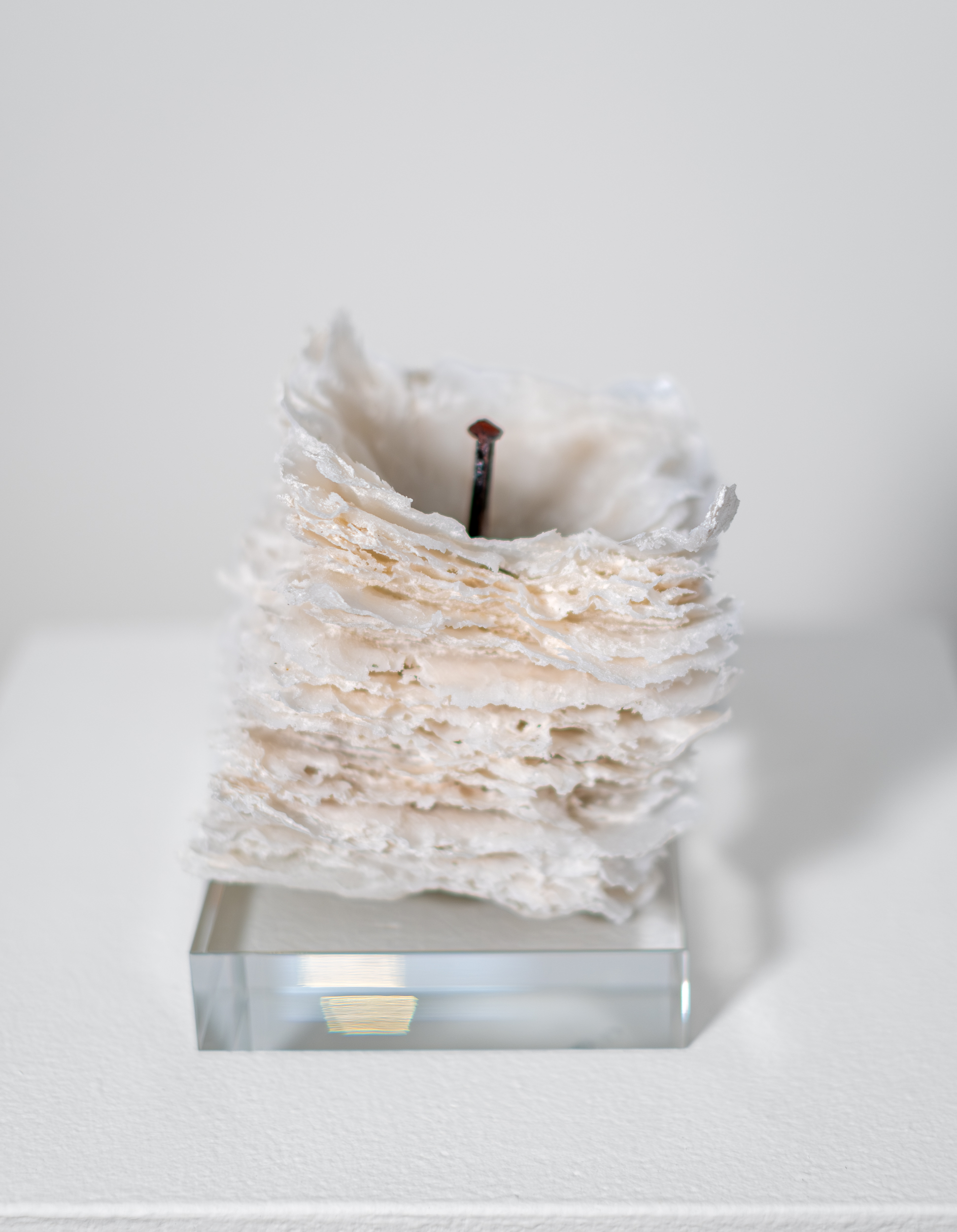 This contemporary table top white glass sculpture is by Cheryl Wilson Smith.Cheryl Wilson Smith’s award-winning, distinctive glass work is both inspired by and deeply rooted in her own life experiences. This contemporary sculptural piece, with fine layers of winter white glass frit (ground glass) stacked on a black metal nail, is reminiscent of the old-fashioned system of collecting notes. This is one of a series that was created following two recent events that rocked the artist emotionally--the departure of her youngest son for University and the shock of working in a very foreign environment. Both events appear to be symbolized by the neatly assembled stack of ‘notes’-- a record of ‘promises and lies’ sitting on a square of clear plexiglass.