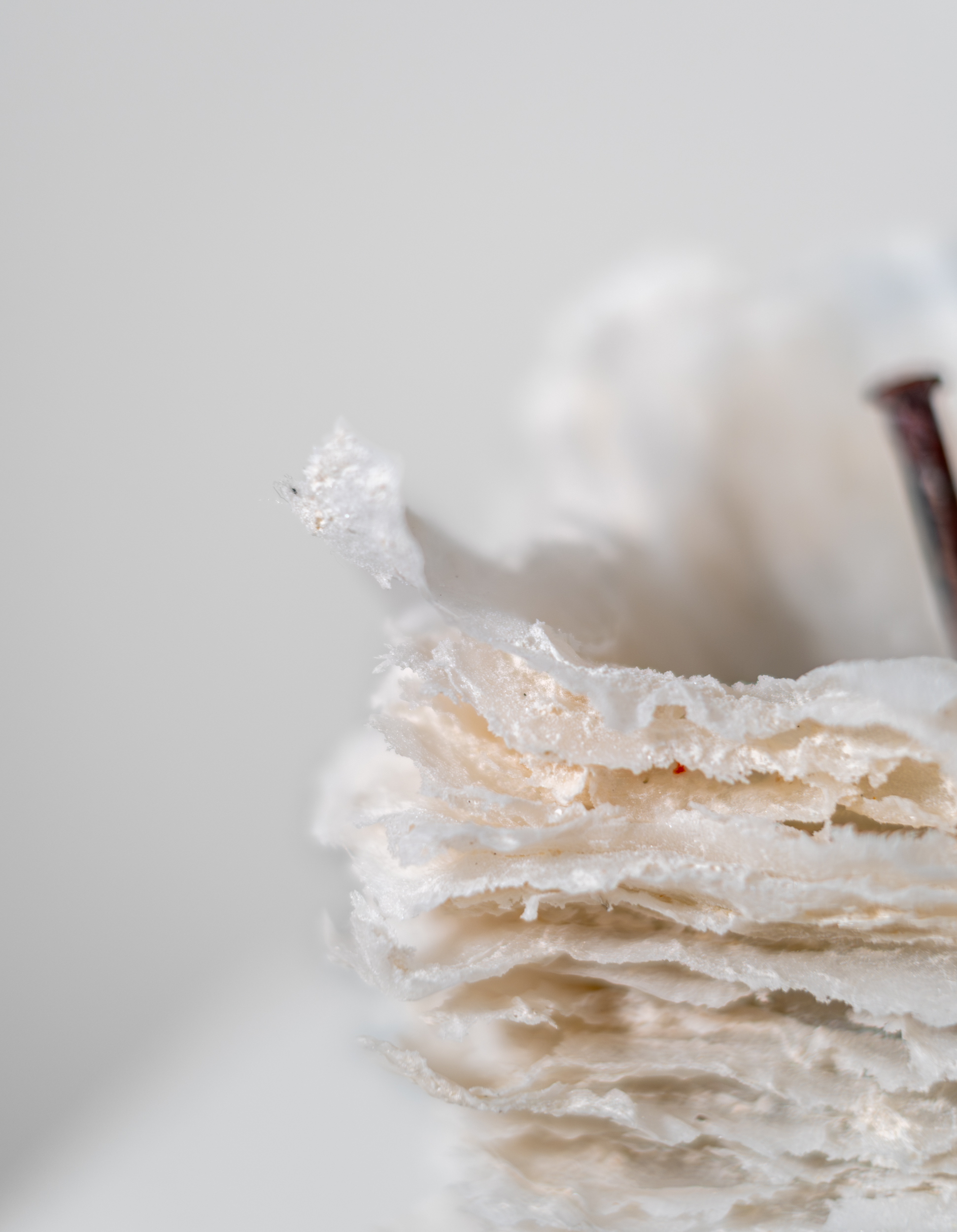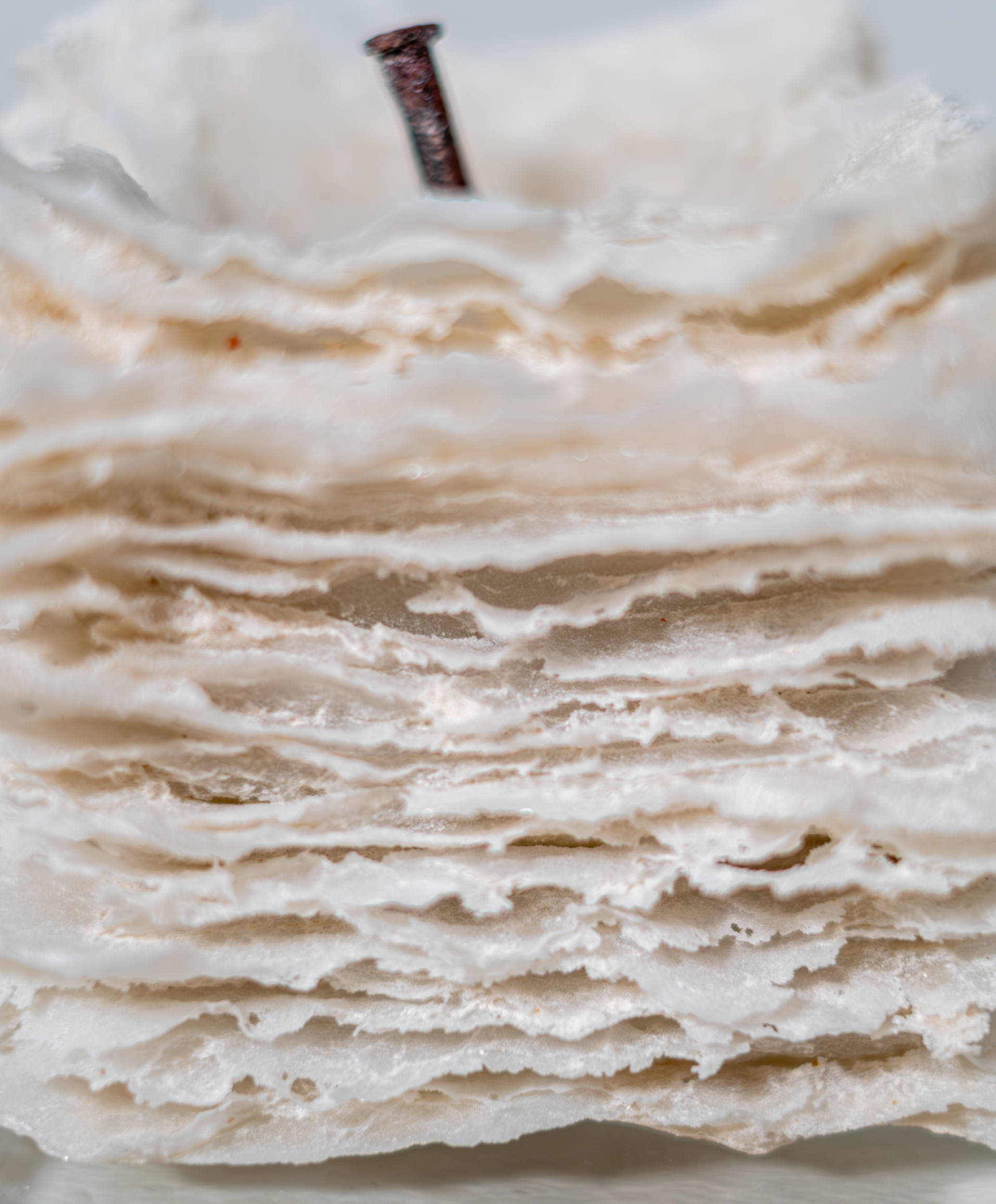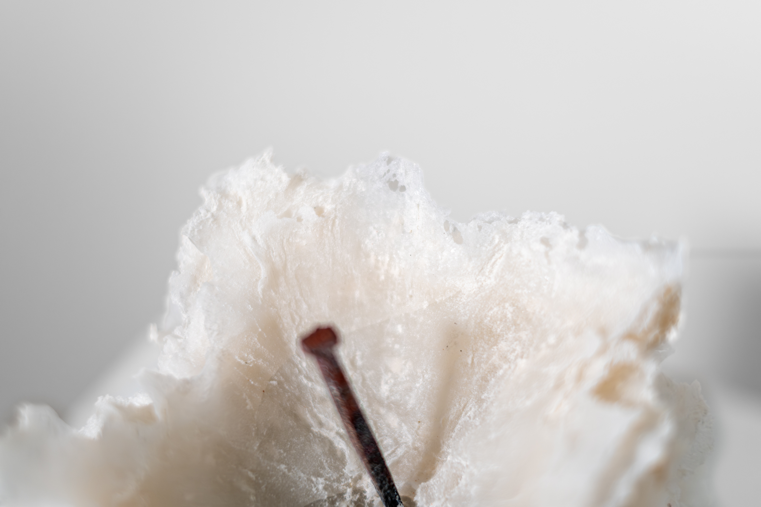 This contemporary table top white glass sculpture is by Cheryl Wilson Smith.Cheryl Wilson Smith’s award-winning, distinctive glass work is both inspired by and deeply rooted in her own life experiences. This contemporary sculptural piece, with fine layers of winter white glass frit (ground glass) stacked on a black metal nail, is reminiscent of the old-fashioned system of collecting notes. This is one of a series that was created following two recent events that rocked the artist emotionally--the departure of her youngest son for University and the shock of working in a very foreign environment. Both events appear to be symbolized by the neatly assembled stack of ‘notes’-- a record of ‘promises and lies’ sitting on a square of clear plexiglass.