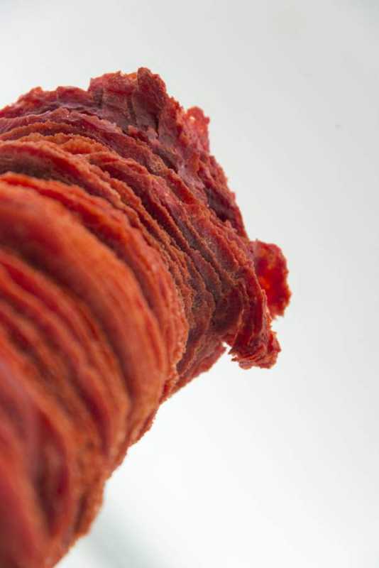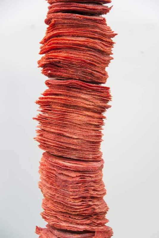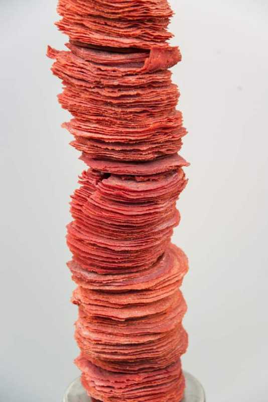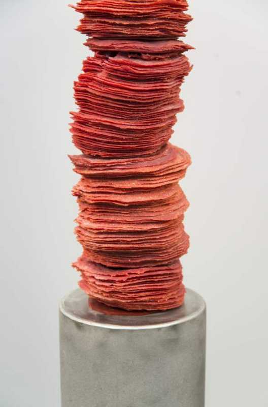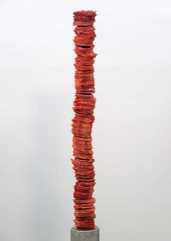Paper-thin layers of deep red glass frit (special ground glass) are carefully stacked in these striking columns created by Canadian artist Cheryl Wilson-Smith. This is one in a series of three. Wilson-Smith lives in a remote part of northern Ontario ‘where the highway ends’ surrounded by ancient rock and the boreal forest. Her work reflects her abiding love of and respect for the natural world.“The wilderness has always been a place of sanctuary for me. The rocks, lakes and trees were here before me and will be here long after which fuels my geological wonder at the passage of time.” Cheryl Wilson-Smith