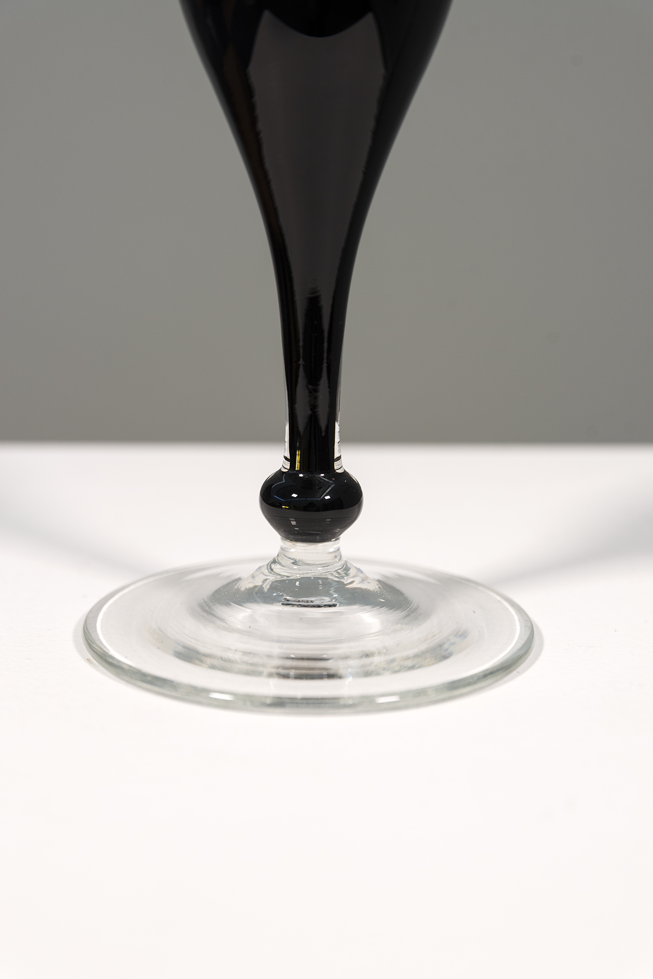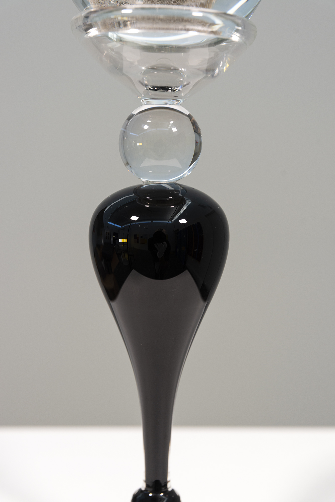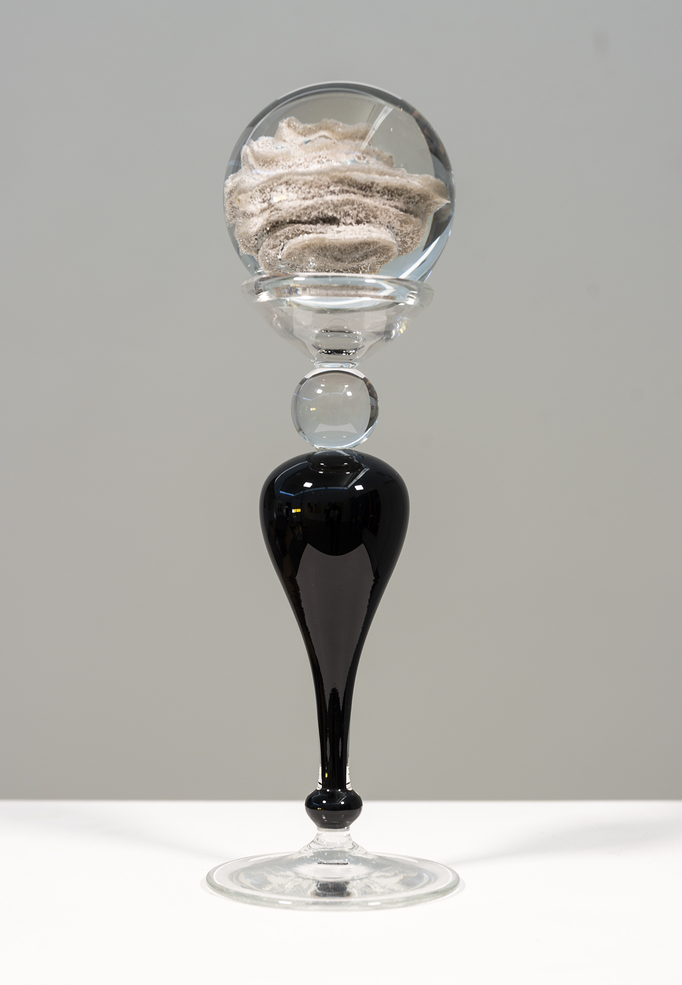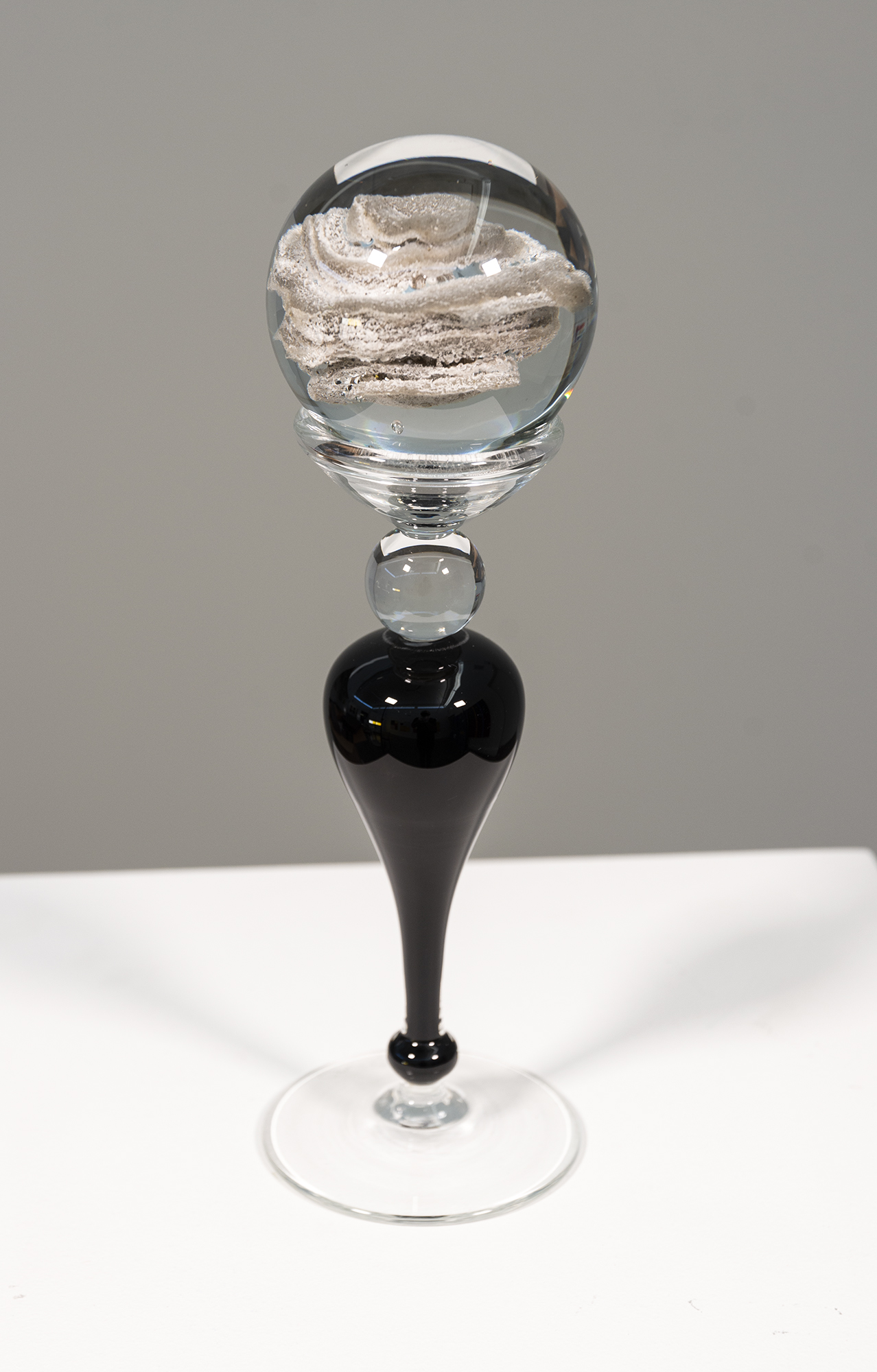 This contemporary table top, clear and black glass piece, is by Cheryl Wilson Smith.These elegant collections of sculptural glass pieces are technically very challenging to create and underscore the superb craftsmanship of Cheryl Wilson Smith’s art. The award-winning glass artist had thought about creating these pieces for a long time. Encasing her signature fine layers of blown glass frit in clear glass when both are hot is very difficult. The result is a unique series—a smooth, clear glass globe (the world) housing a piece of Wilson Smith’s textured glass frit—a ‘stone’ in a neutral hue. The globe sits elevated on a tall, curved pedestal of black glass.
