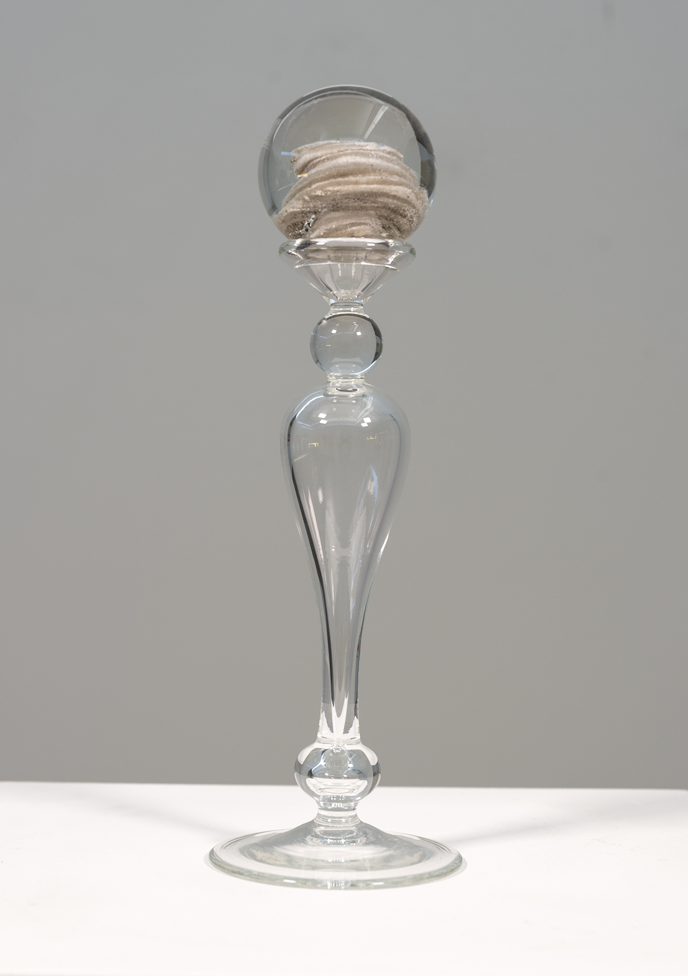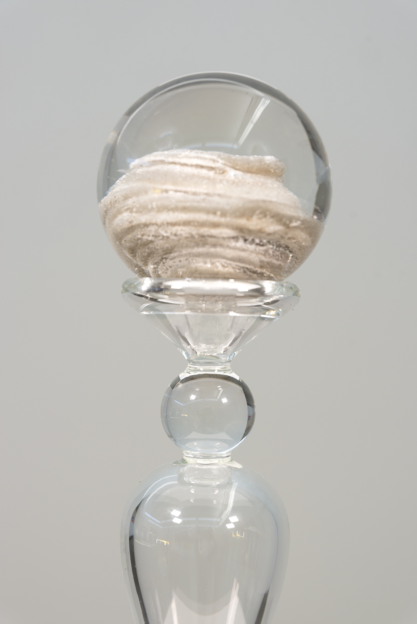 This contemporary table top clear glass piece is by Cheryl Wilson Smith.These elegant collections of sculptural glass pieces are technically very challenging to create and underscore the superb craftsmanship of Cheryl Wilson Smith’s art. The award winning glass artist had thought about creating these pieces for a long time. Encasing her signature fine layers of blown glass frit in clear glass when both are hot is very difficult. The result is a unique series—a smooth clear glass globe (the world) housing a piece of Wilson Smith’s textured glass frit—a ‘stone’ in a neutral hue. The globe sits elevated on a tall curved pedestal of clear glass.