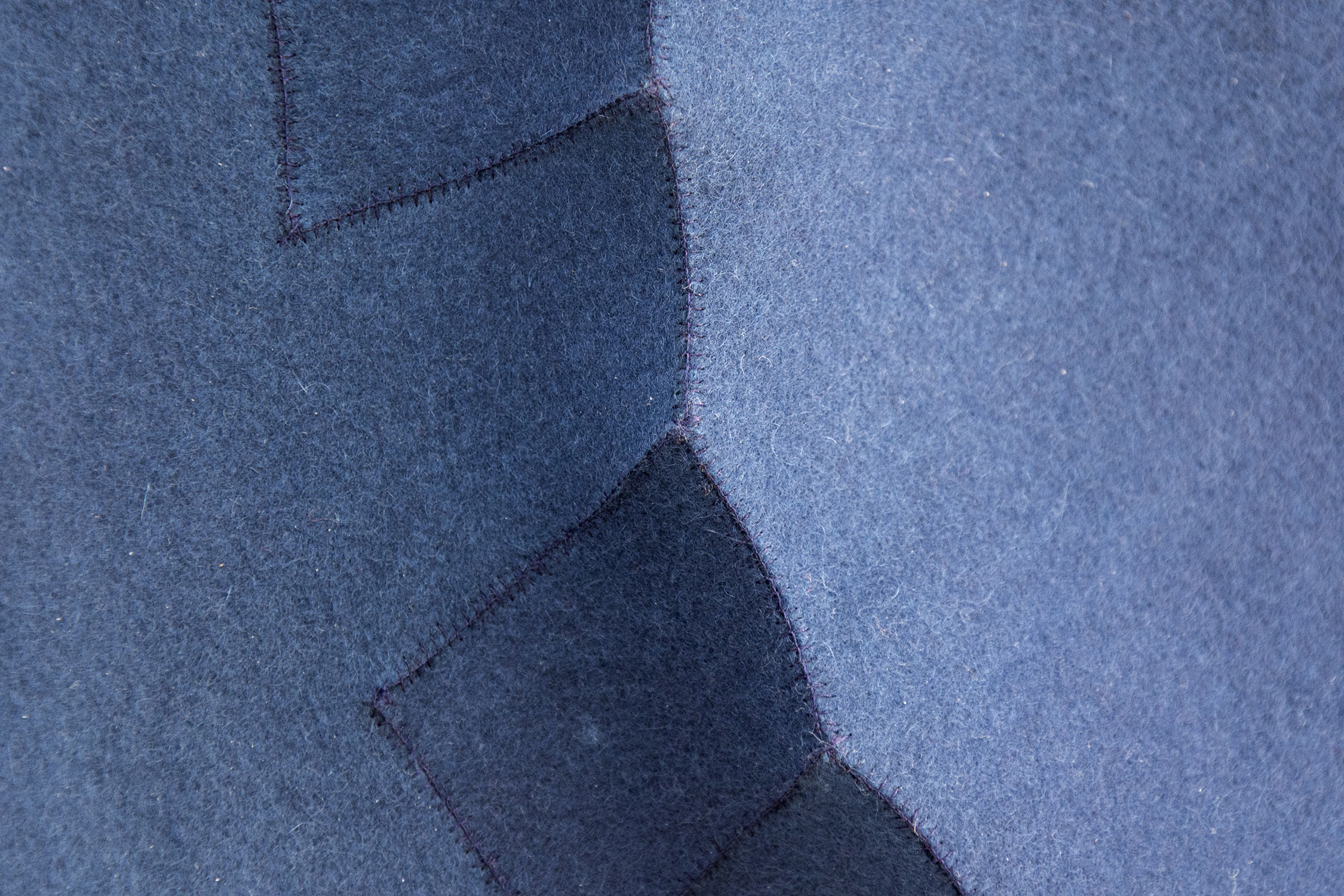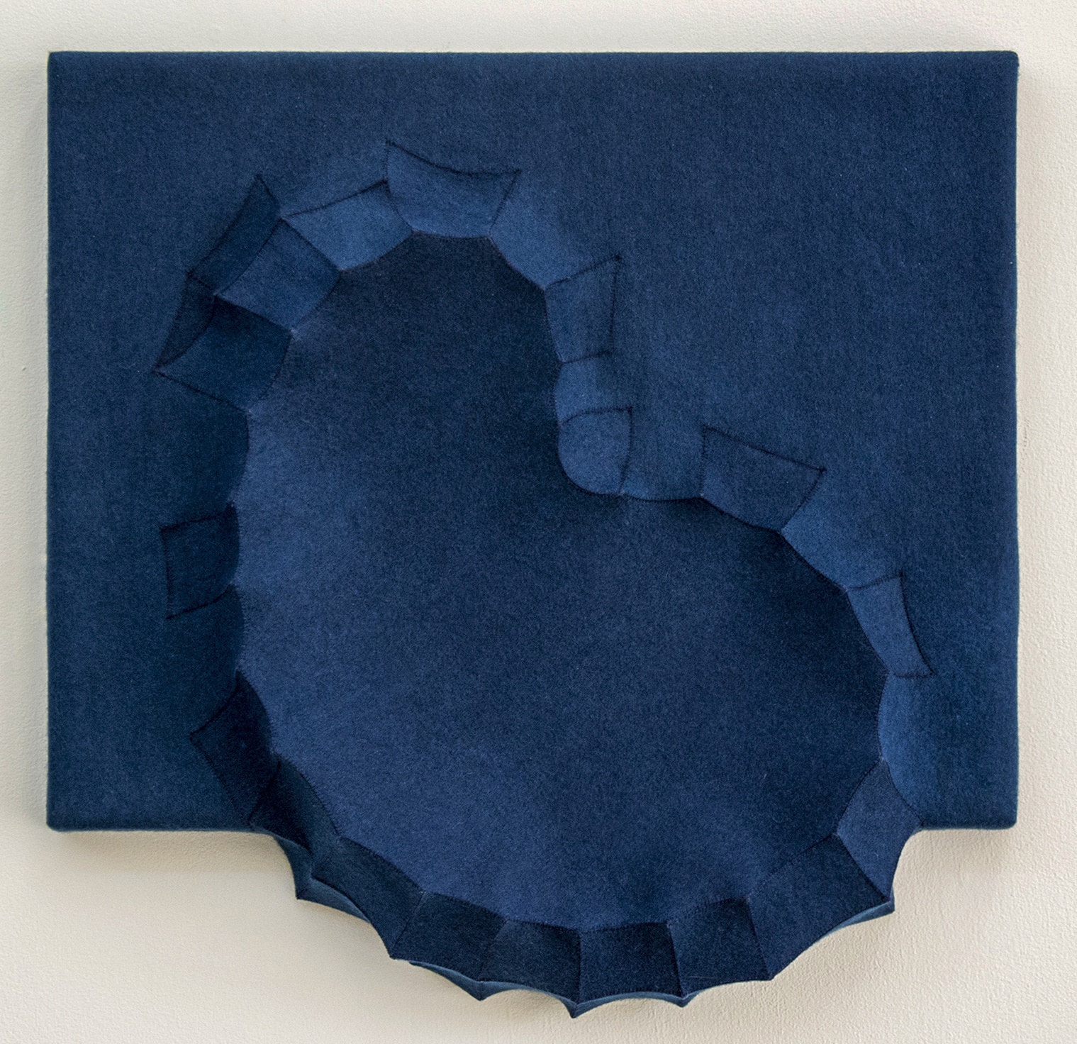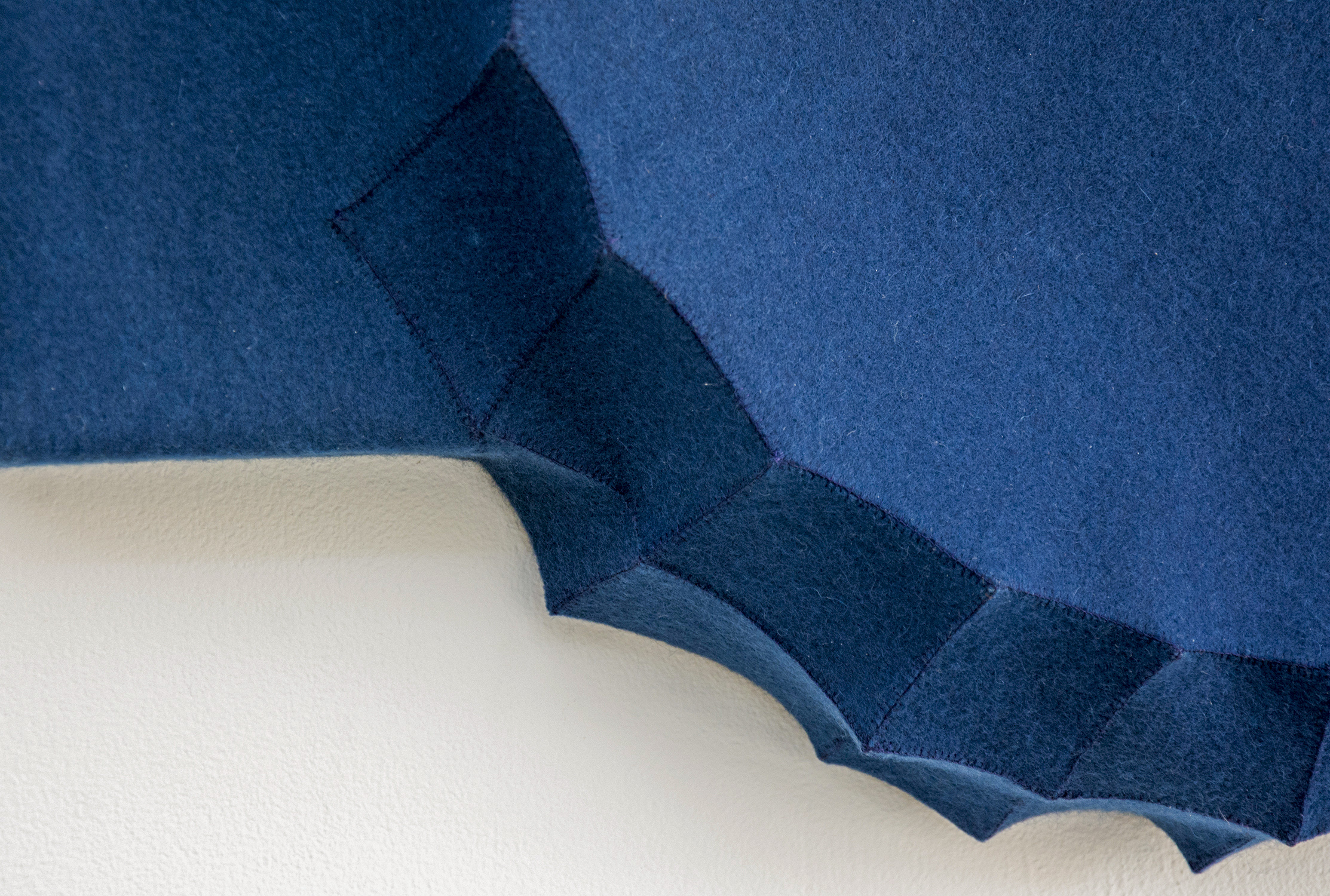 Sapphire blue felt takes the shape of a biomorphic form in this contemplative wall sculpture by fabric artist Chung-Im Kim. The felt is cut into irregular shapes that are sewn with precise stitches into gentle peaks and valleys."A pattern can grow into a complex image jungle or a well-disciplined ornamental beauty. These recent works explore the chaotic order resulting from many small pieces containing broken images. I tend to see each of these parts as an independent soul containing unique power and energy that then together becomes an entity as cells to a body. I hope to evoke the birthing tension when all are gathered." Chung-Im Kim