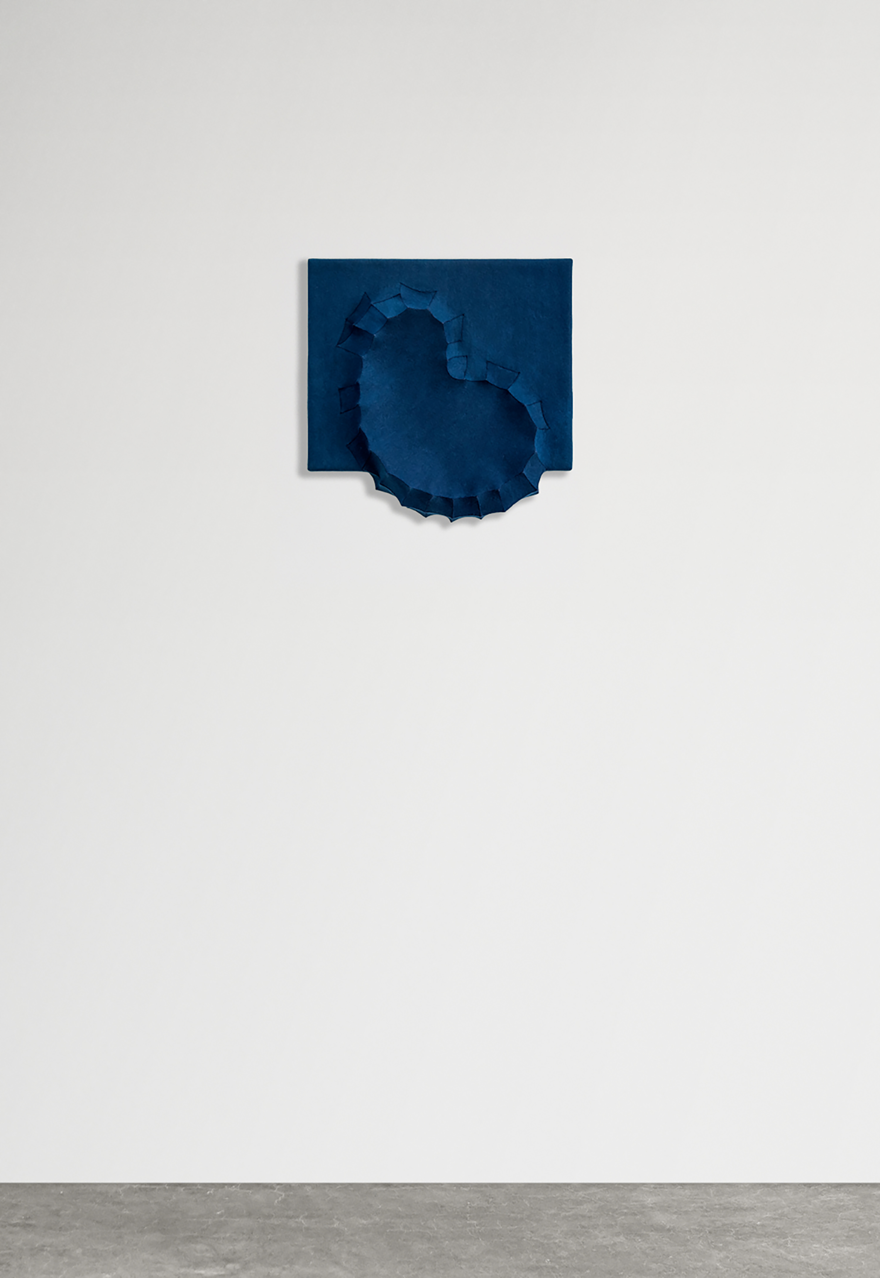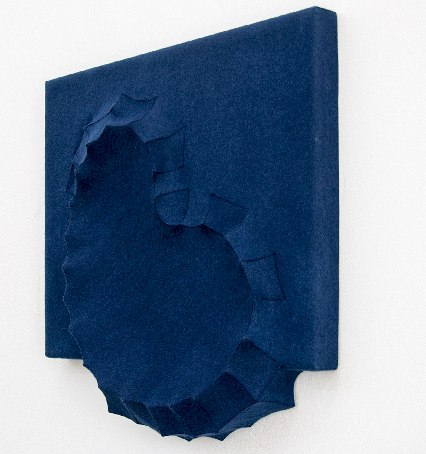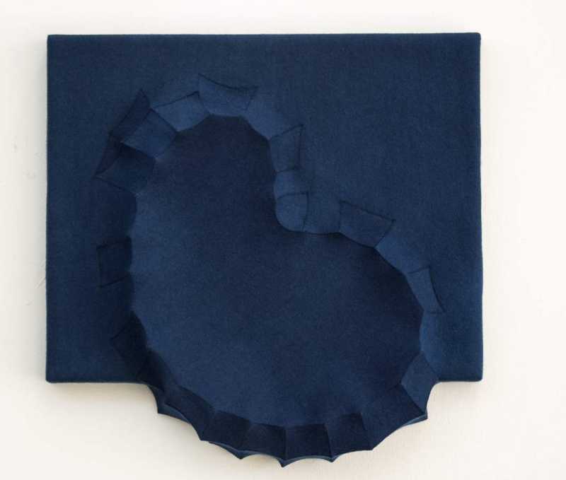 Sapphire blue felt takes the shape of a biomorphic form in this contemplative wall sculpture by fabric artist Chung-Im Kim. The felt is cut into irregular shapes that are sewn with precise stitches into gentle peaks and valleys."A pattern can grow into a complex image jungle or a well-disciplined ornamental beauty. These recent works explore the chaotic order resulting from many small pieces containing broken images. I tend to see each of these parts as an independent soul containing unique power and energy that then together becomes an entity as cells to a body. I hope to evoke the birthing tension when all are gathered." Chung-Im Kim
