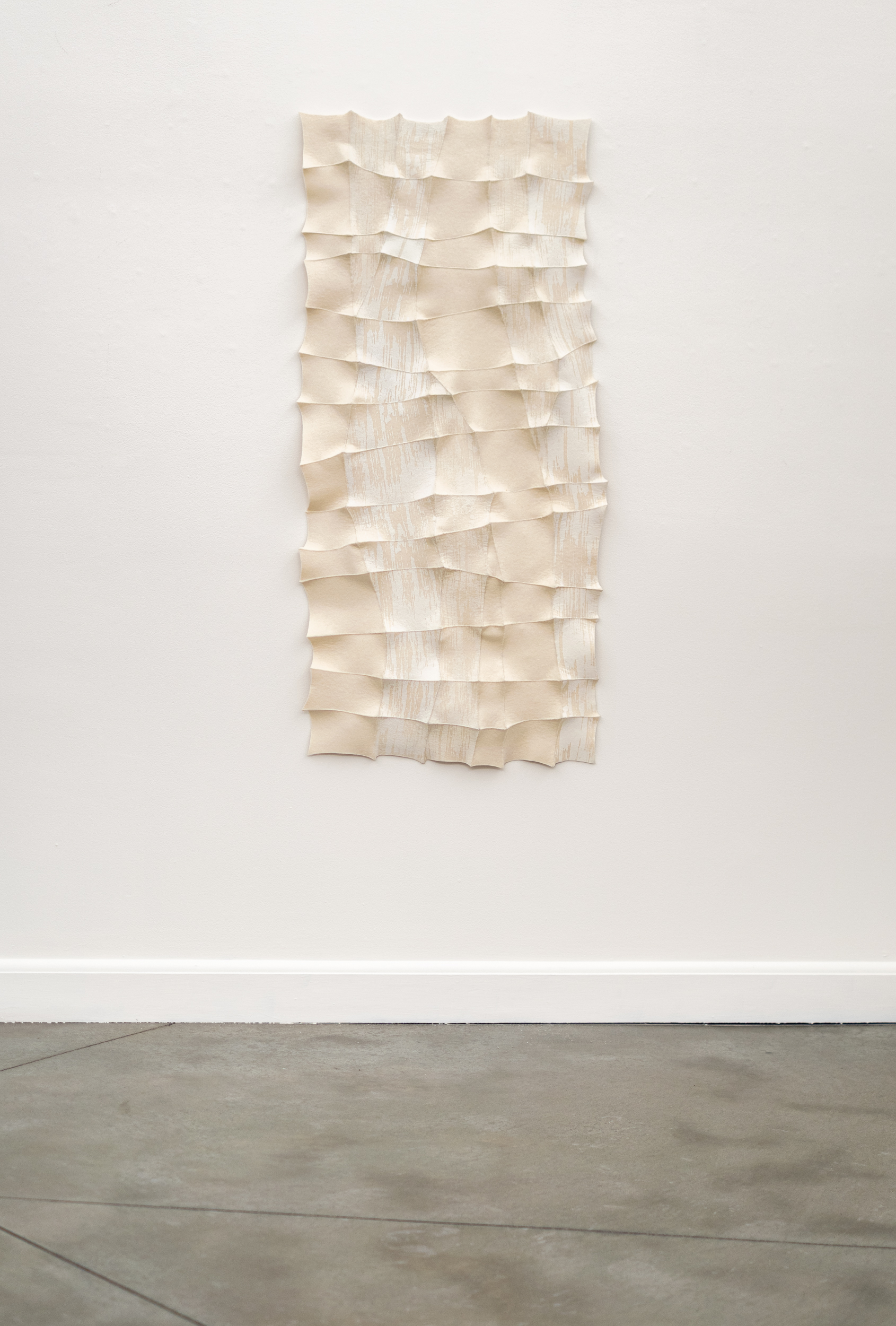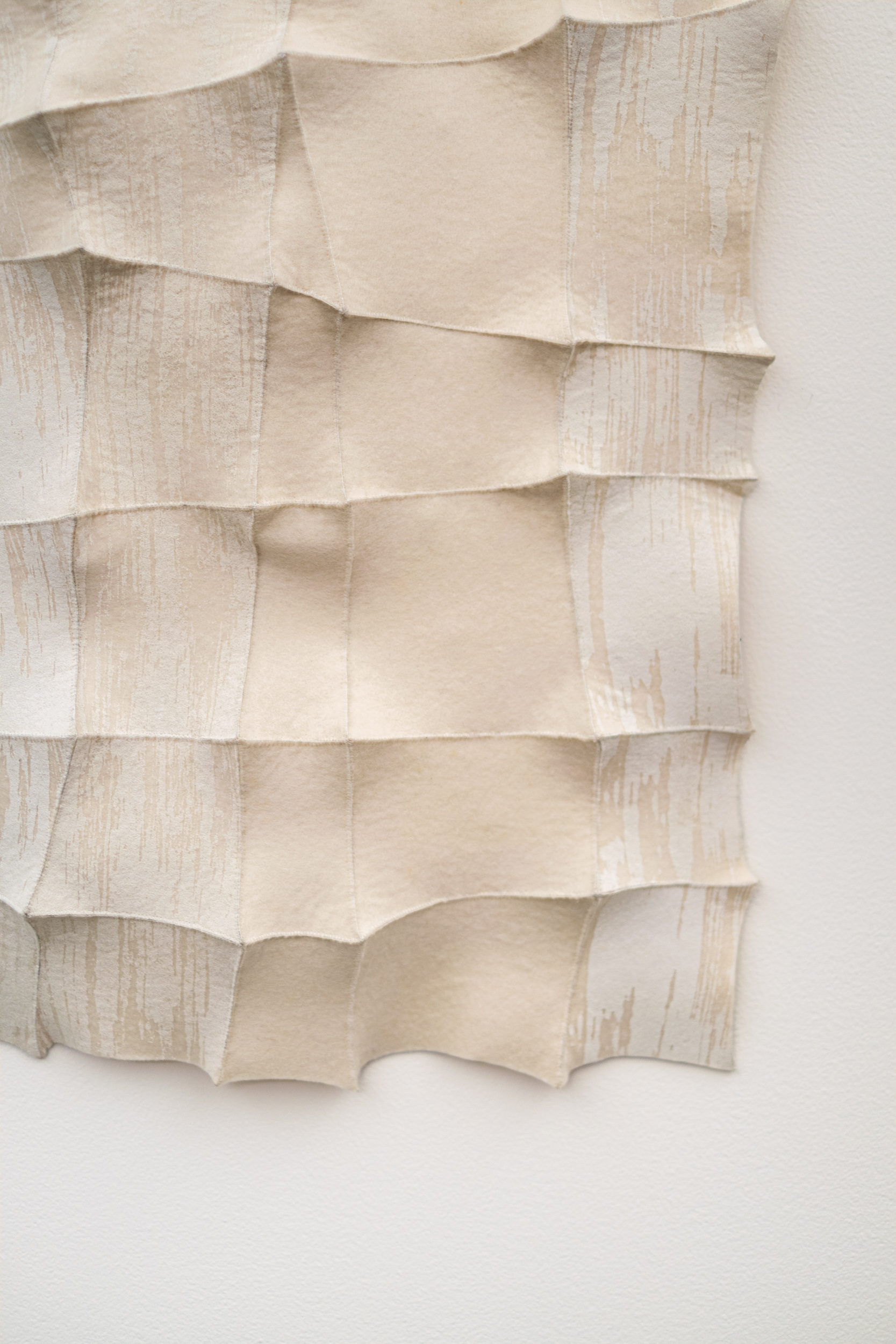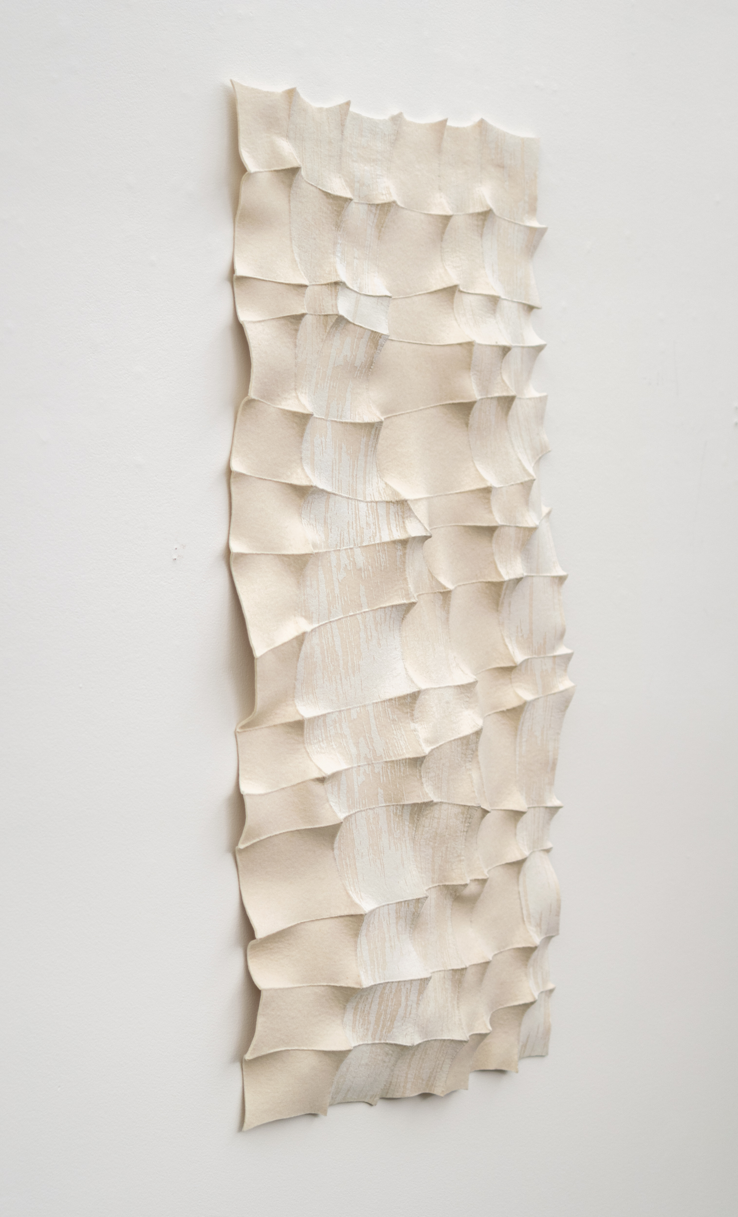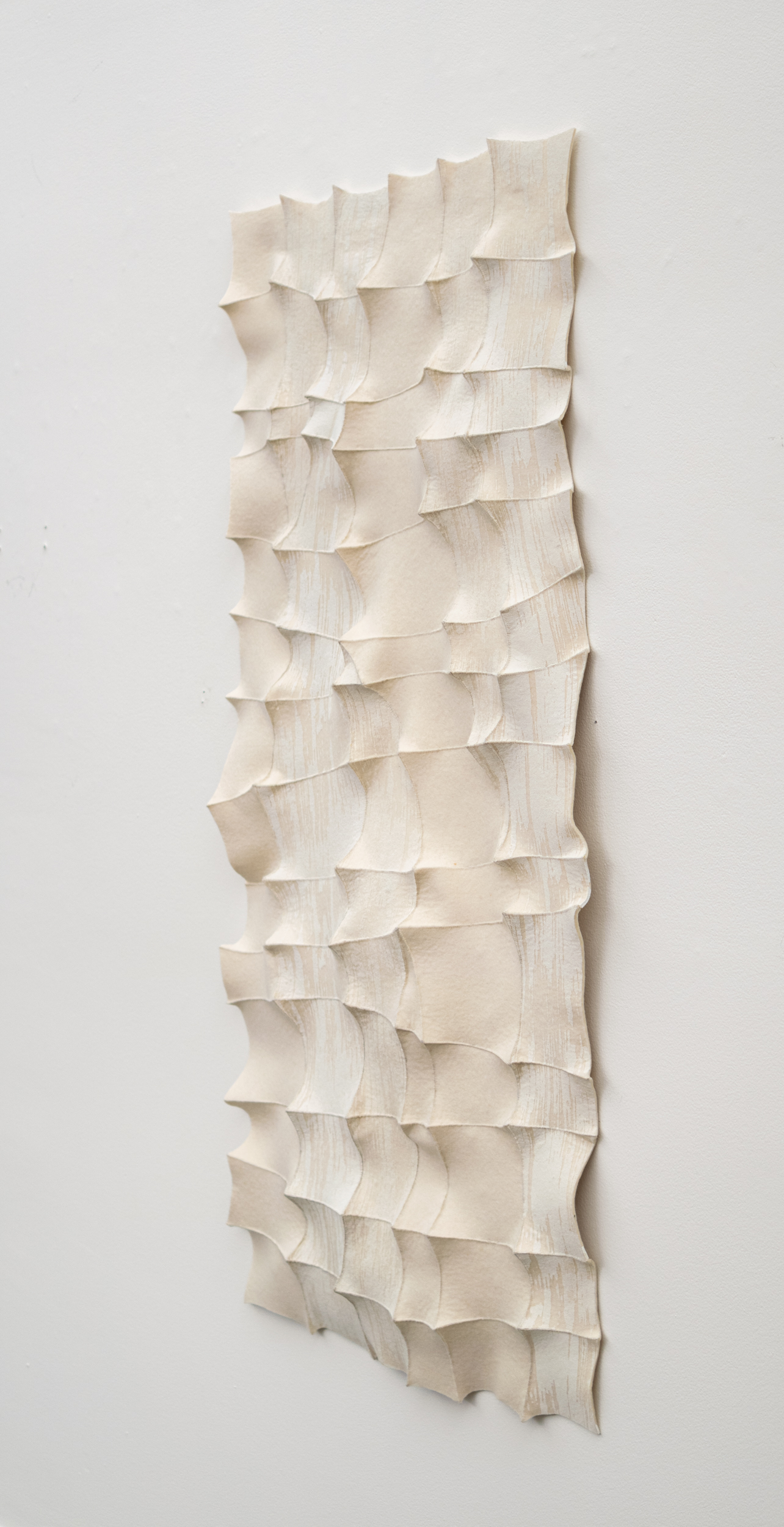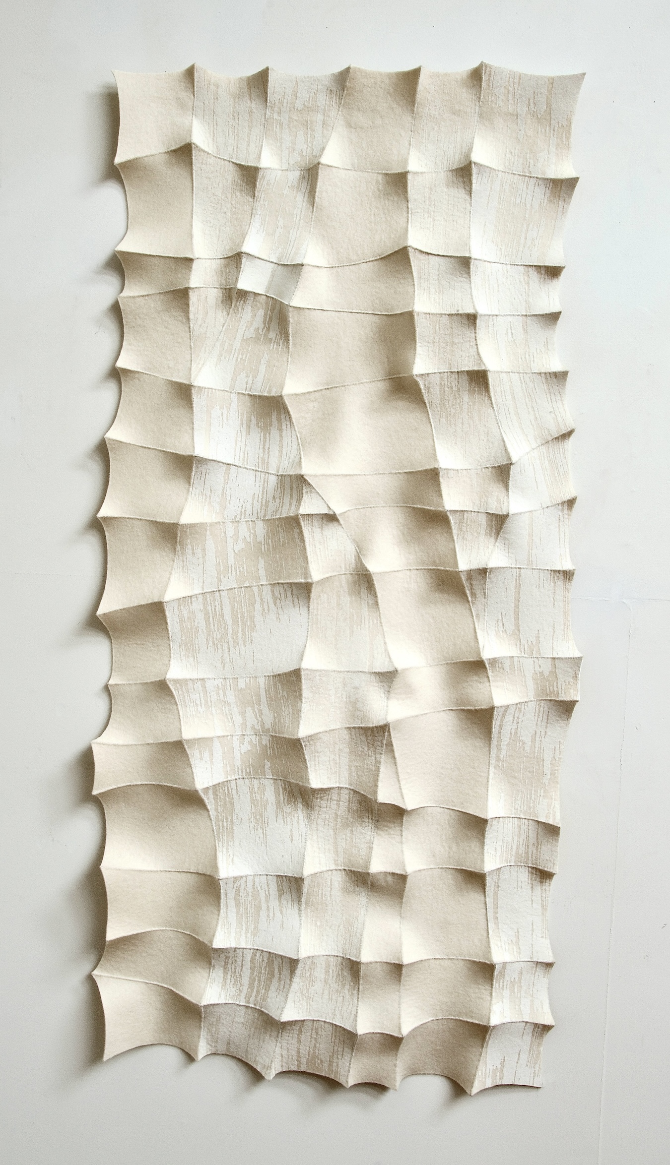 This contemporary white sculptural wall hanging was handmade.For more than three decades, internationally acclaimed artist Chung Im-Kim has woven two worlds together. The Canadian textile artist was born in South Korea, and much of her inspiration is still drawn from the beautiful textiles she saw in her youth. The dynamic organic form and colours found in nature also inform her art. This alluring contemporary white on white tapestry was hand-sewn using a traditional Bojaji patchwork stitch to join together small pieces of industrial felt. Each square is pulled taut to create a visible dimension--a raised pattern and tension in the design. White ink—screen printed adds expressive detail to the fabric.