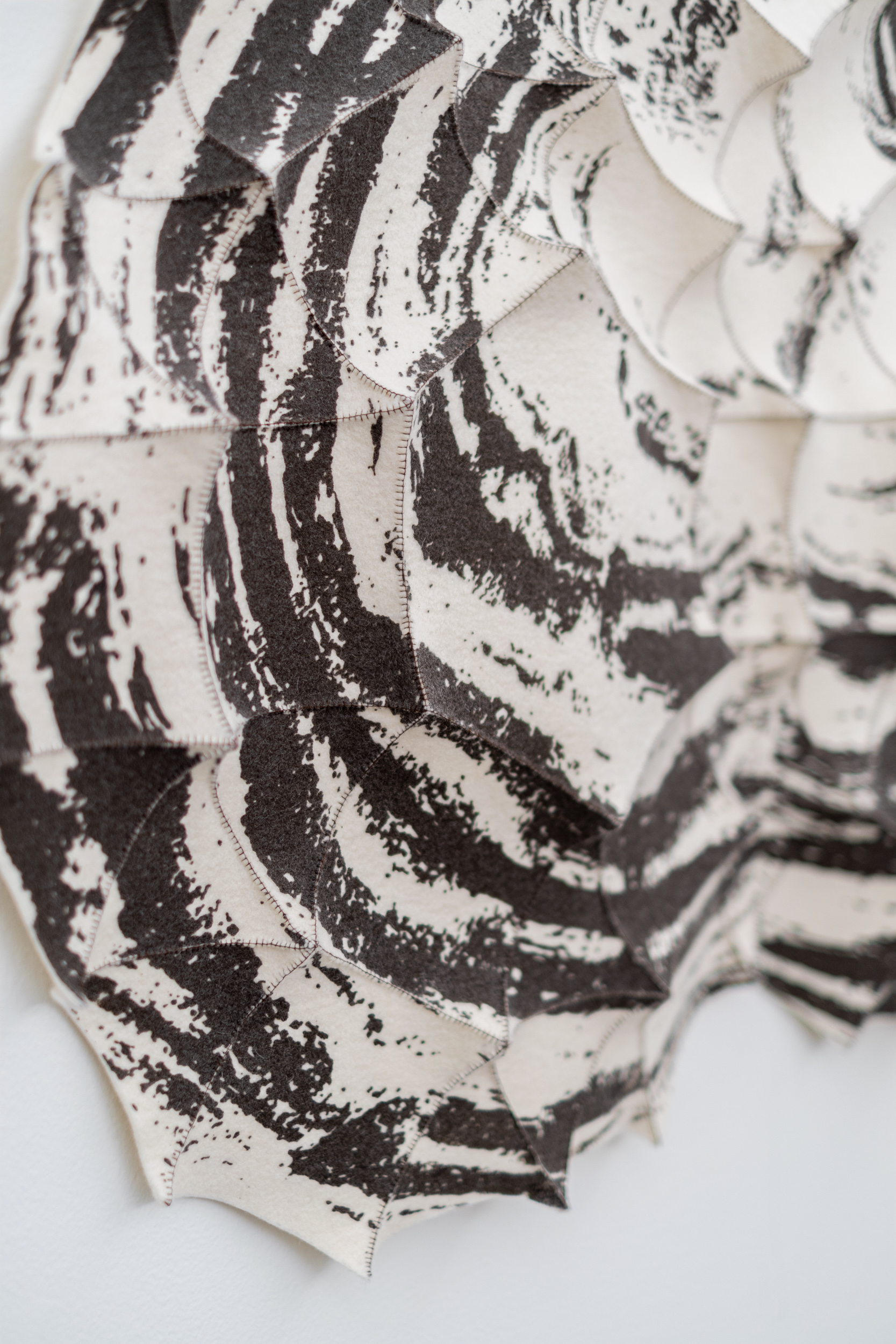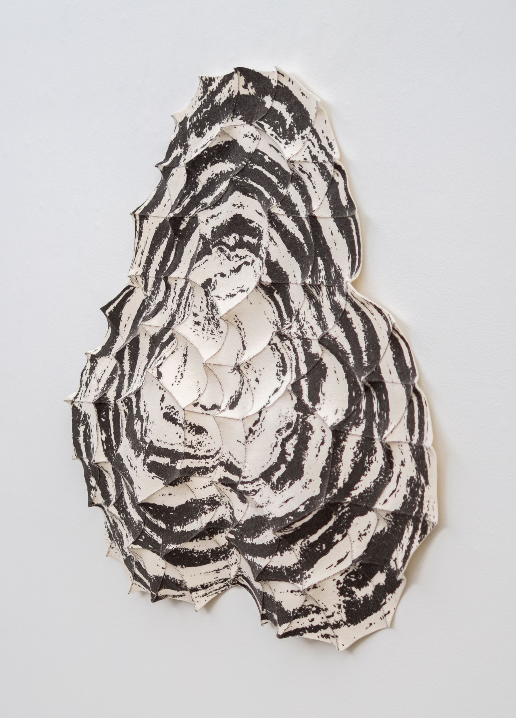 This contemporary fibre tapestry is handmade by Chung-Im Kim.Each wall hanging created by this uniquely gifted fibre artist takes hours of meticulous hand sewing. Inspired by her rich Korean history, Chung-Im Kim uses industrial felt to create these distinctive sculptural wall hangings. Kim sewed together small squares and triangles of felt, which were then pulled taut to create a raised pattern and tension in the design. Coloured ink added in expressive brushstrokes adds dramatic contrast, visible texture and detail to the white fabric. Most of her work is informed by patterns found in nature, but the organic shape of this piece was drawn from her own life experience. One of a series.