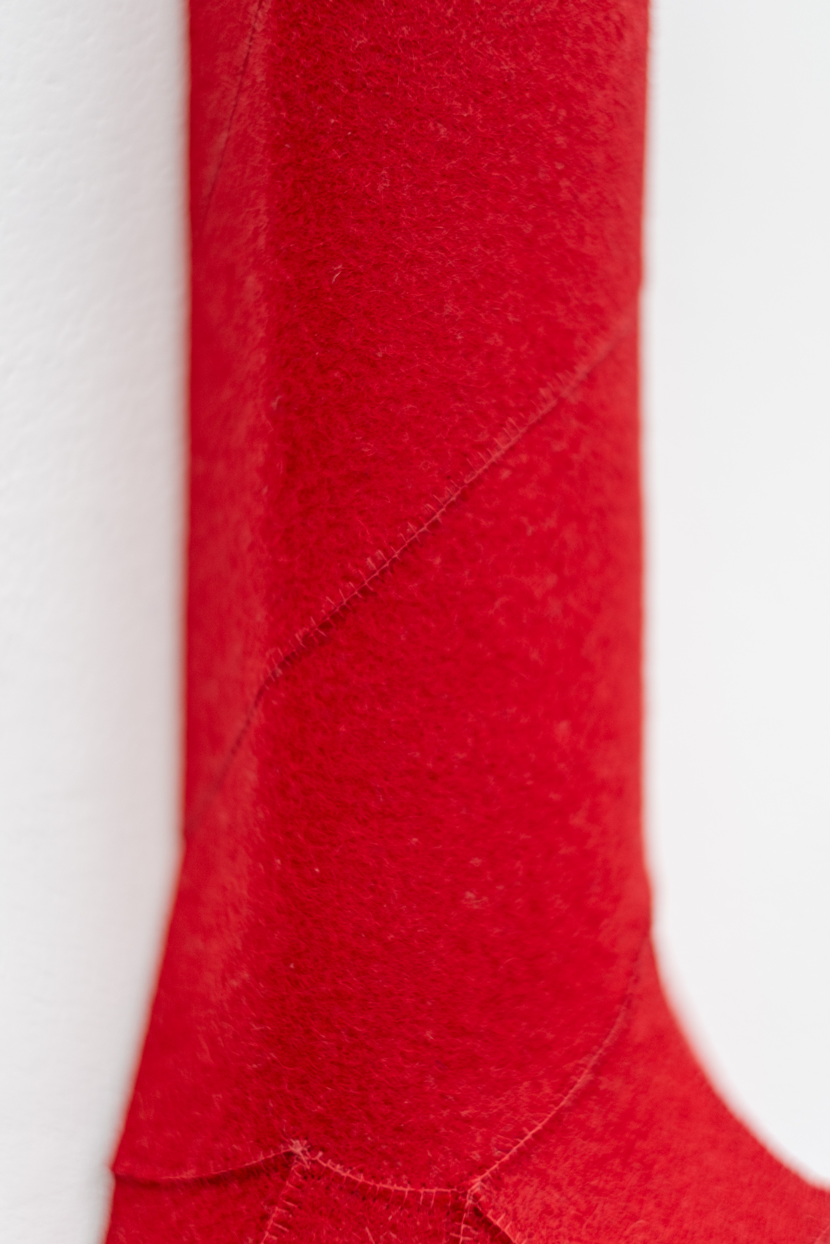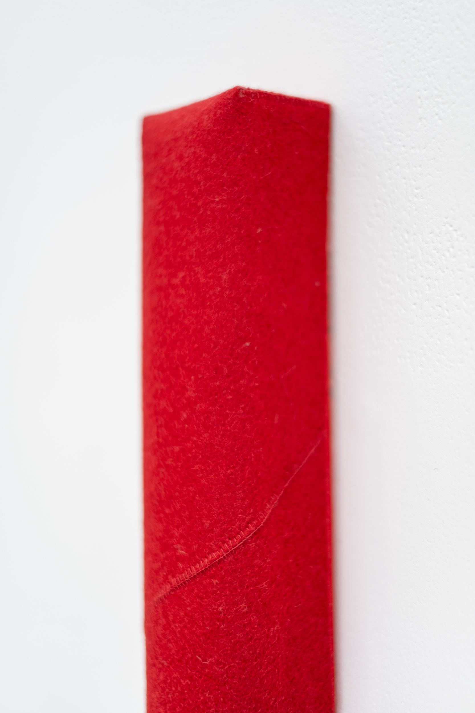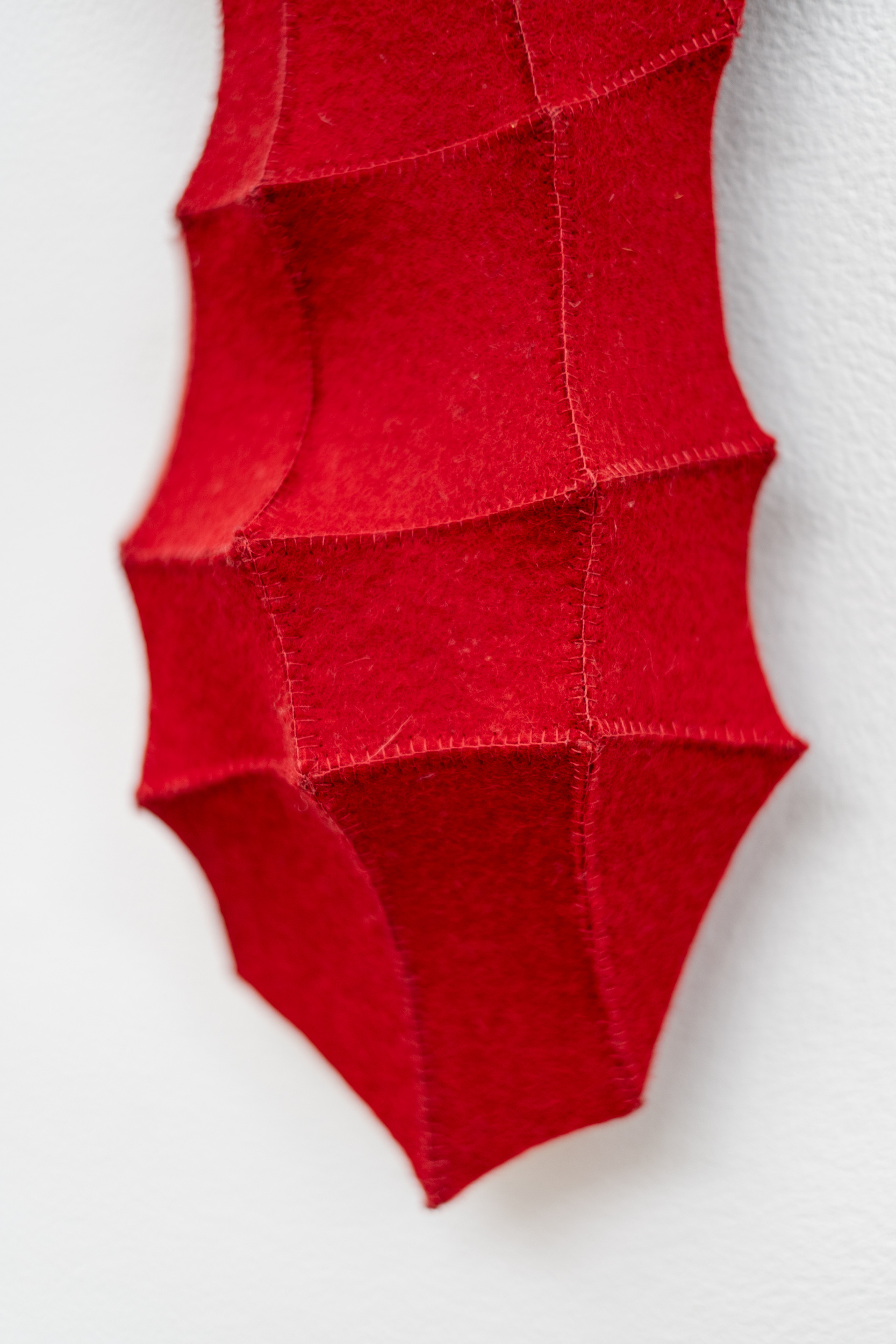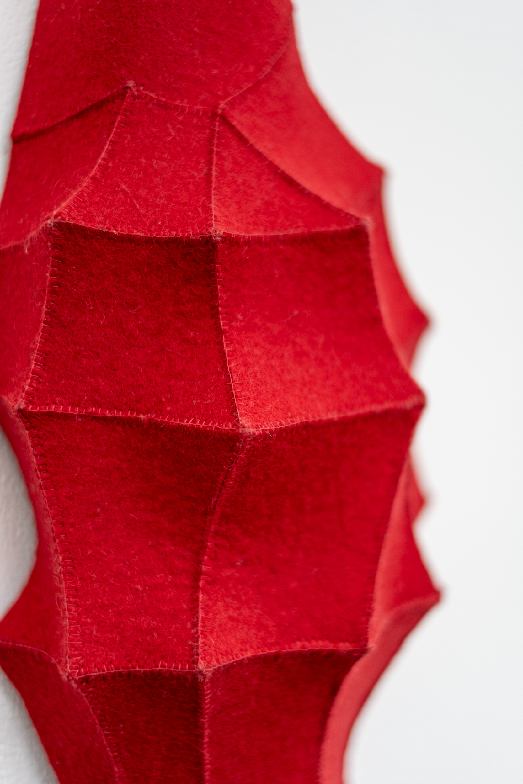 This contemporary fibre art wall hanging is by Chung-Im Kim.The eclectic, superbly handcrafted artwork of this Canadian artist has garnered her international recognition and acclaim. Inspired by her own rich heritage and intricate patterns found in nature, Kim uses industrial felt to create her wall hangings. This vertical piece in a deep red colour is made from small pieces of industrial felt sewn together and pulled taut to create a raised pattern and tension in the design. Kim works intuitively, allowing each module to help guide the next, building the shape as she goes. One of a series.