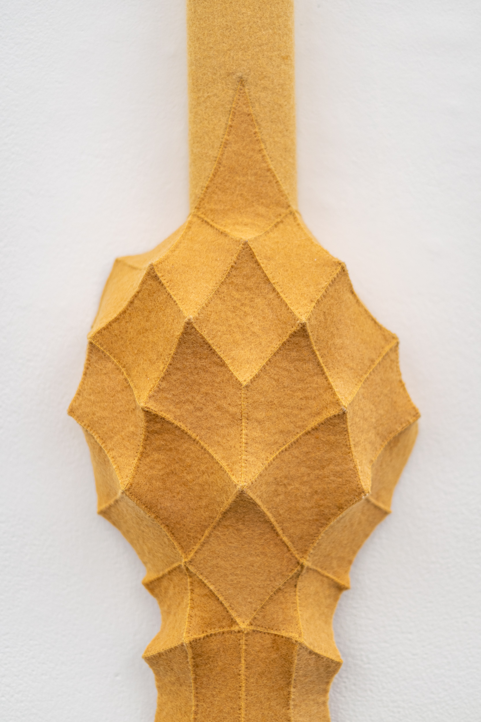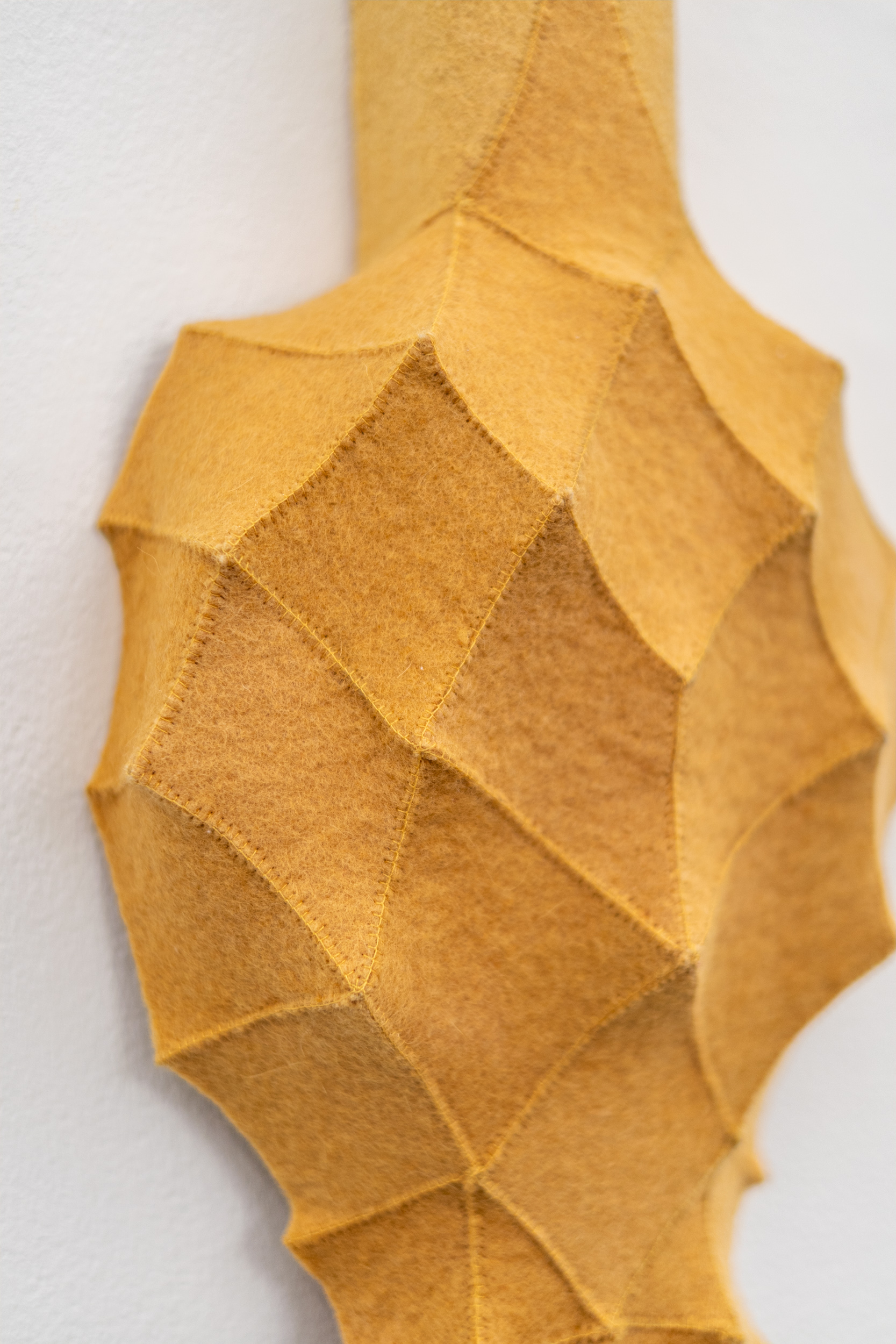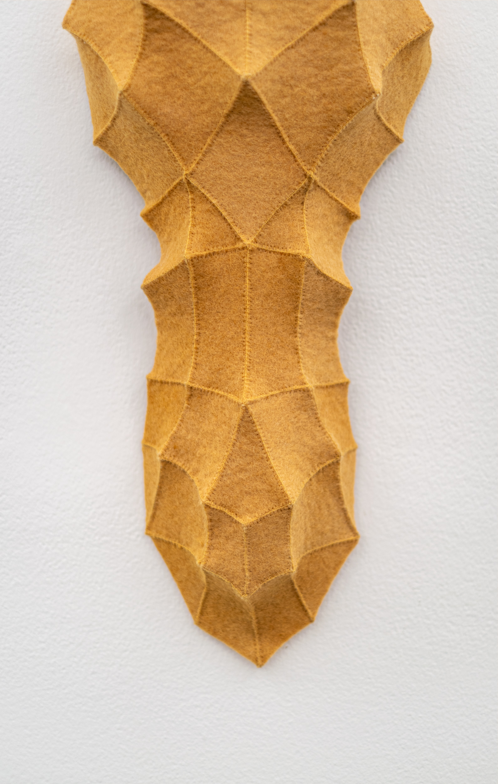 This contemporary fibre art wall hanging is by Chung-Im Kim.The eclectic, superbly handcrafted artwork of this Canadian artist has garnered her international recognition and acclaim. Inspired by her own rich heritage and intricate patterns found in nature, Kim uses industrial felt to create her wall hangings. This vertical piece in a rich golden yellow colour is made from small pieces of industrial felt sewn together and pulled taut to create a raised pattern and tension in the design. Kim works intuitively, allowing each module to help guide the next, building the shape as she goes. One of a series.