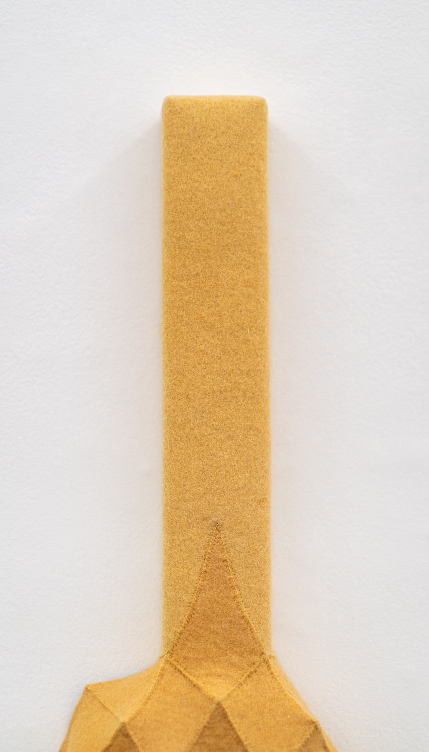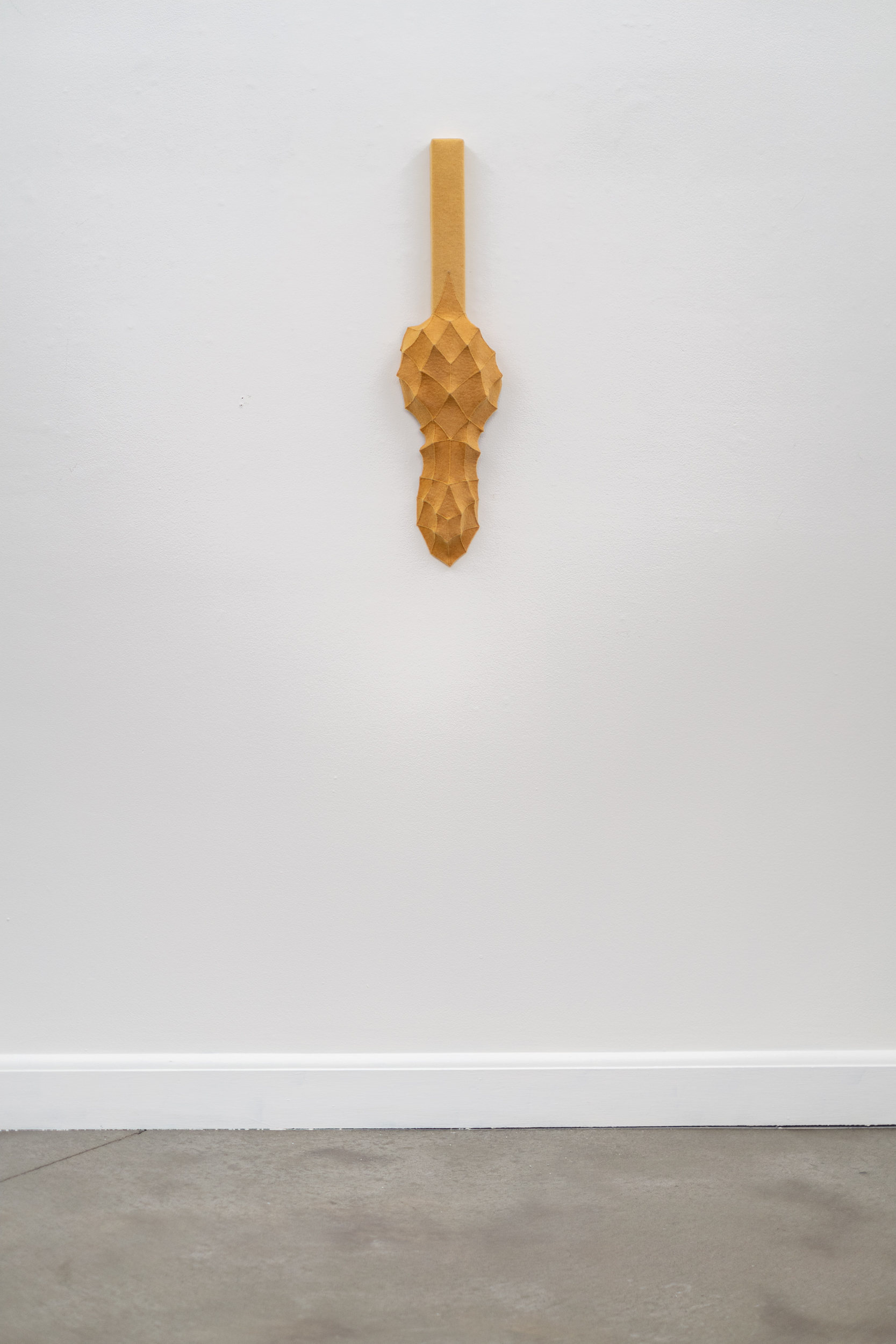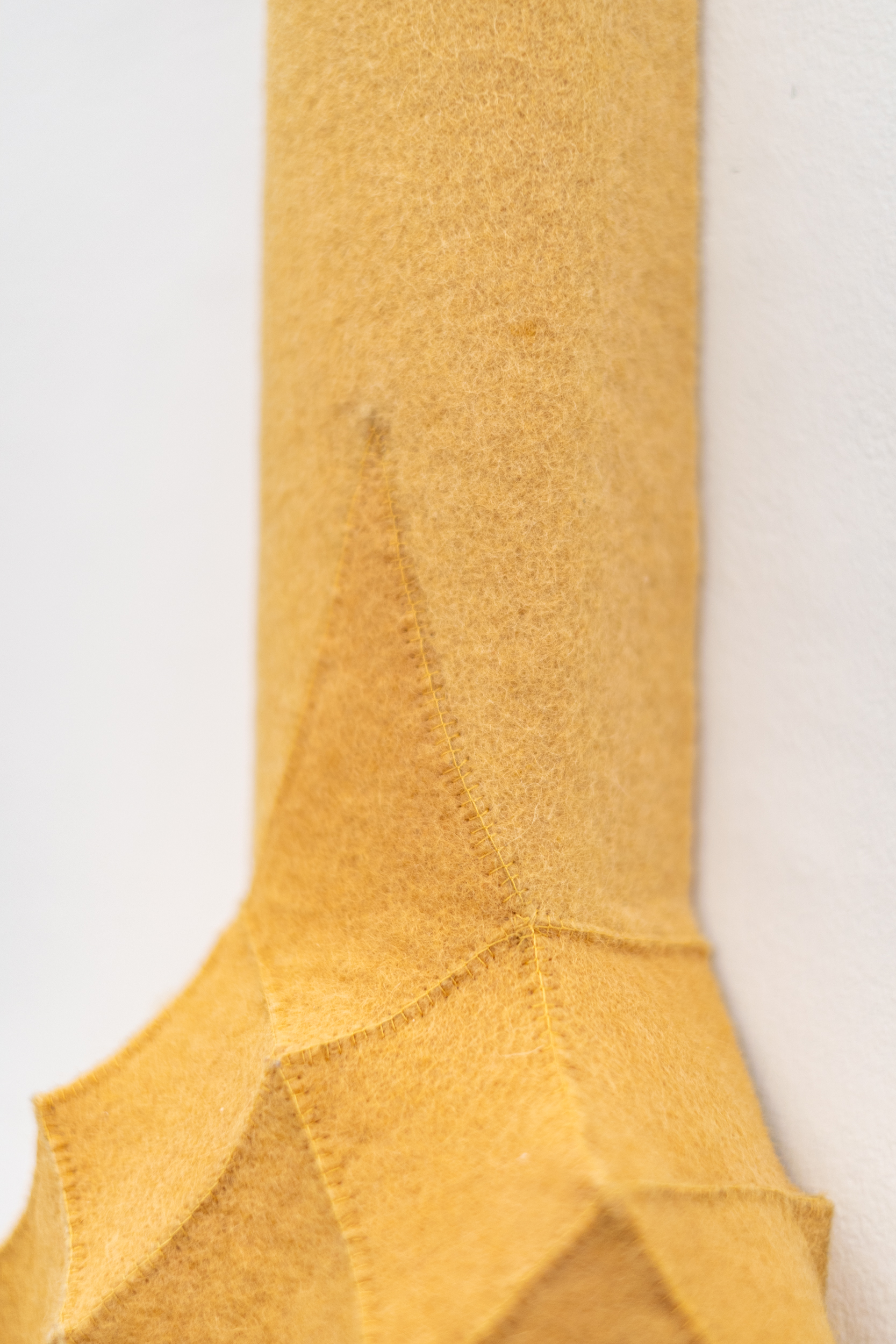 This contemporary fibre art wall hanging is by Chung-Im Kim.The eclectic, superbly handcrafted artwork of this Canadian artist has garnered her international recognition and acclaim. Inspired by her own rich heritage and intricate patterns found in nature, Kim uses industrial felt to create her wall hangings. This vertical piece in a rich golden yellow colour is made from small pieces of industrial felt sewn together and pulled taut to create a raised pattern and tension in the design. Kim works intuitively, allowing each module to help guide the next, building the shape as she goes. One of a series.