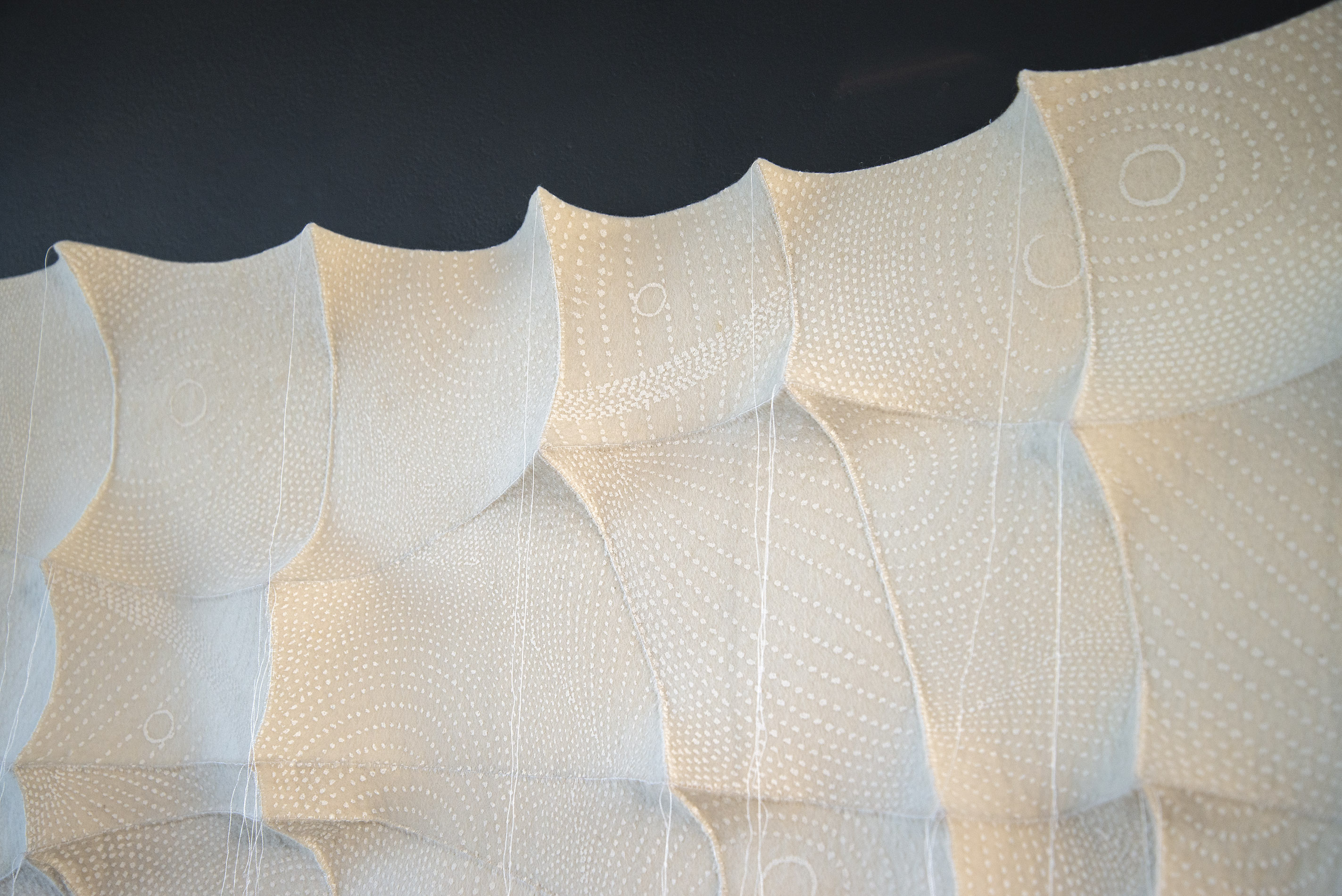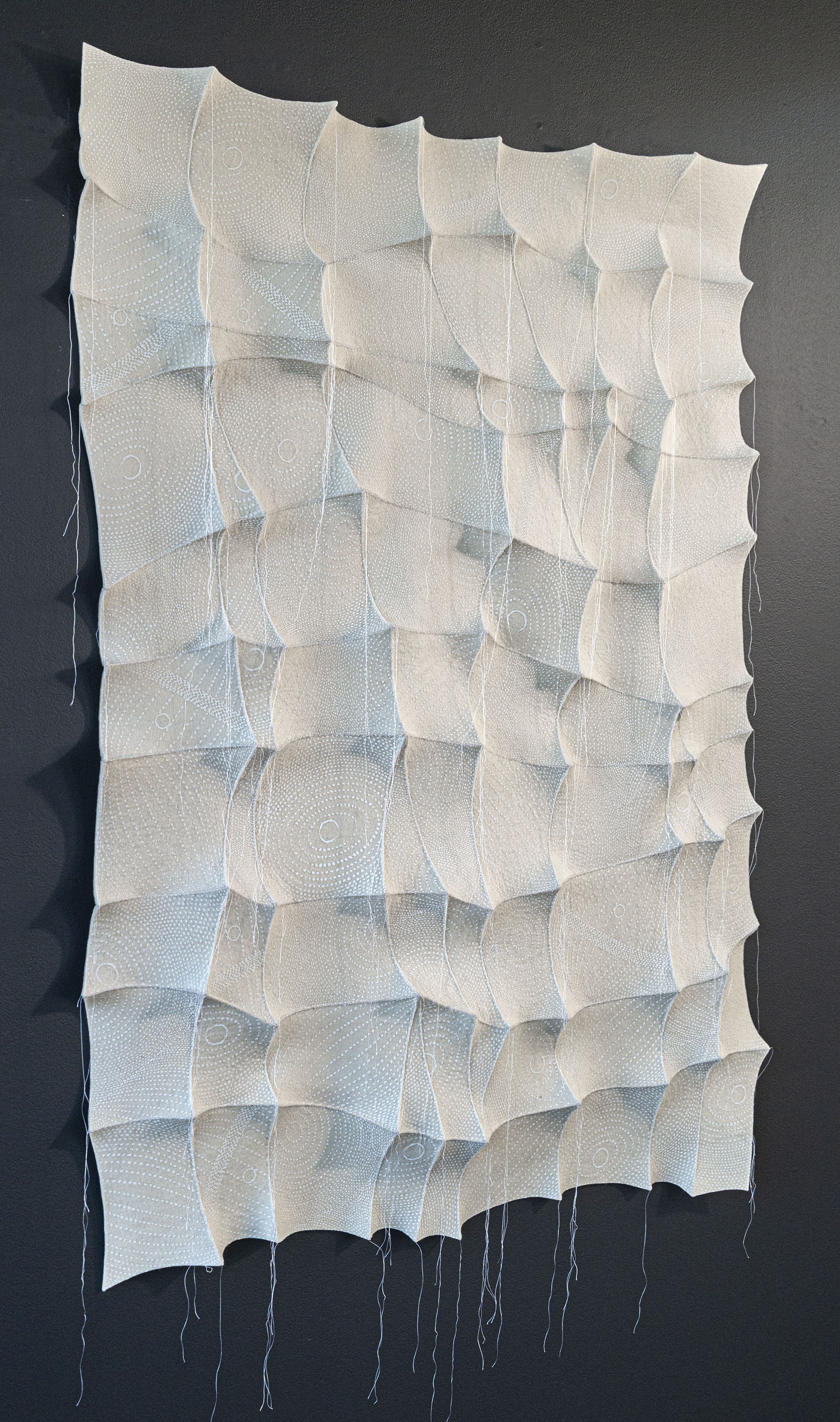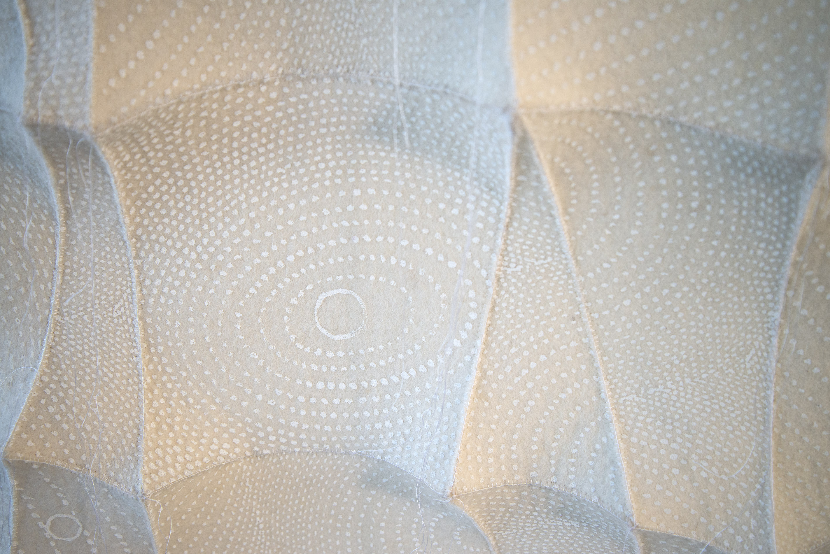 In this elegant monochromatic white tapestry by fabric artist Chung-Im Kim, finely detailed patterns swirl around the fabric. Kim’s organic form is inspired by the patterns she sees in nature. The white ink on white fabric provides a subtle texture. By sewing small pieces of industrial felt together that are then pulled taut, Kim creates a web-like 3-D effect. The Canadian artist’s work is contemporary but it is also rooted in the rich traditions of her Korean homeland.“(With New Dawn) I want to express the tranquillity and freshness, the elegance of the serenity.” Chung-Im Kim