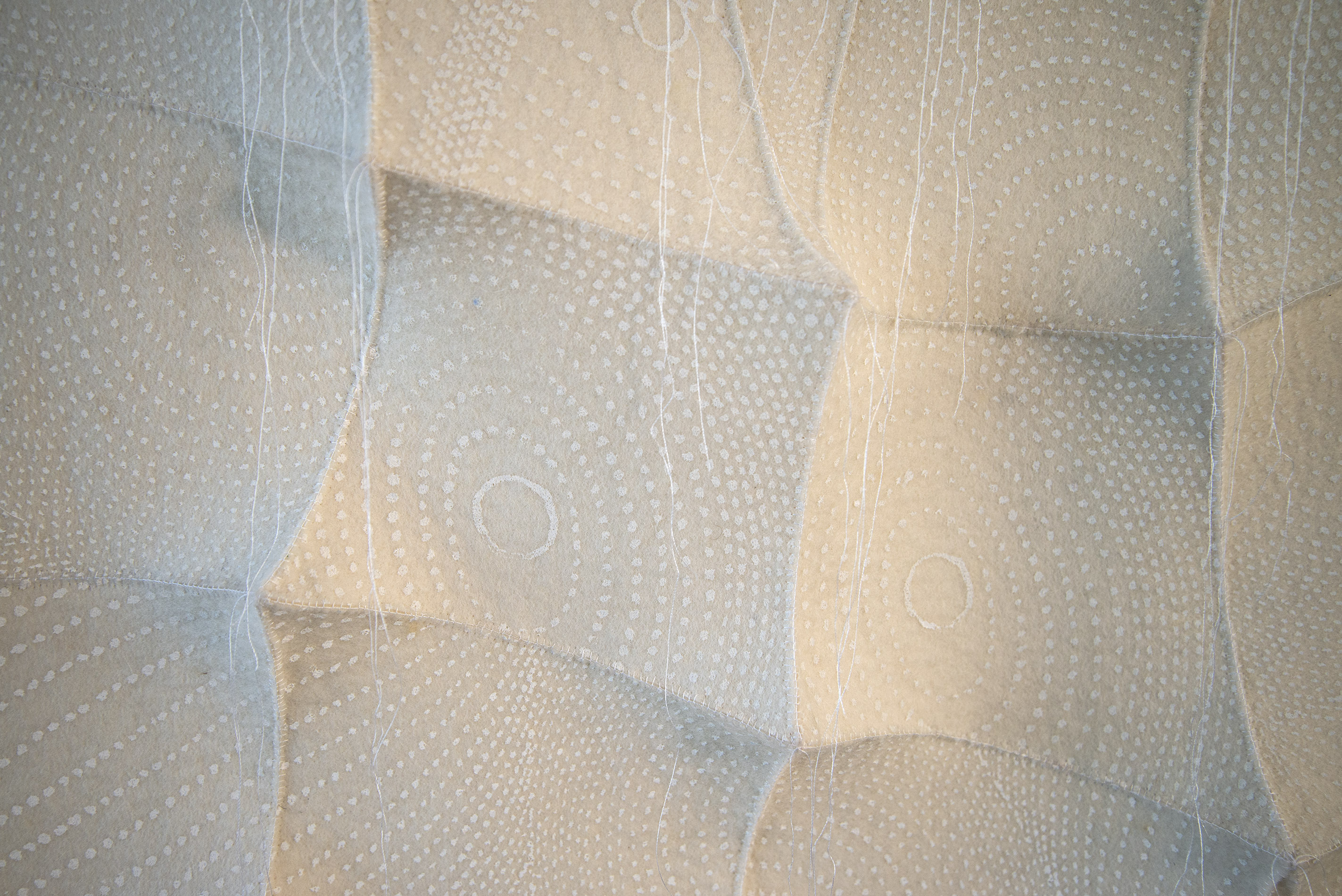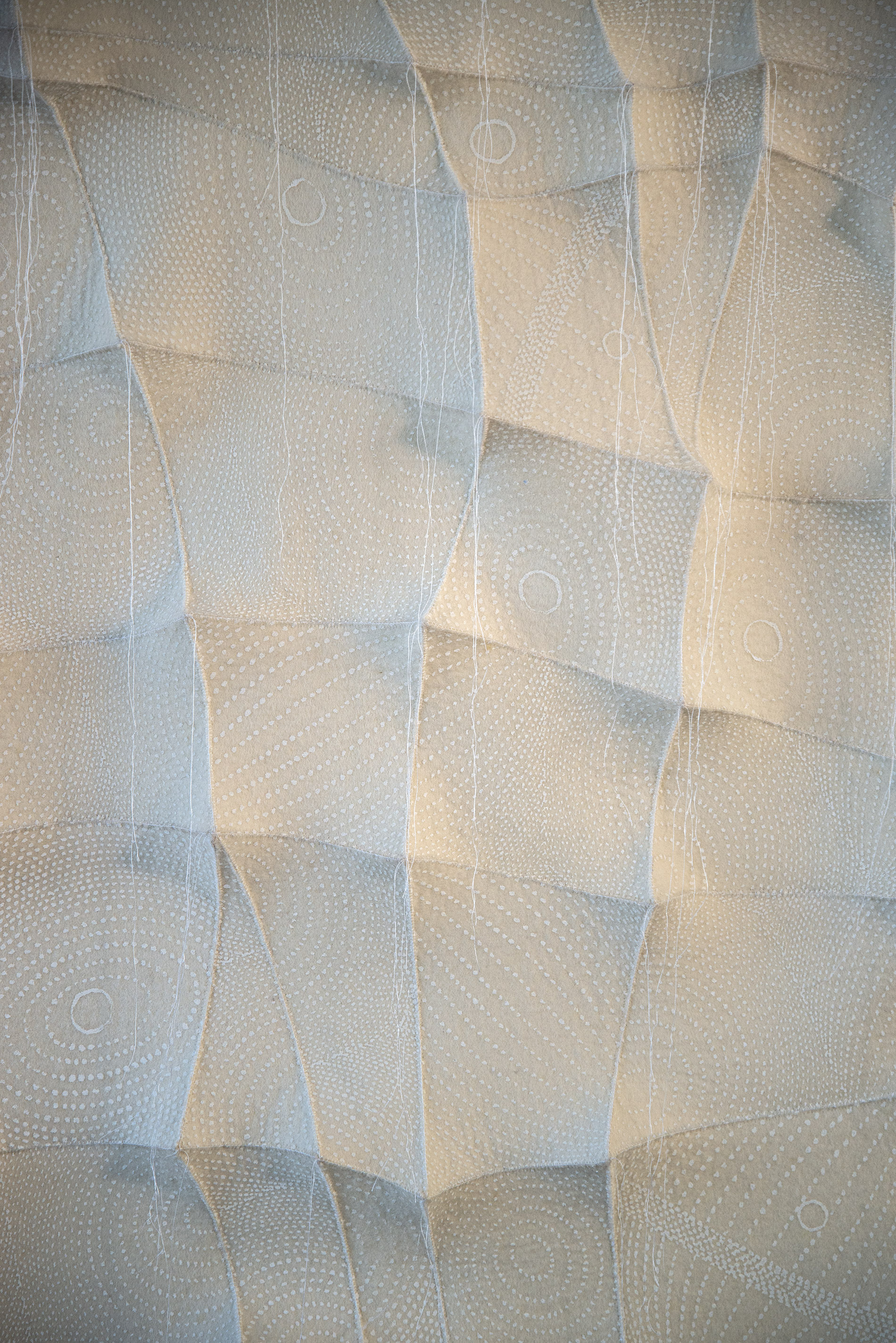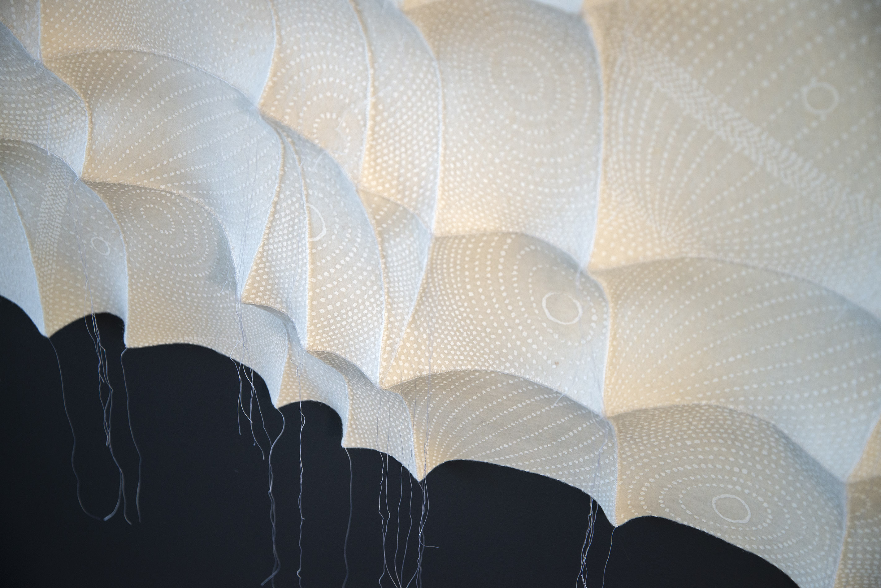 In this elegant monochromatic white tapestry by fabric artist Chung-Im Kim, finely detailed patterns swirl around the fabric. Kim’s organic form is inspired by the patterns she sees in nature. The white ink on white fabric provides a subtle texture. By sewing small pieces of industrial felt together that are then pulled taut, Kim creates a web-like 3-D effect. The Canadian artist’s work is contemporary but it is also rooted in the rich traditions of her Korean homeland.“(With New Dawn) I want to express the tranquillity and freshness, the elegance of the serenity.” Chung-Im Kim