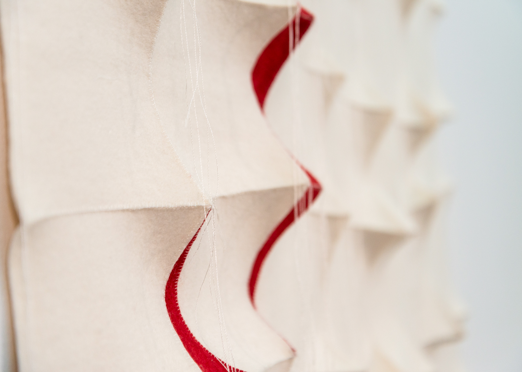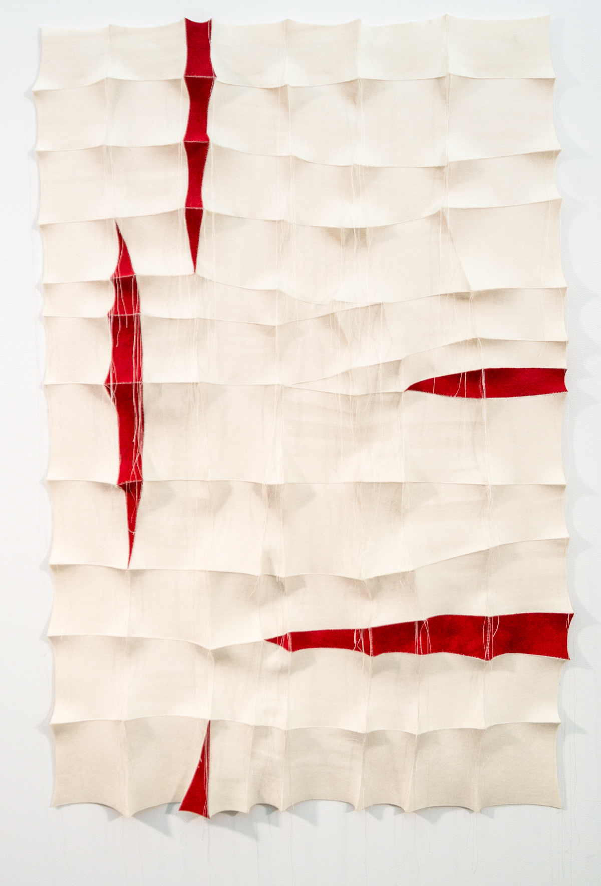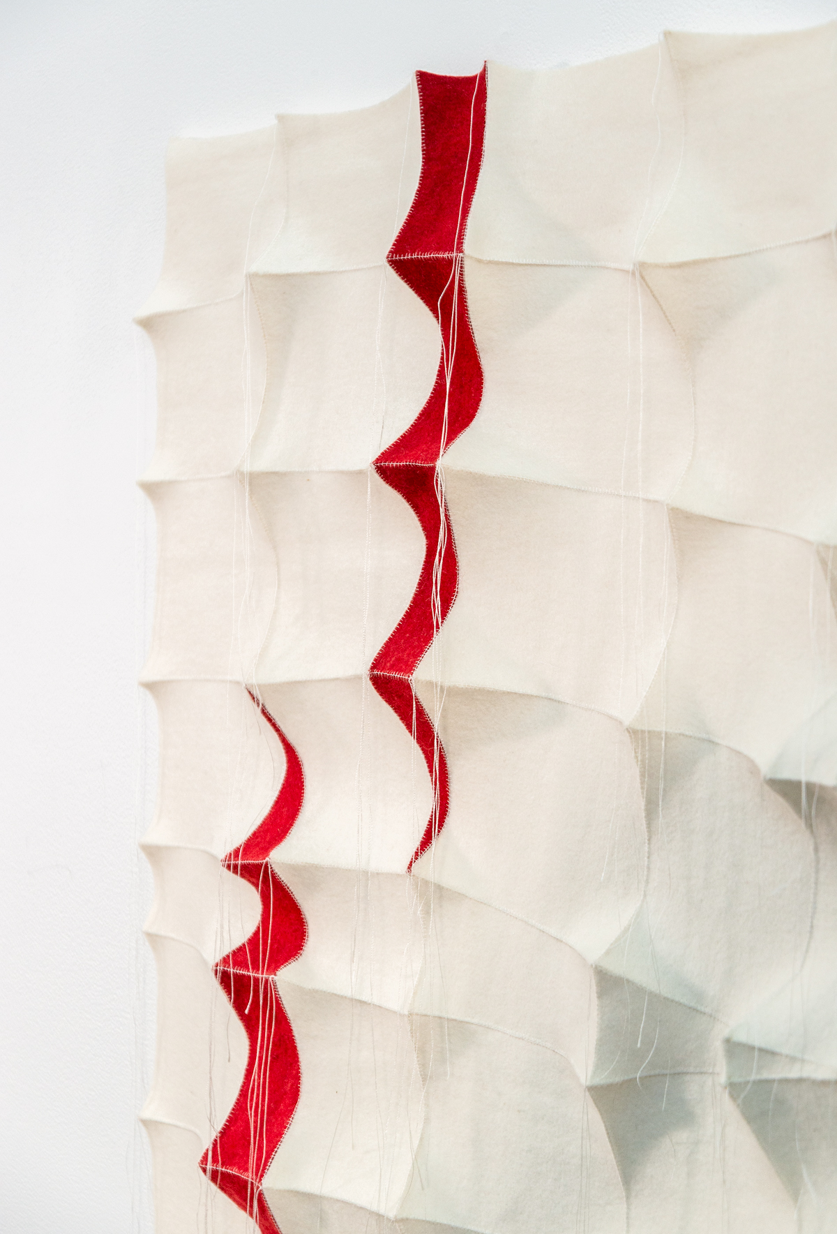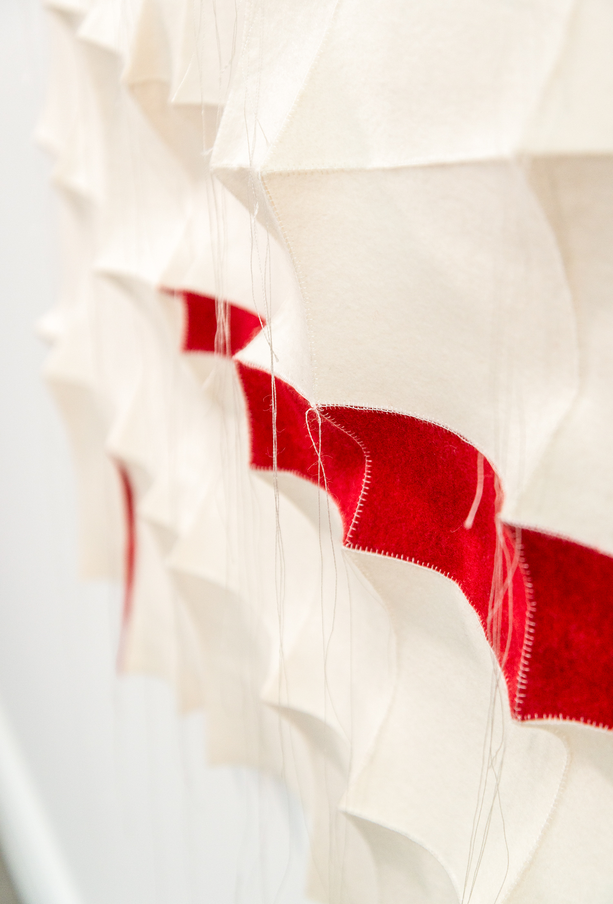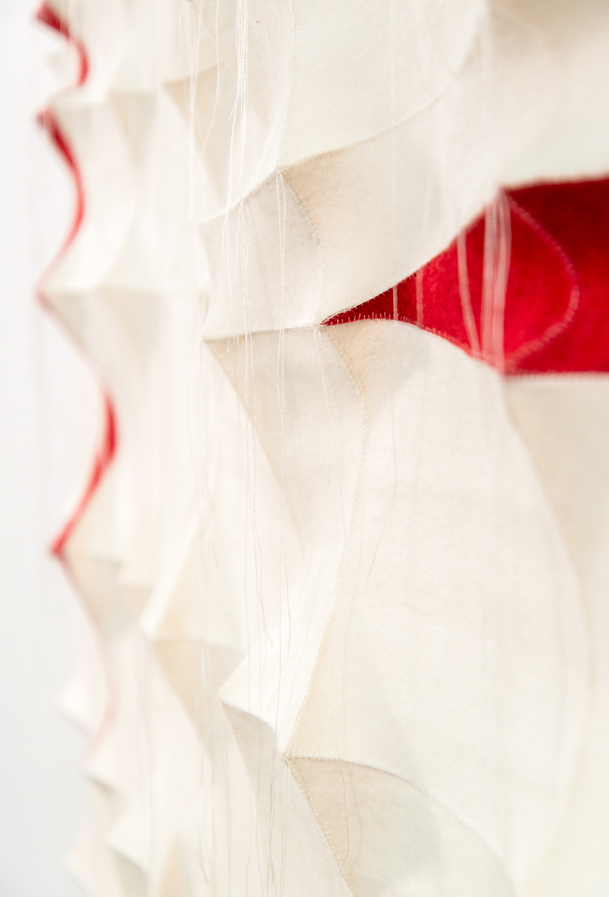 The natural world provides infinite inspiration for the beautifully textured work of Chung-Im Kim. The fabric artist creates unique wall hangings by sewing tiny pieces of industrial felt together, pulled taut to add tension to the design and a 3D effect.This piece in creamy white is highlighted by organic shapes in a deep red that provide dramatic contrast. The first in a series.