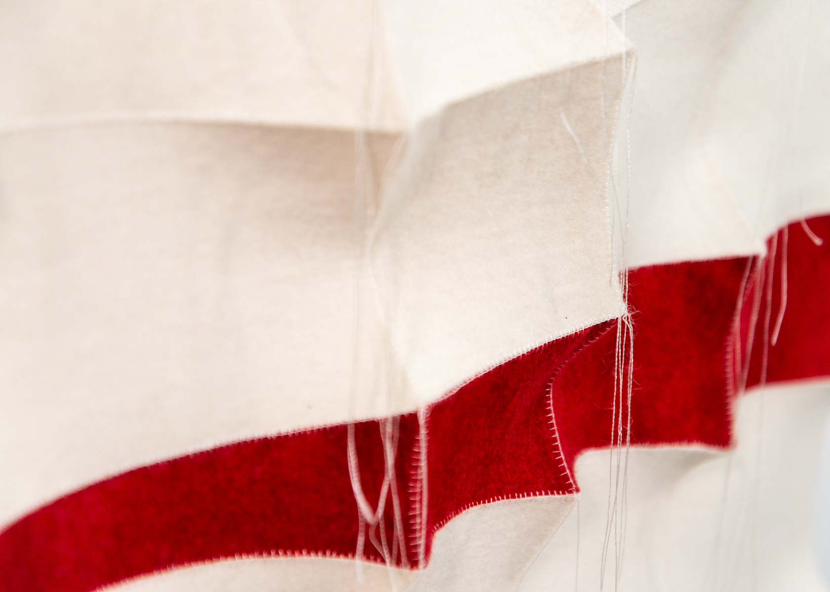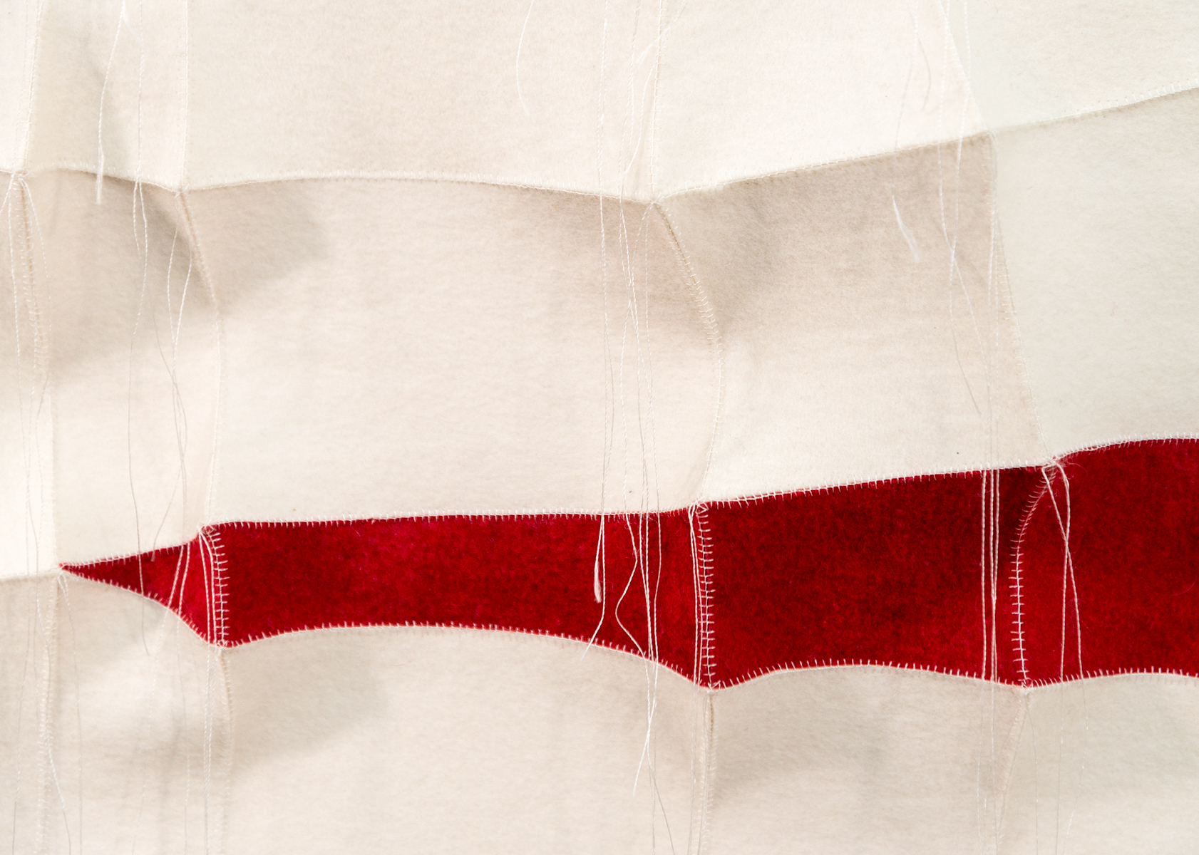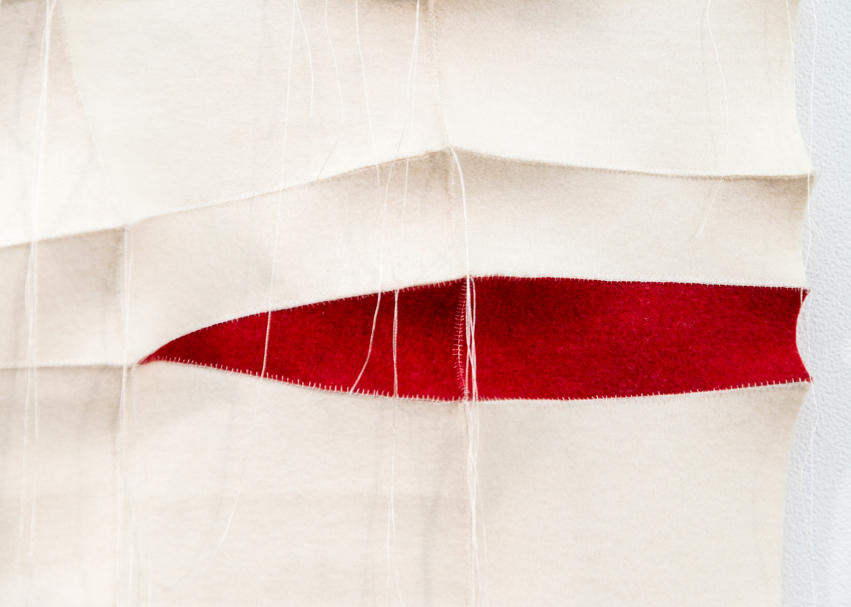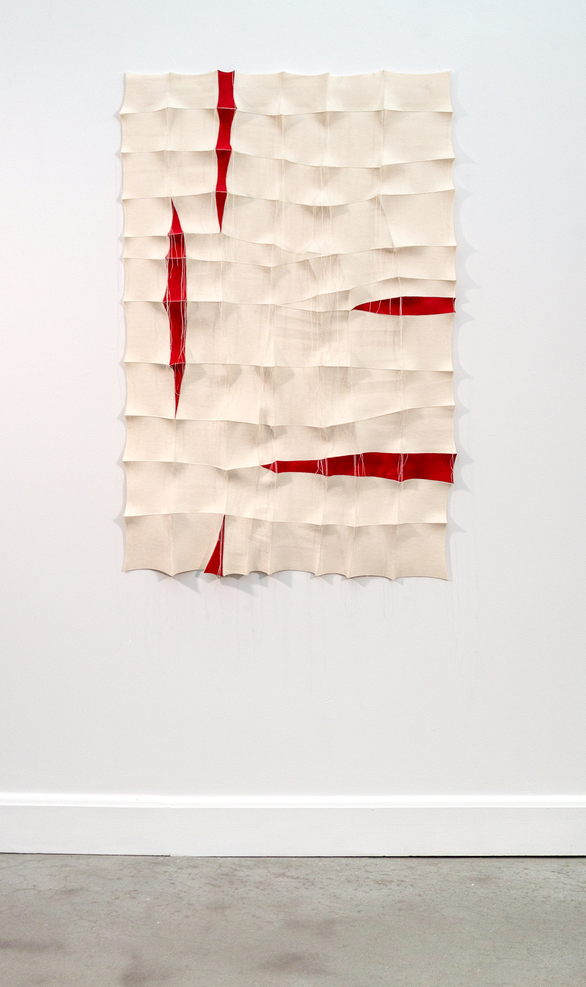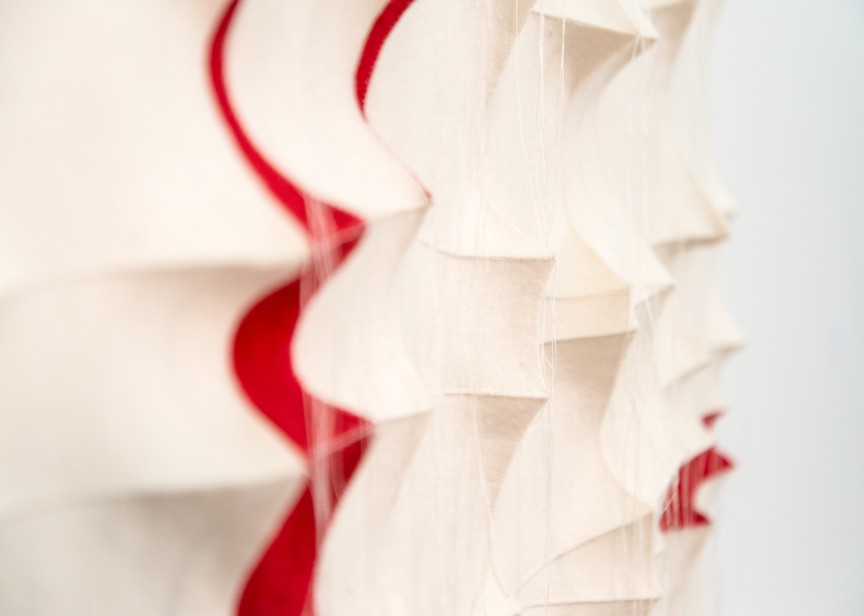 The natural world provides infinite inspiration for the beautifully textured work of Chung-Im Kim. The fabric artist creates unique wall hangings by sewing tiny pieces of industrial felt together, pulled taut to add tension to the design and a 3D effect.This piece in creamy white is highlighted by organic shapes in a deep red that provide dramatic contrast. The first in a series.