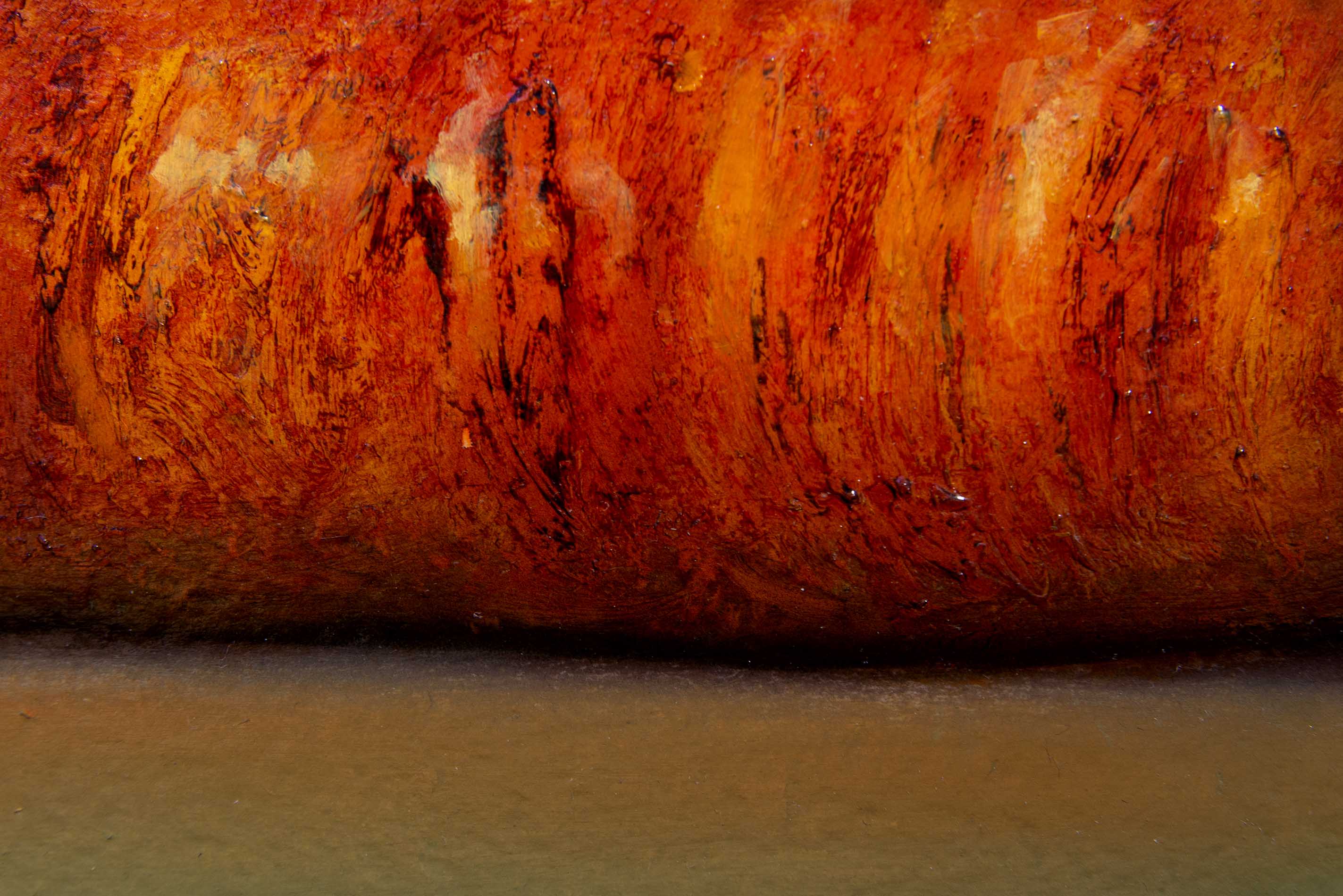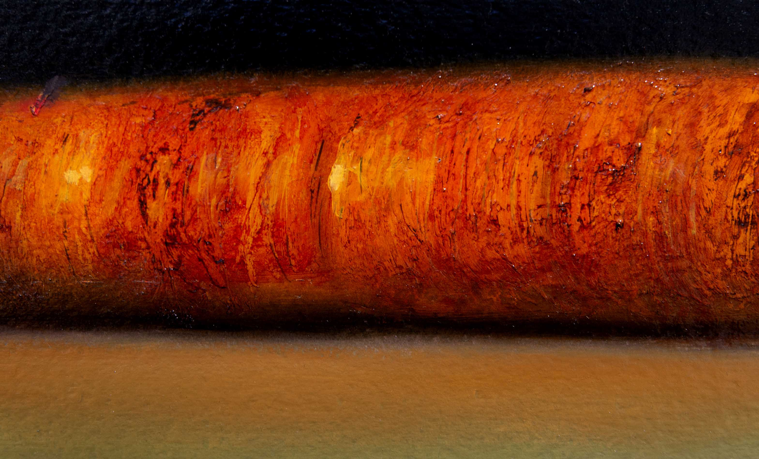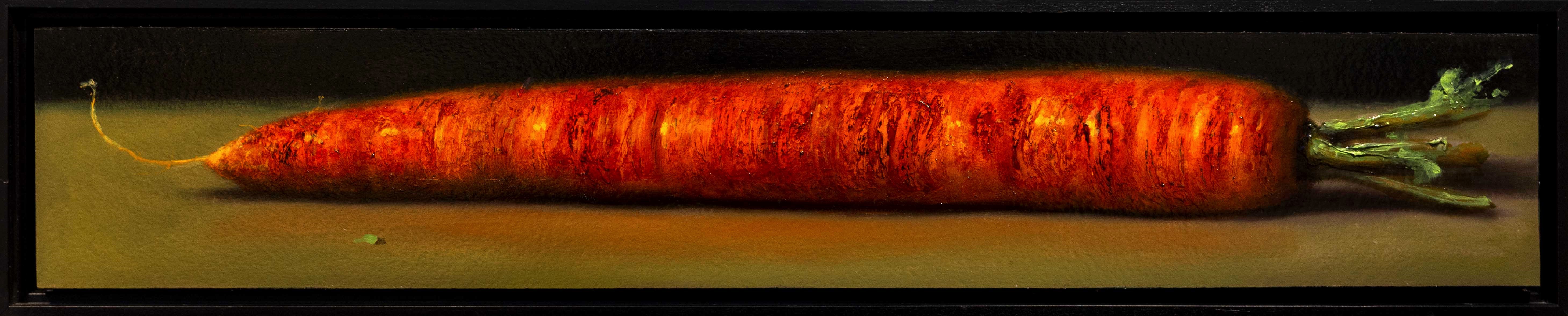 This realistic oil painting is a still life by Ciba Karisik.Lauded internationally for his remarkably detailed and realistic paintings, Ciba Karisik’s compelling work has charmed collectors and critics alike. Trained in the trompe l’oeil technique (‘fool the eye’), Karisik’s rich colour palette and superb use of light is reminiscent of the European masters. This horizontal view of a single raw orange carrot pops against the black and earthy backdrop. This is one of a series of still lifes Karisik created--portraits that capture a simple object.