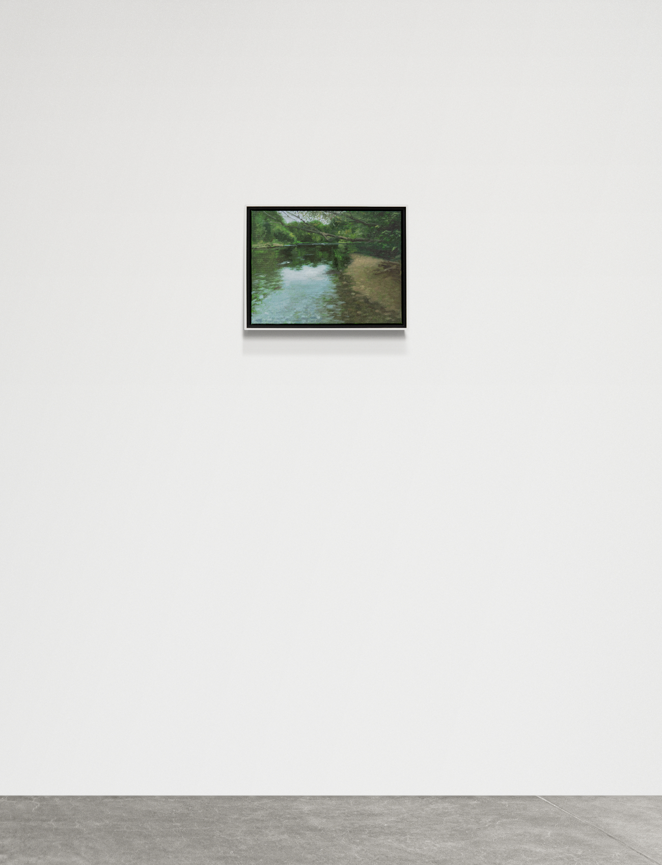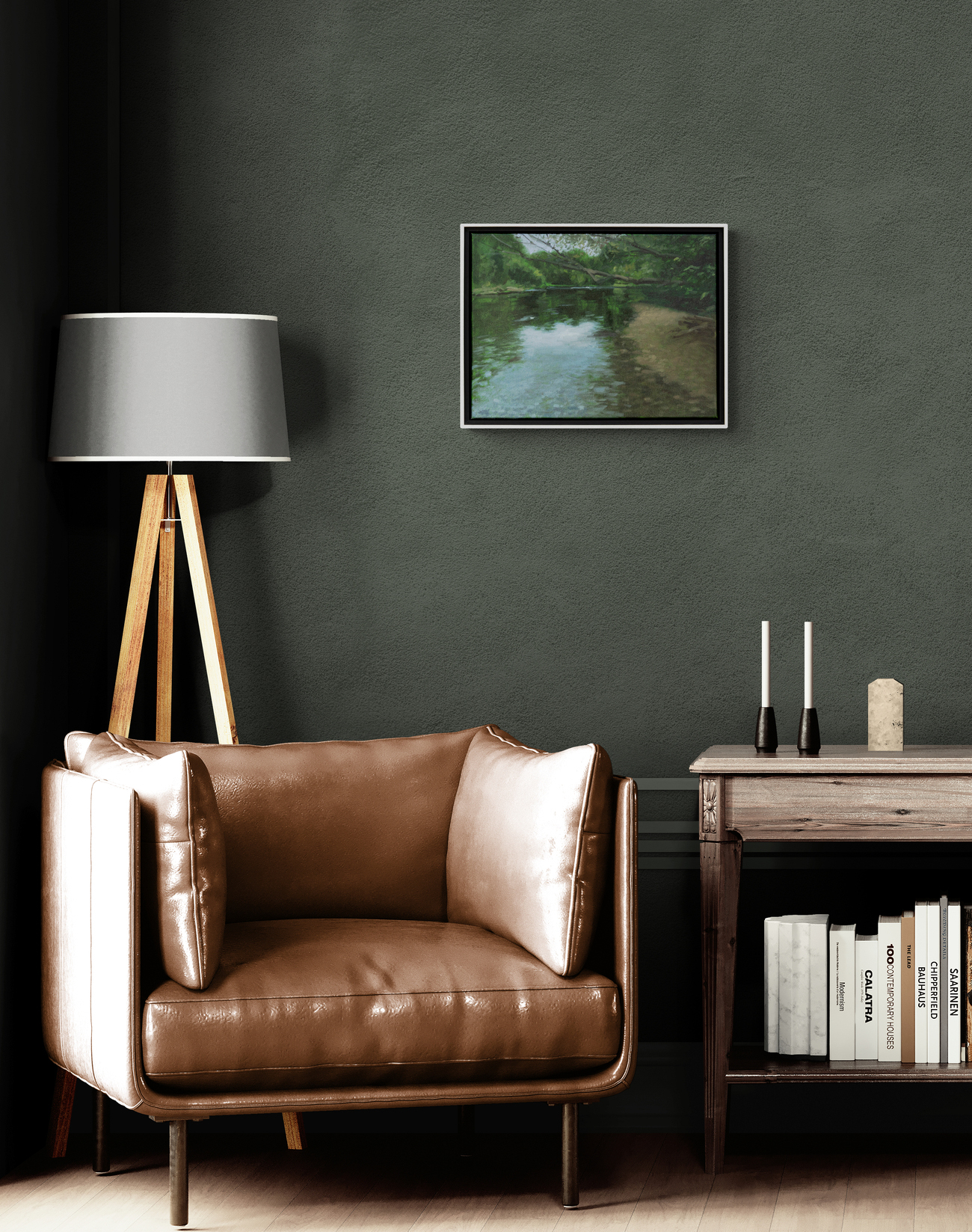 The reflective mirror-like surface of the water is framed by lush greenery—a forest edges the landscape. Expressive brushstrokes in a rich palette of dark greens, gray-blue, white and black bring the work to life. Karisik’s work is often inspired by the time he spends in nature.