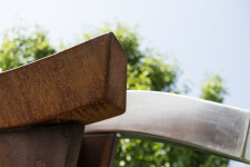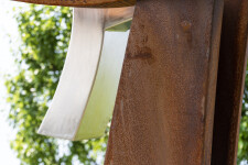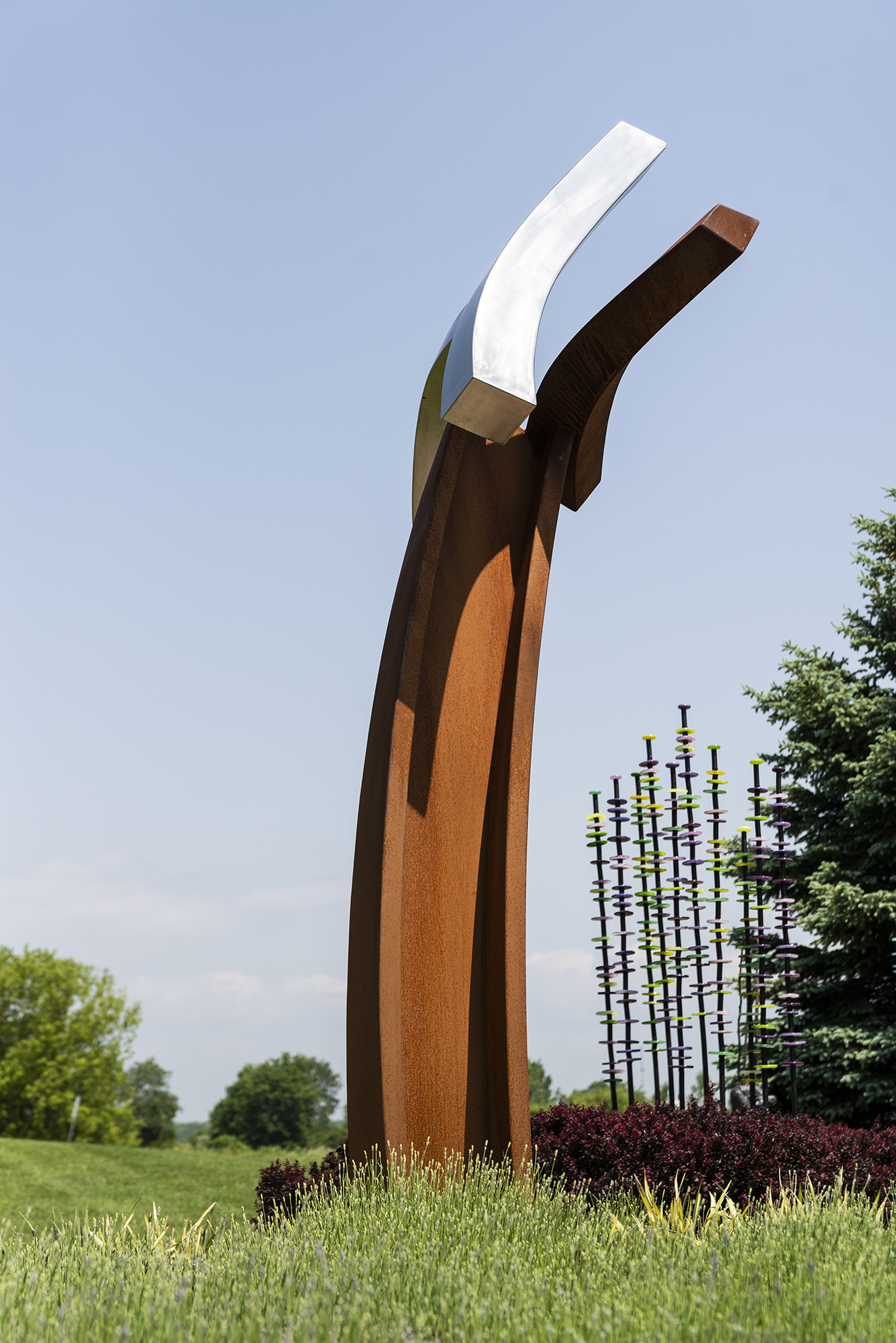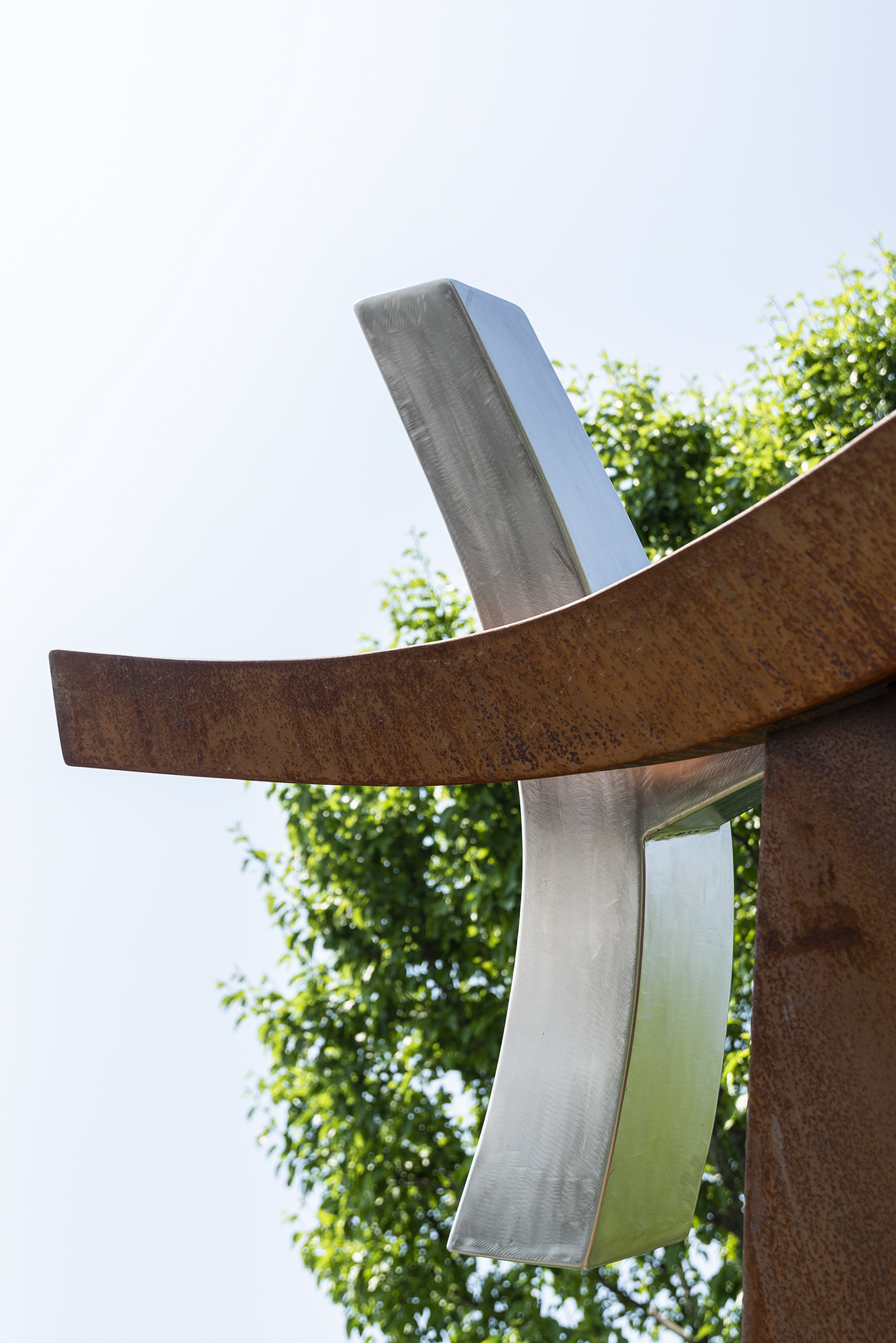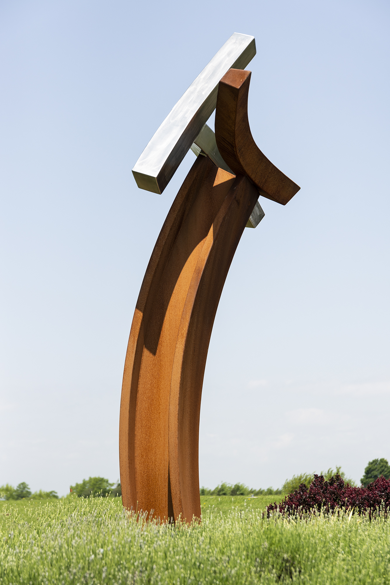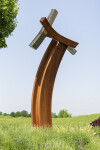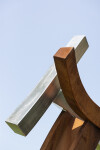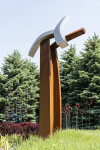 Millette is avant-garde—a uniquely talented sculptor who often uses nature, music, and dance as inspiration for his remarkable artwork. His extensive oeuvre favours metal as a medium and is mostly non-figurative in form. His sculptures share a common trait–a fluidity of motion that often suggests the graceful movement of a dancer. As such, the gestural expression of each piece is imbued with emotion. In this outdoor sculpture, a large, elegantly curved beam forged from corten steel arcs towards the sky. It appears to support three smaller curved beams attached to either side of the central beam—one in corten steel and two in highly polished stainless steel. ‘Convergence’ means ‘the coming together or unification’ of two or more points.