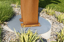 This contemporary abstract outdoor sculpture is forged from steel.
