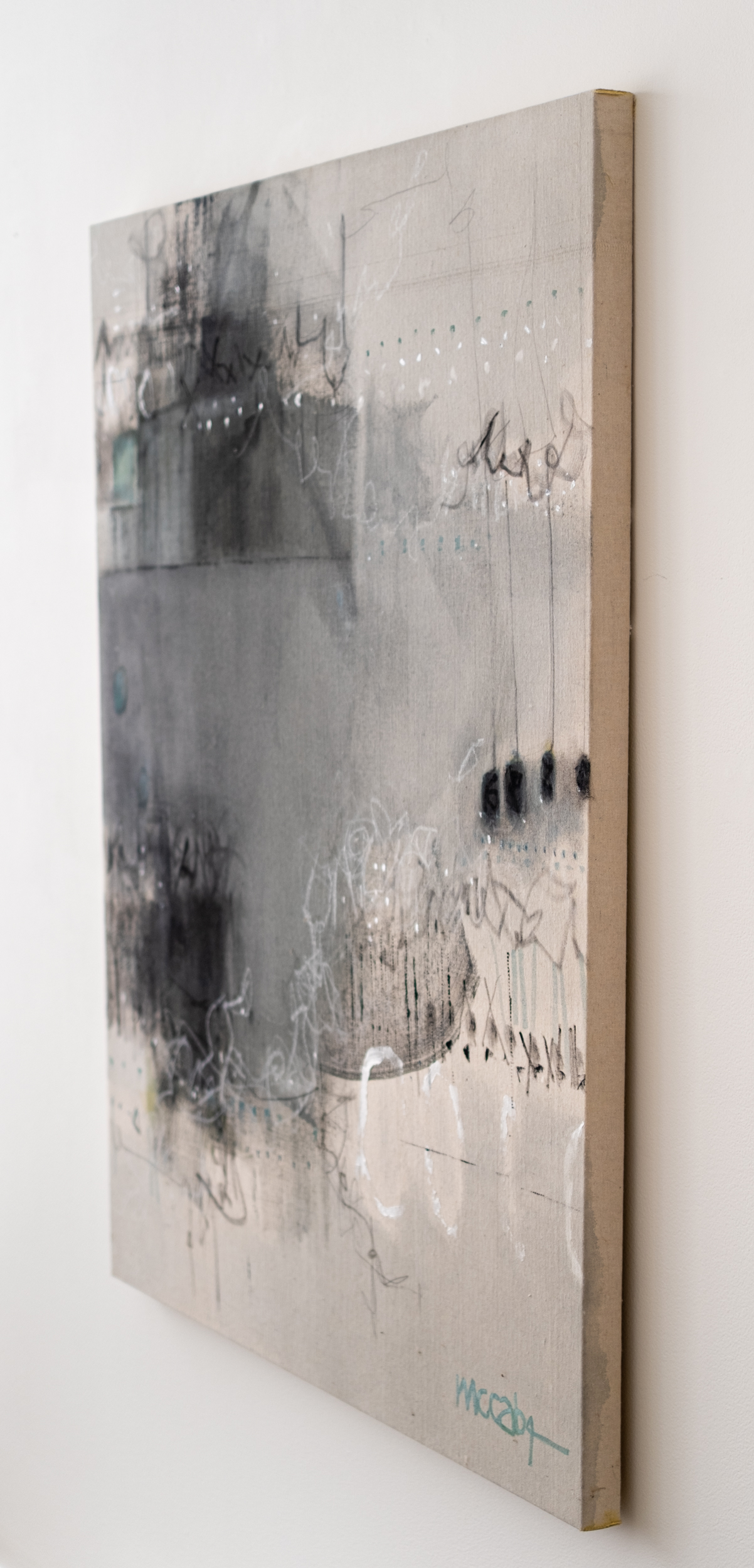 This contemporary acrylic abstract painting is rendered in black, gray and white.Layered textures, curated markings and muted tones of black and gray define the central image of this intriguing abstract piece. For more than three decades, claudia jean mccabe has been exploring the dynamic potential of abstraction and has developed a unique visual language that plays with colour, and lyrical form. The palette is muted—soft grays, a glimpse of teal blue contrasted with black and white.