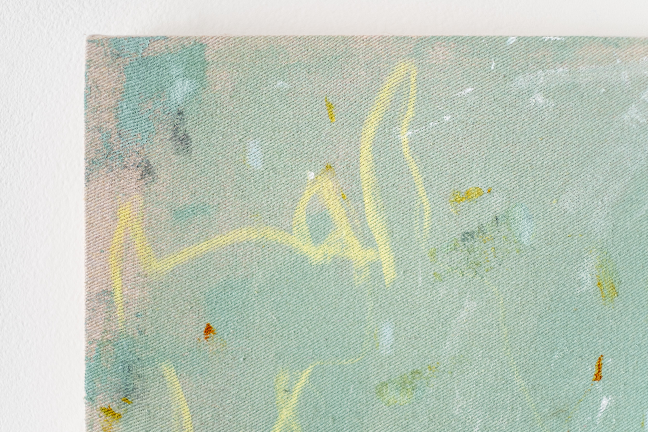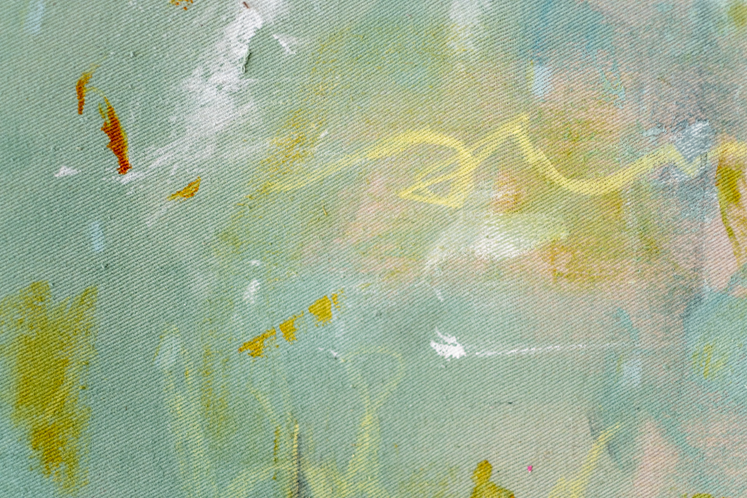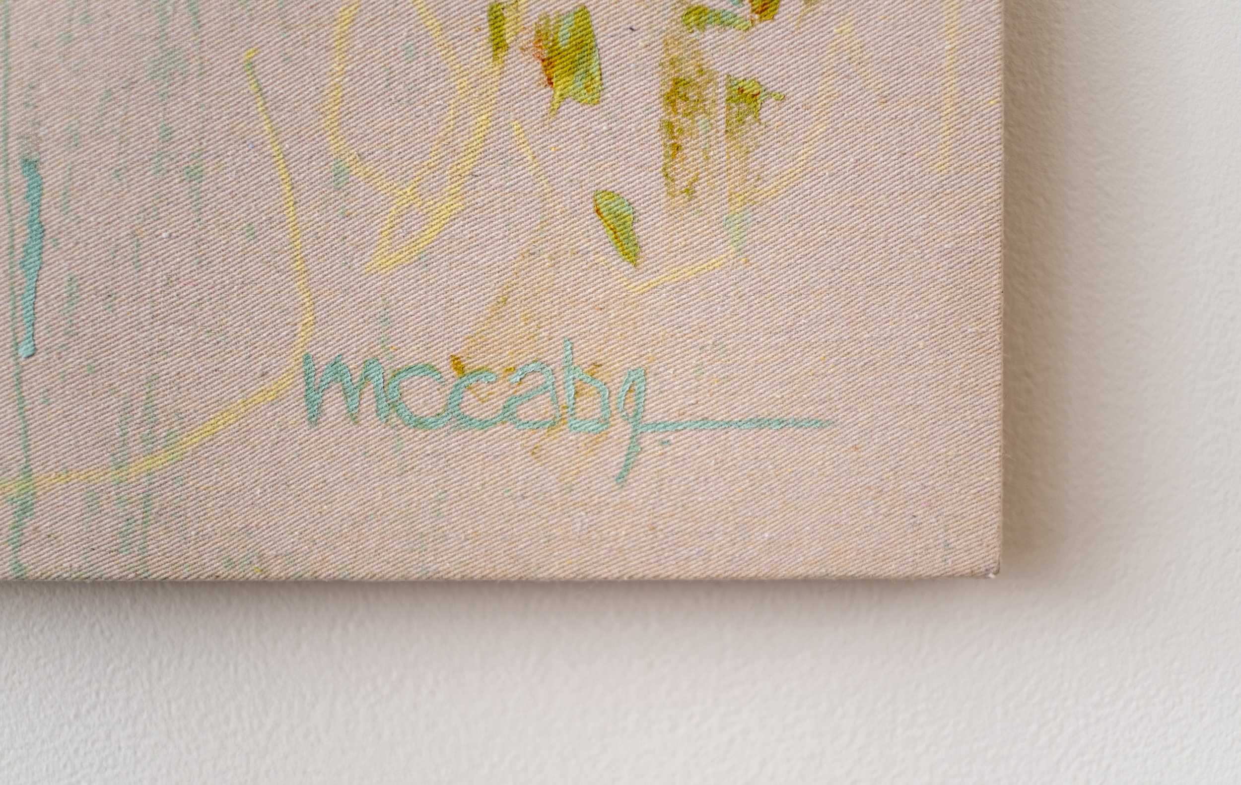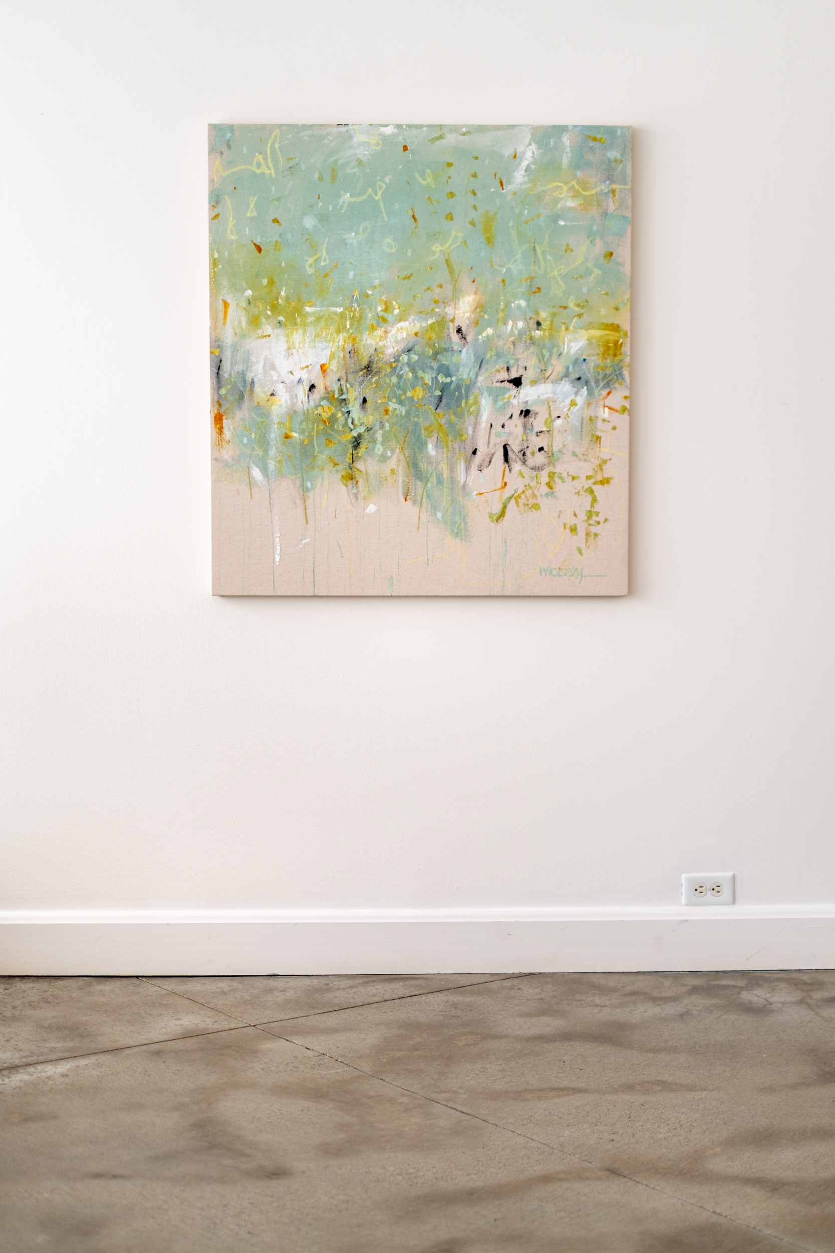 This contemporary acrylic abstract painting was inspired by nature.This joyful mélange of colour looks and feels like a moment in early spring has been captured on canvas. Claudia McCabe’s elegant and expressive compositions often recall the images and moods of nature. Equinox was created through layered shades of white, cream, muted greens, and blues. Delicate gestural brushstrokes and curated markings in black create movement and “suggest change, evoking the quiet energy of shifting seasons.” The backdrop of raw canvas is grounding and adds warmth.