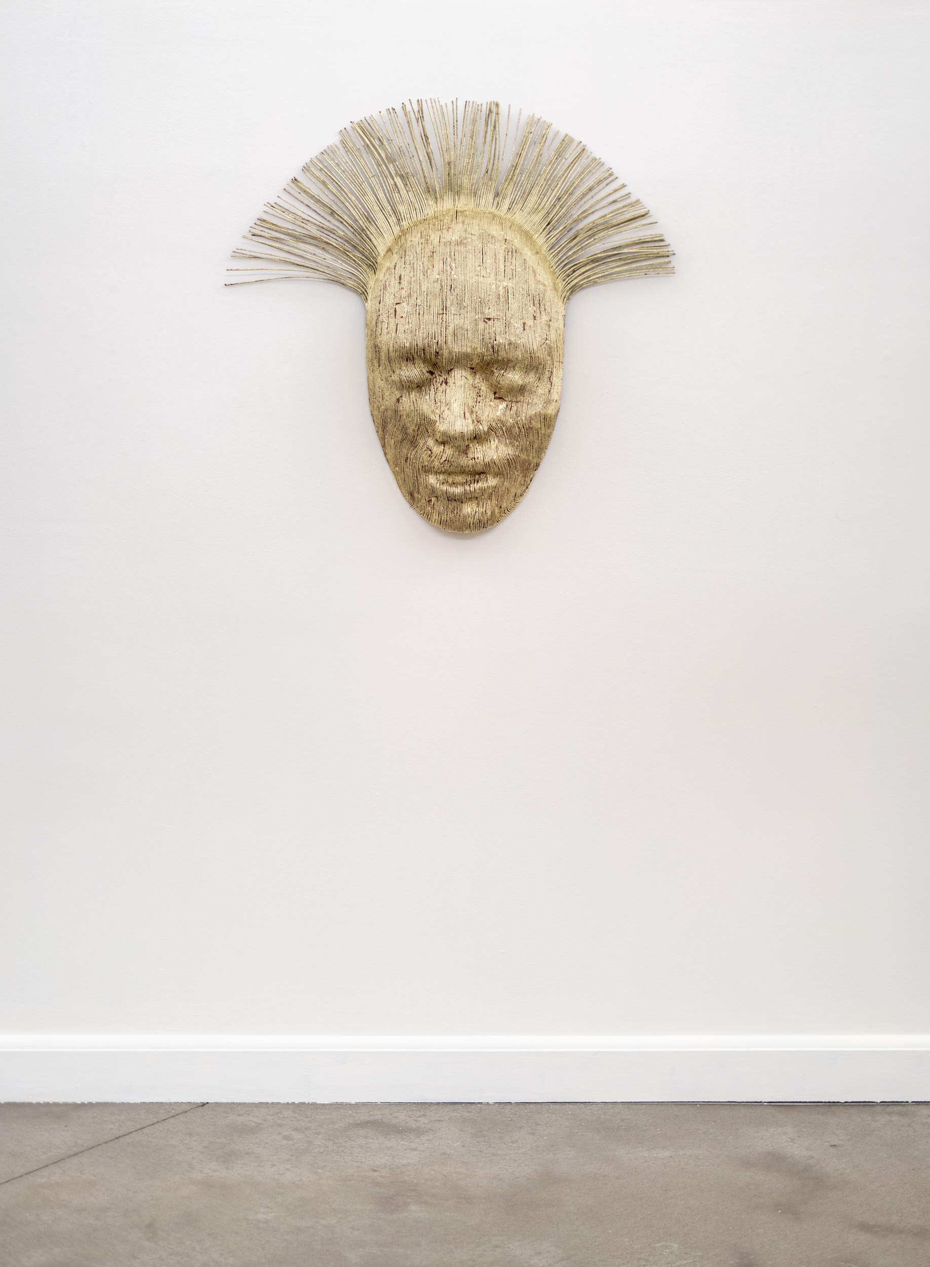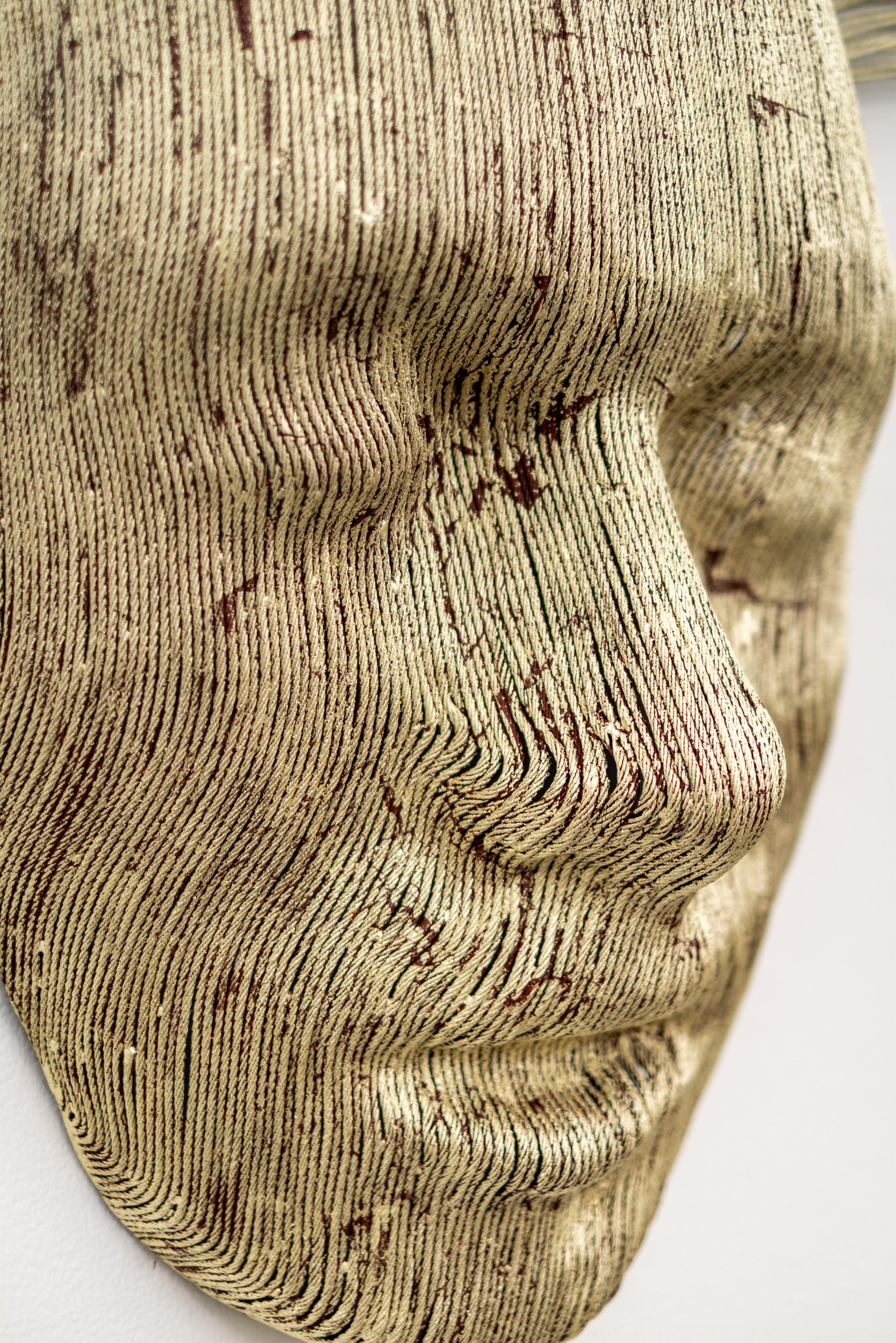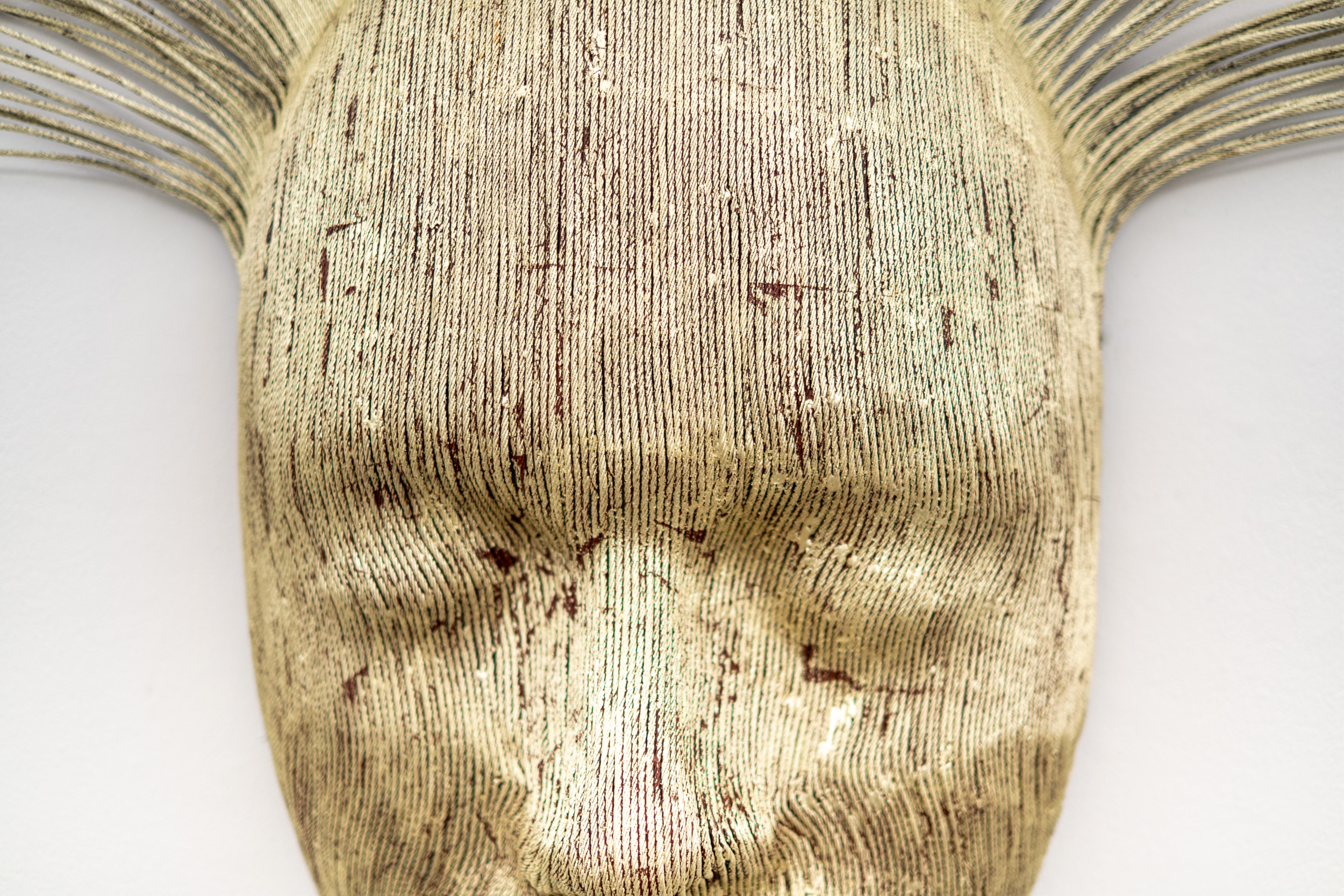 This contemporary sculpture is a mask forged from air craft cable and then carefully gilded with gold leaf.Dale Dunning is considered a masterful sculptor, and his work can be found throughout Canada. Known for his superb craftsmanship, Dunning likes to re-purpose materials—in this case, fine aircraft cables are gilded and used to create this stunning mask of a human head. Its 'hair’ appears to act as a crown. To Dunning, the head is a powerful and beautiful metaphor for human experience.