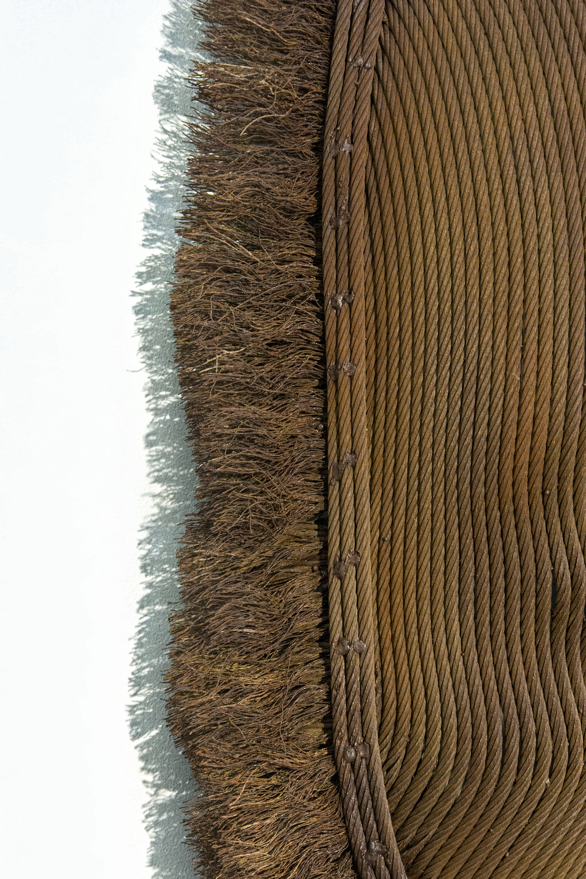A mask of steel aircraft cable is framed by a halo of unwound ends. Patinated in dark rust, the wall sculpture by Dale Dunning has a moody, weathered appearance. Merriam-Webster dictionary defines Nimbus as: "an indication (such as a circle) of radiant light or glory about the head of a drawn or sculptured divinity, saint, or sovereign"