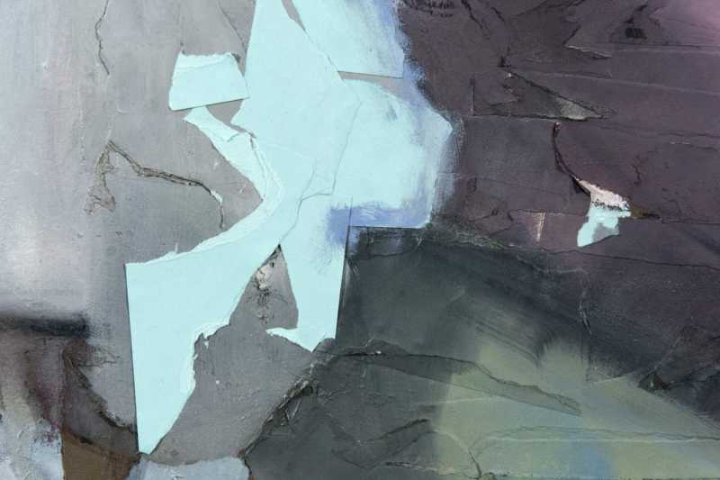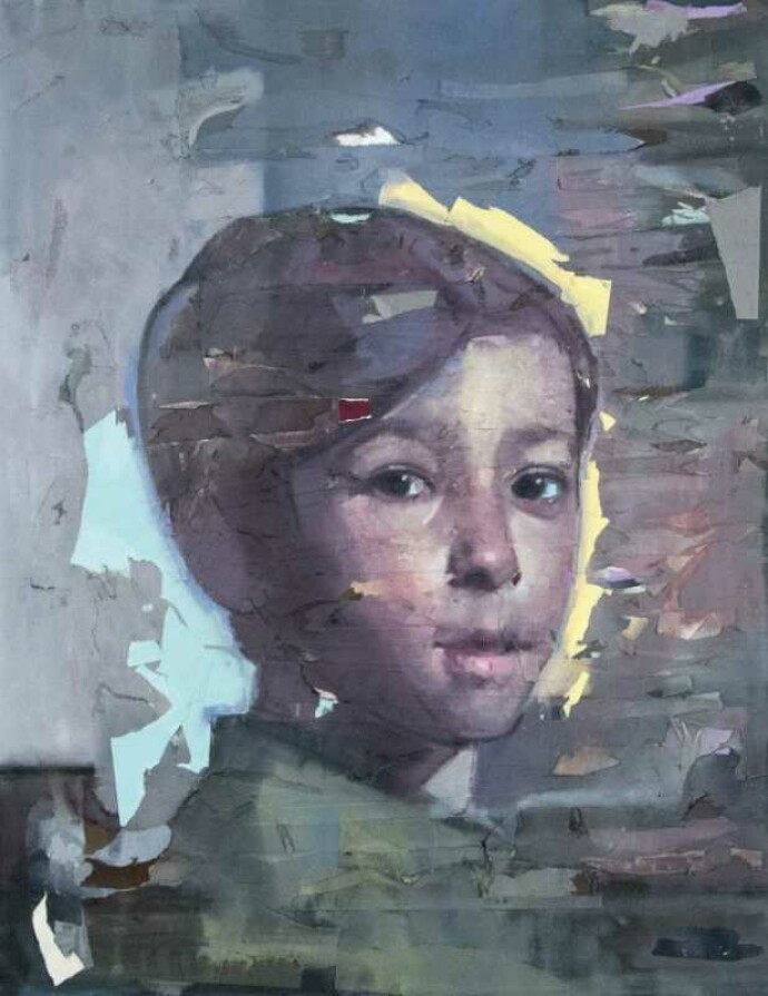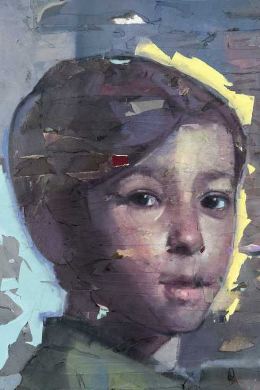 This collage and mixed media portrait by Dan Hughes captures a moment in the young life of a child. Realistically rendered the figure is framed in warm grey, pale blue and yellow.