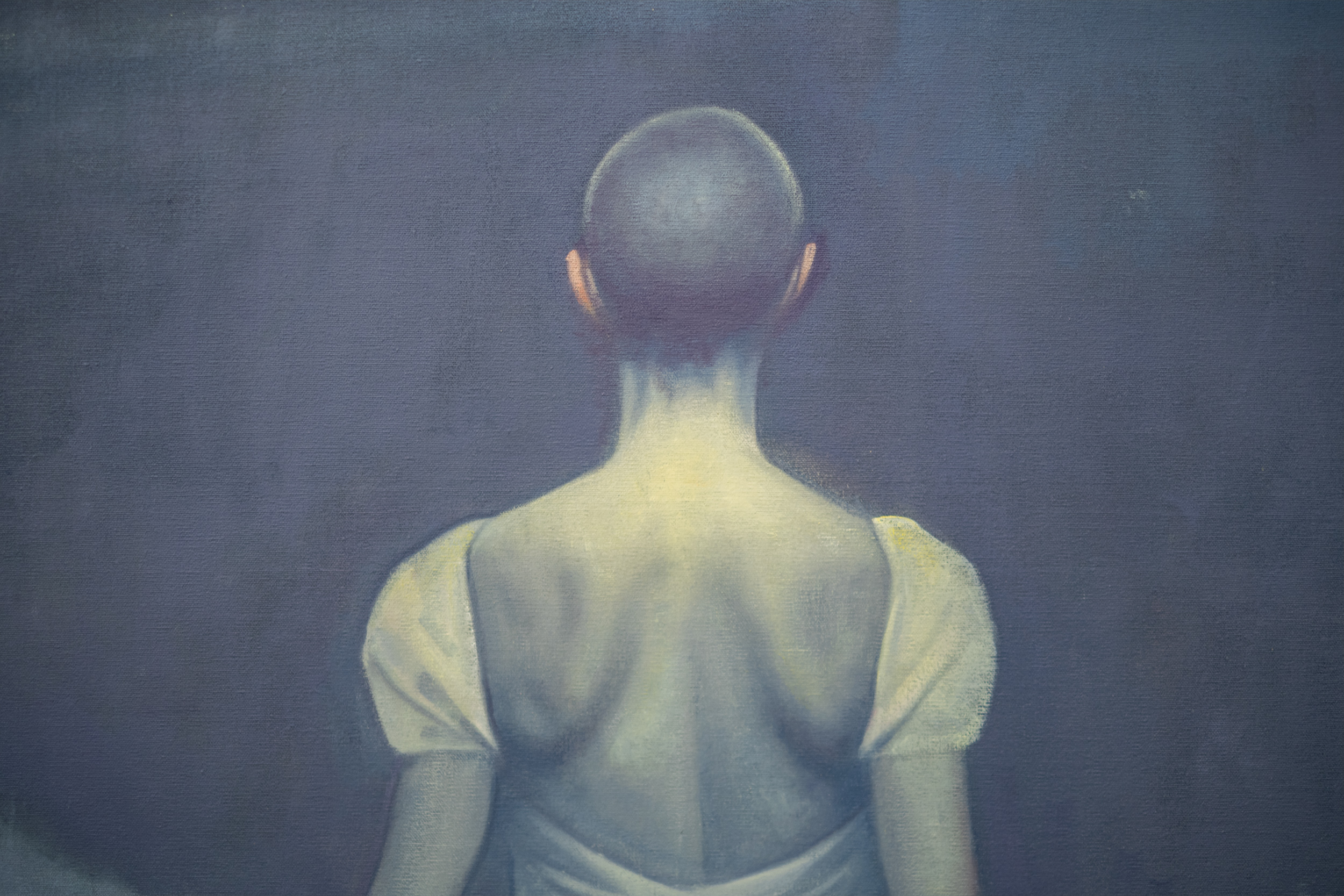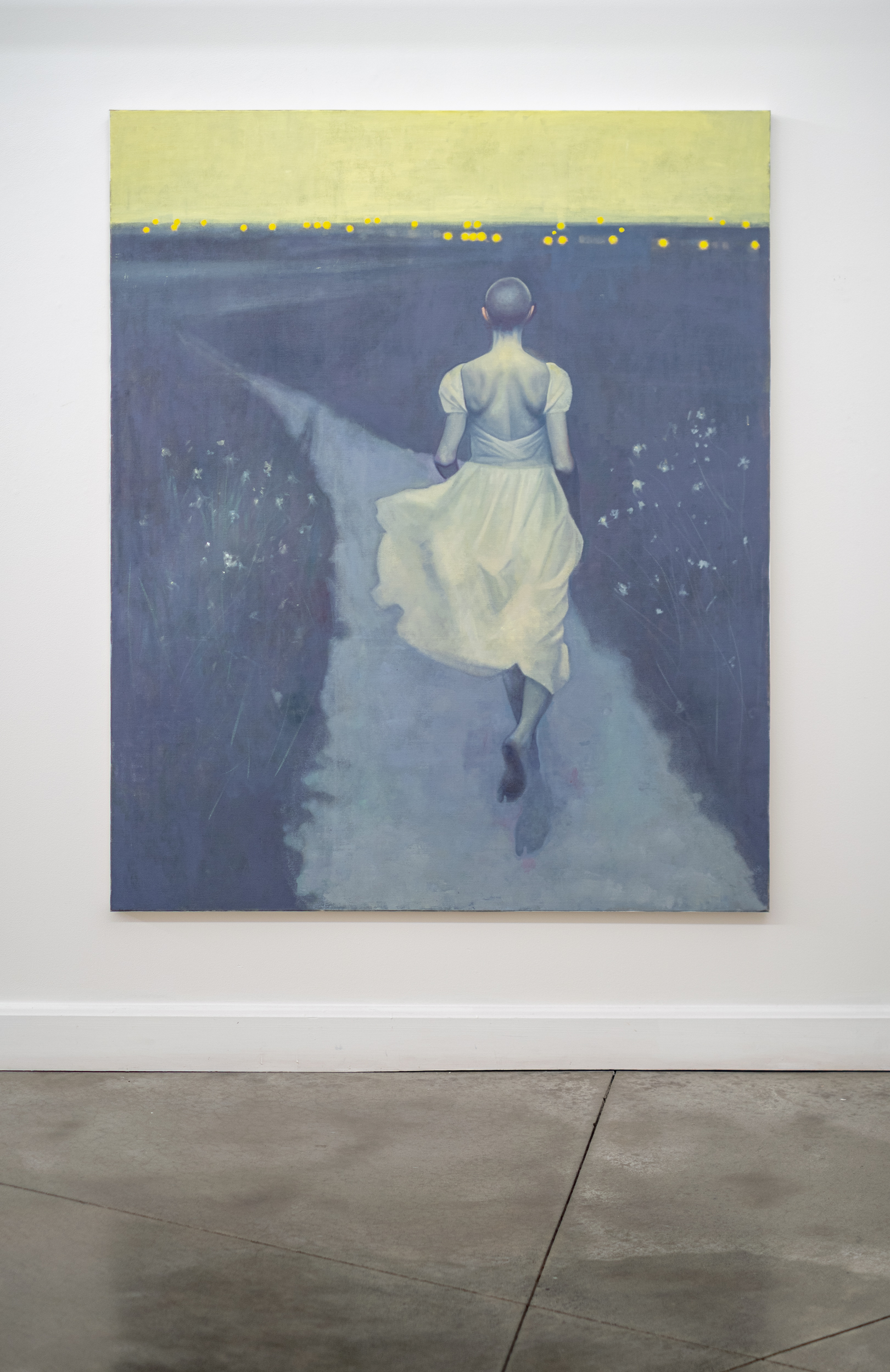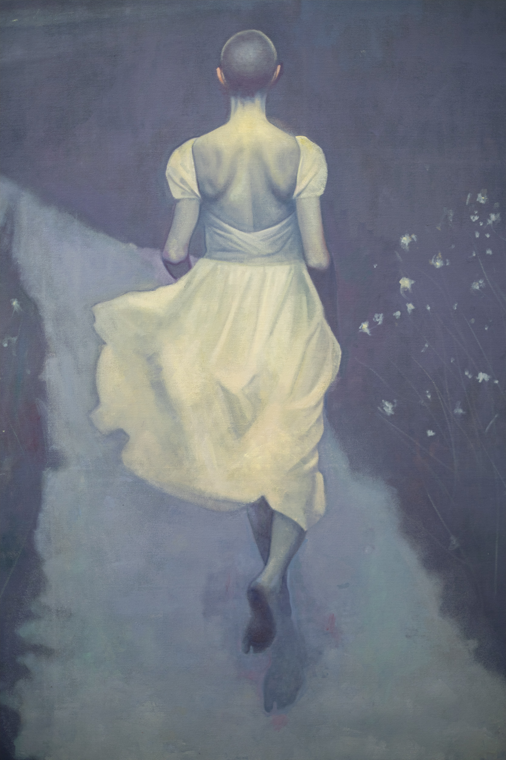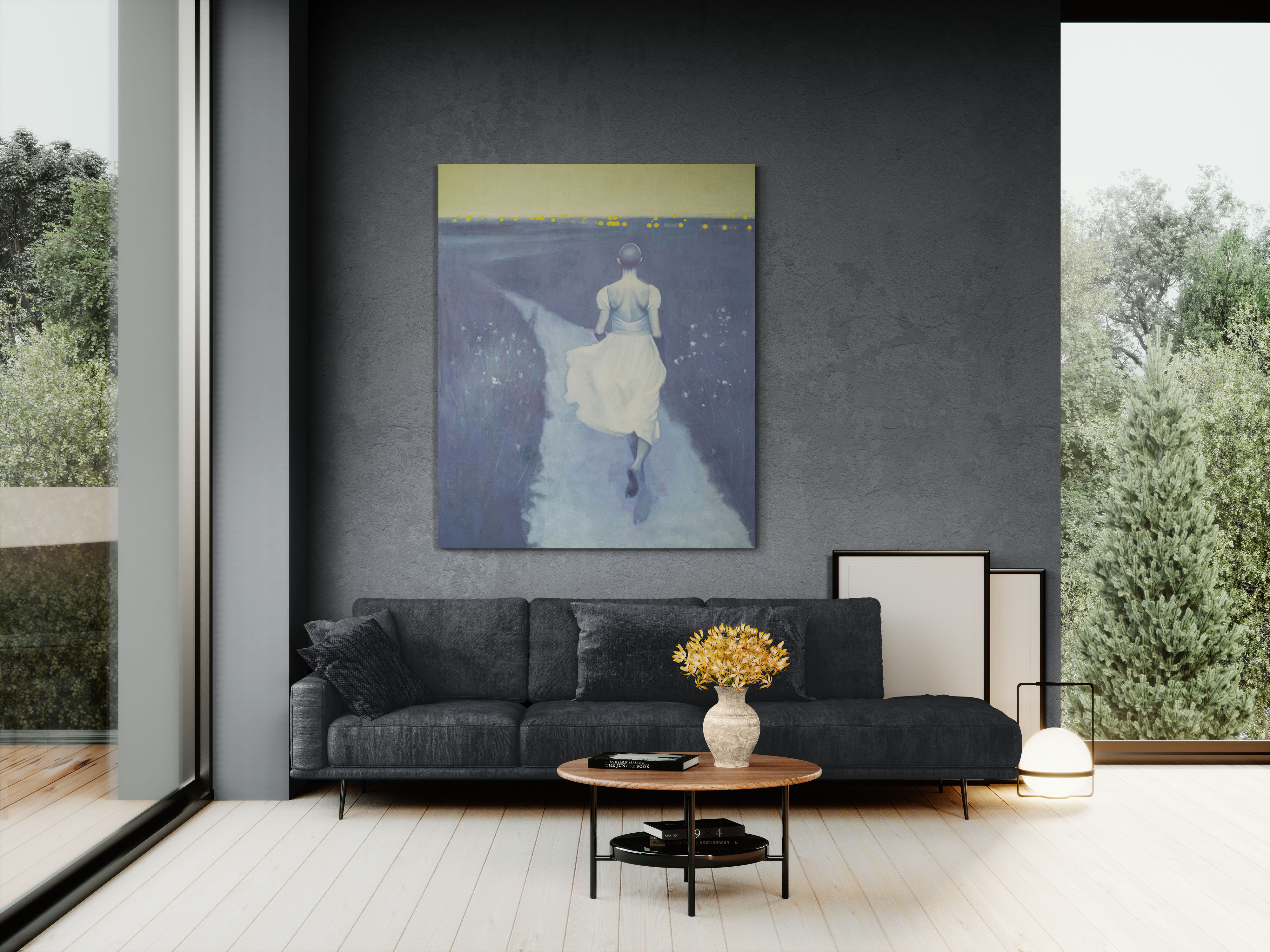 This oil portrait painting of a young woman in a summer dress is by Daniel Hughes.Celebrated internationally as a fine portrait artist, Daniel Hughes’ masterful realistic work often captures a moment in time. In this nostalgic painting, a young woman in a white summer dress runs barefoot down a narrow country path. She is running towards a sunlit sky away from the viewer, revealing a slim back and a shaved head. Wildflowers can be seen as shadowy images in a soft white and gray palette on either side.