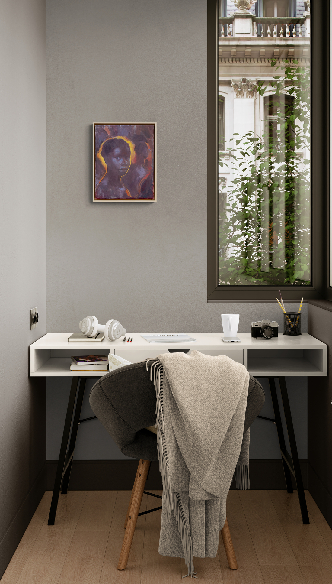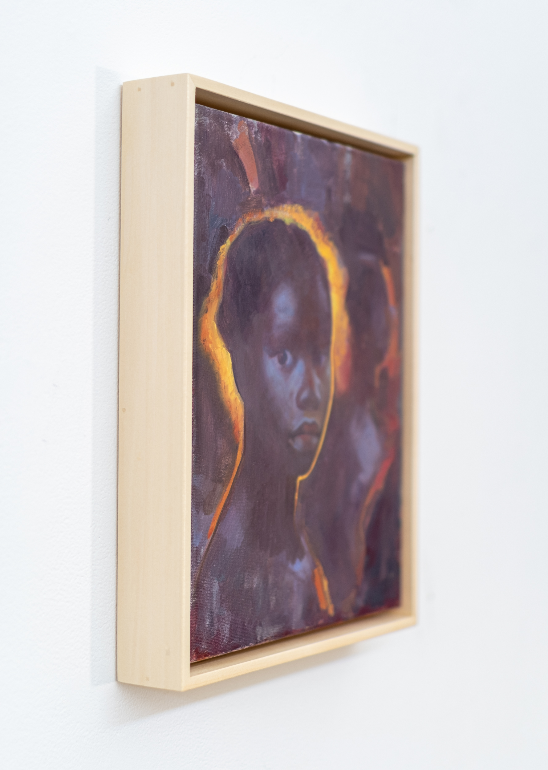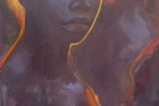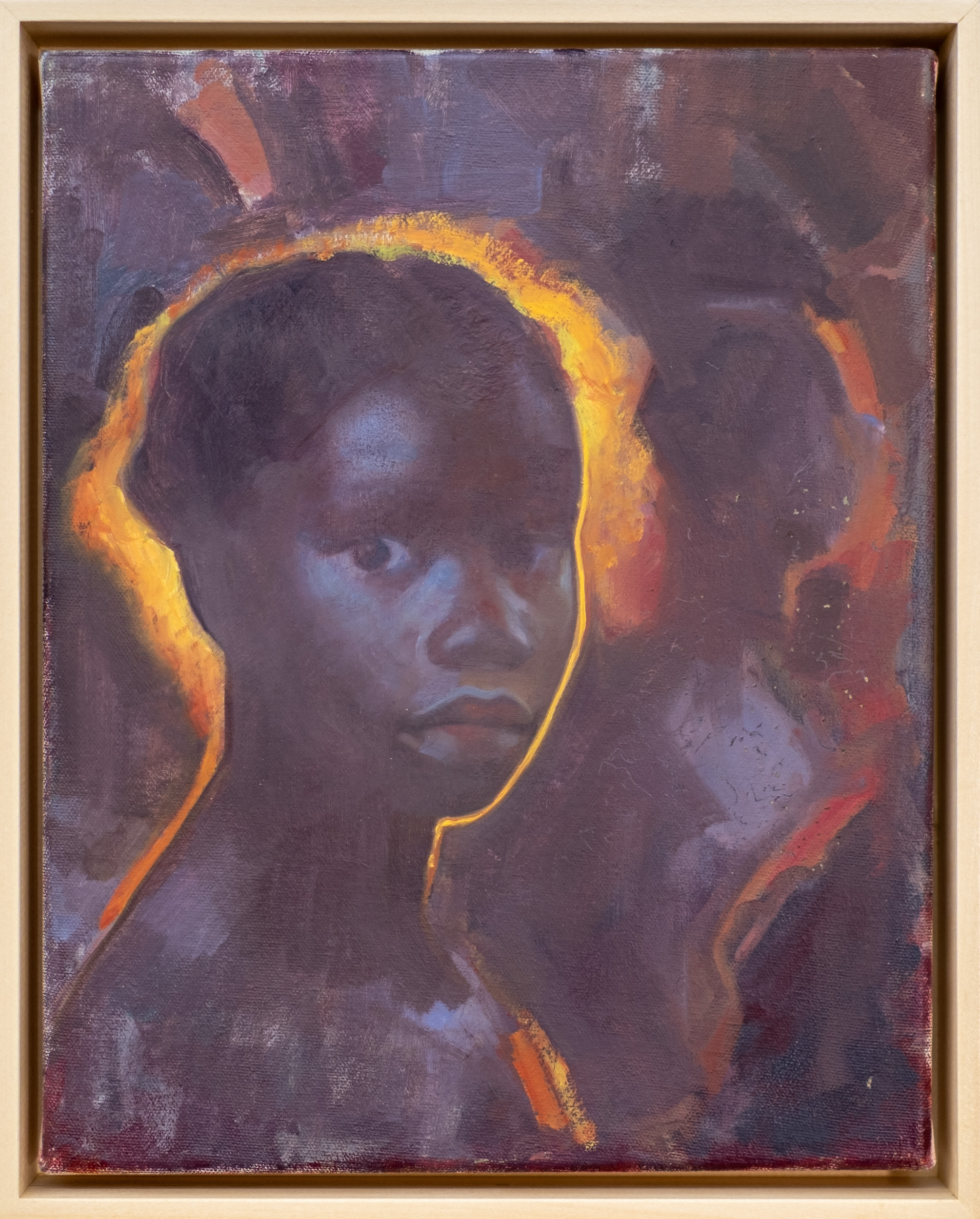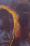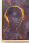 This realistic oil painting is a portrait of a young Kenyan girl by Daniel Hughes.Internationally recognized as a fine artist, Daniel Hughes has painted a haunting image with this new portrait. In all of his figurative work, Hughes attempts to capture a moment in time. His attention to fine detail—the contours of the young girl’s face, her soulful eyes are accentuated by a rich, dark palette and a masterful use of light. Caught at “twilight, where the fading light bathes them in a dreamy, almost ethereal glow. Hopefully, the interplay of cool shadow and warmth light