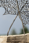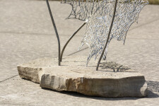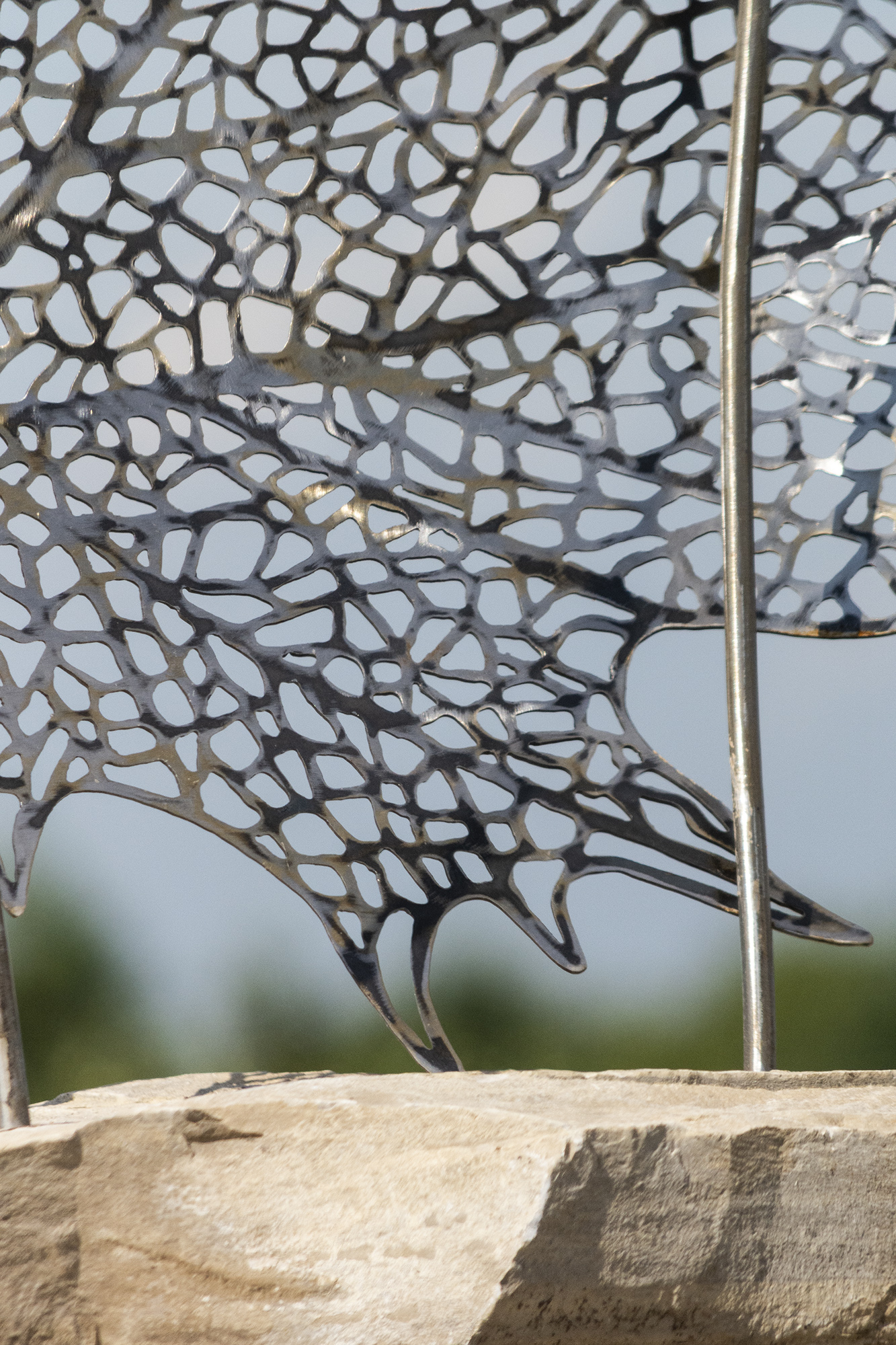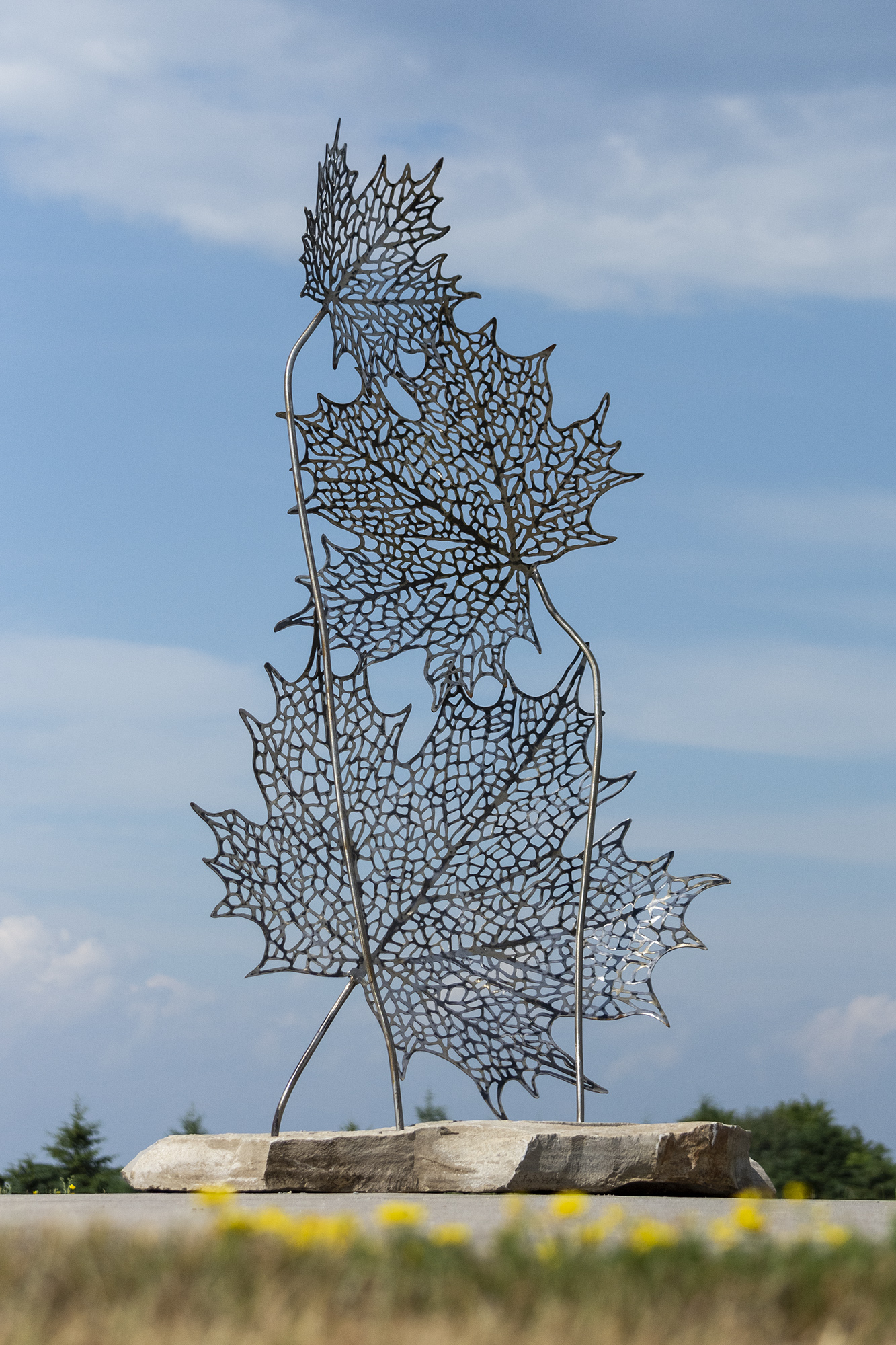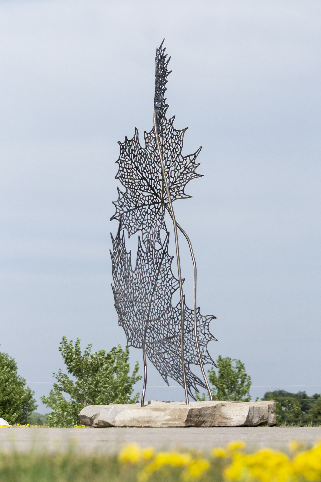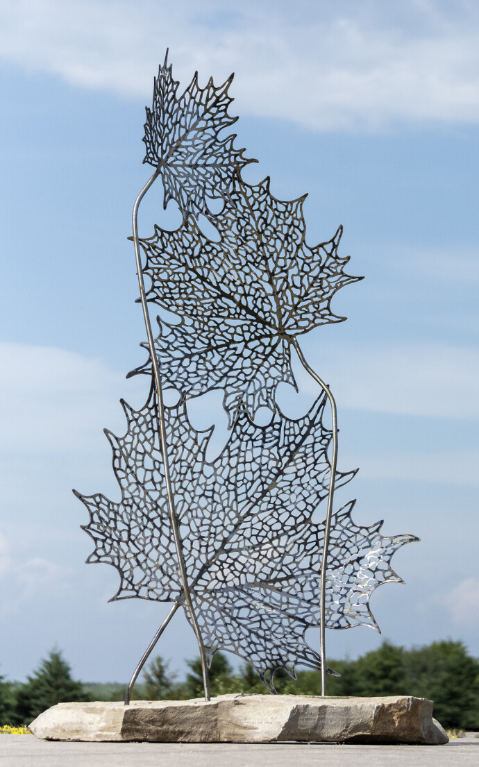 Working out of his family farm in rural Quebec, Perkins has been creating sculptural art in metal, wood and stone for more than ten years. His inspiration is nature—in theme, and simple form-familiar imagery he’s been around all his life. This is one of a series that features three maple leaves in different sizes, masterfully cut from steel and anchored in stone. The sculpture is finely detailed, with silhouettes that allow the landscape, the earth, and the sky to be seen through them. It appears to be blowing in the wind.