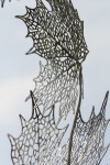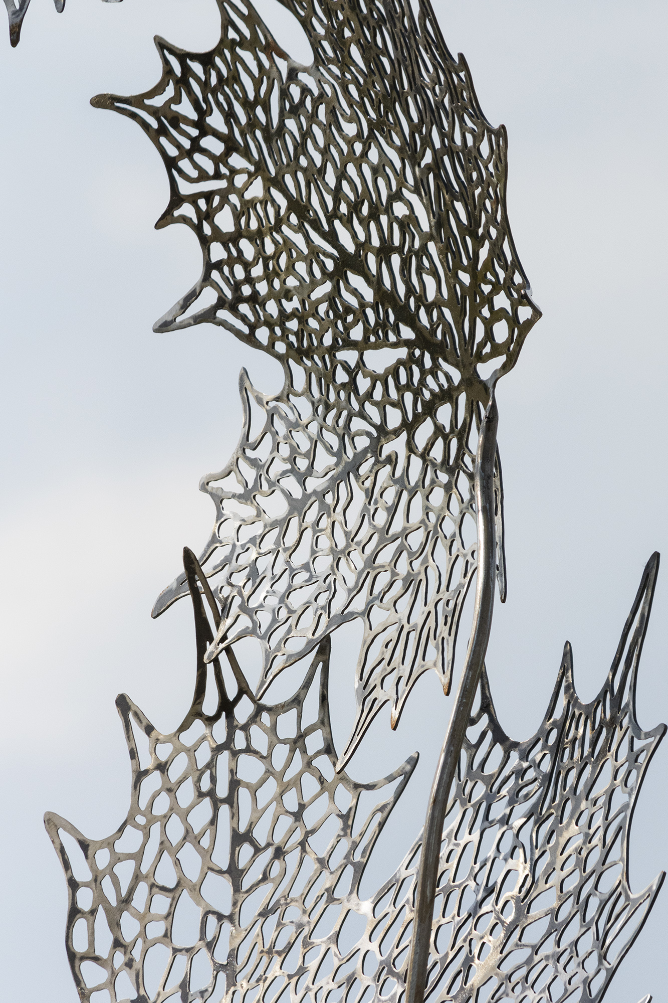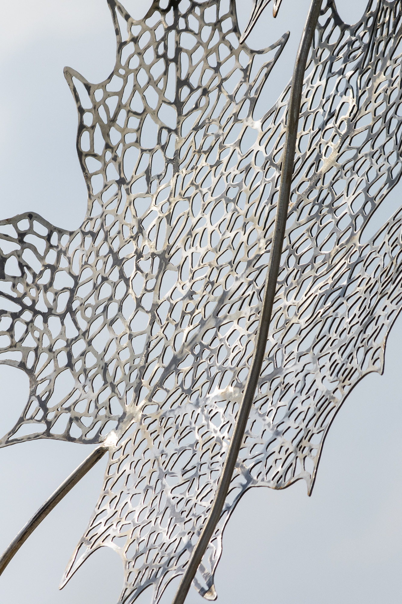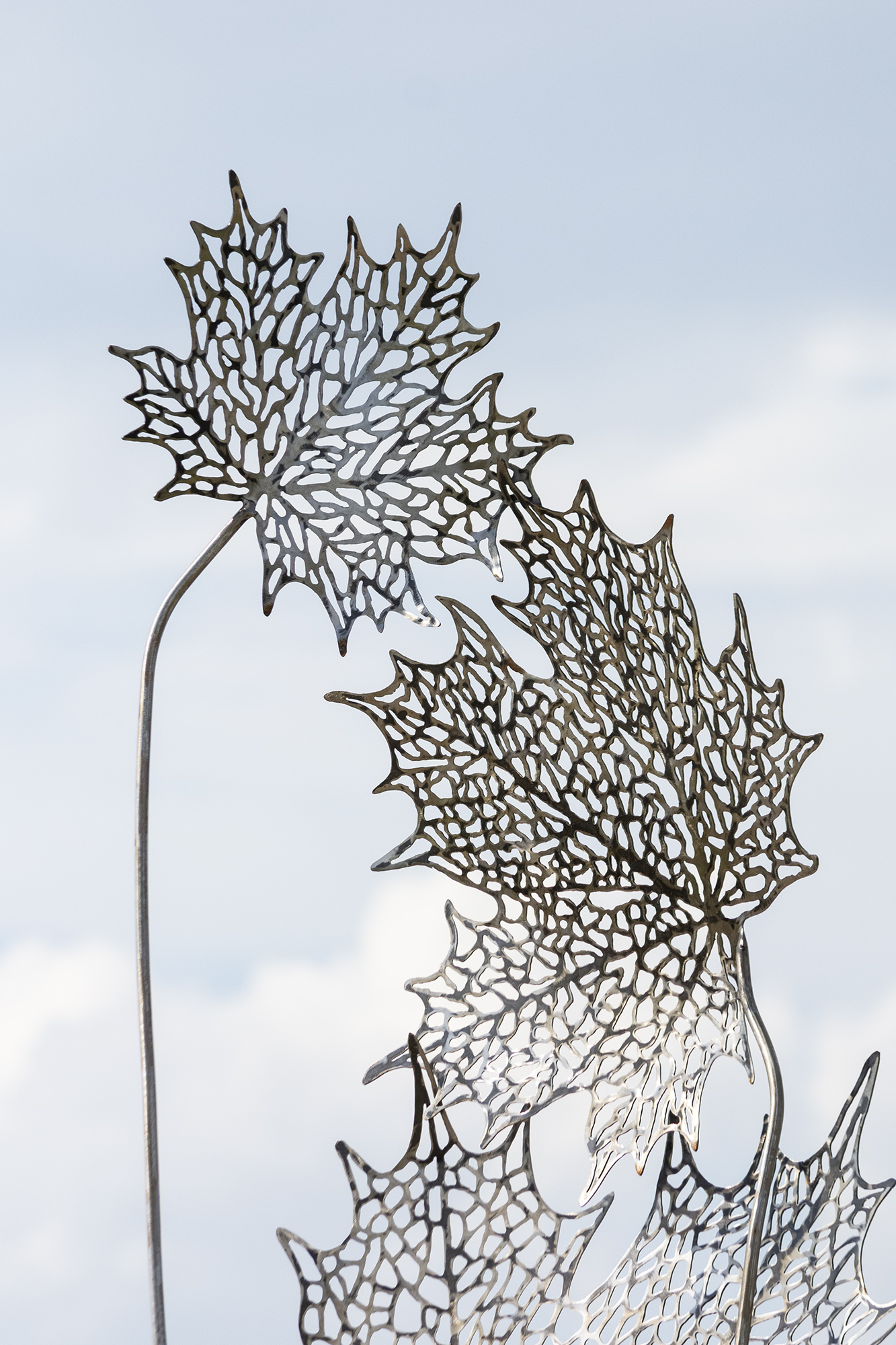 This contemporary outdoor figurative sculpture is of three metal maple leaves.
