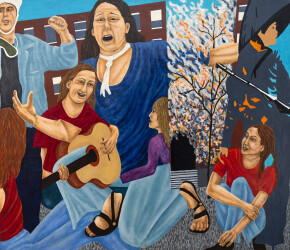 Much of Root’s recent work explores the impact of these wars within the family, incorporating seemingly dissonant images from art history, advertising illustration, and photography. Forms blur and bleed into one another, while elements are cut off—yet a narrative still emerges. Her fragmented compositions and bold colors heighten moments of disconnection in both social and familial contexts. Meanwhile, the relative flatness of the objects surrounding the central figures emphasizes the stagelike quality that defines many of the moments she portrays.