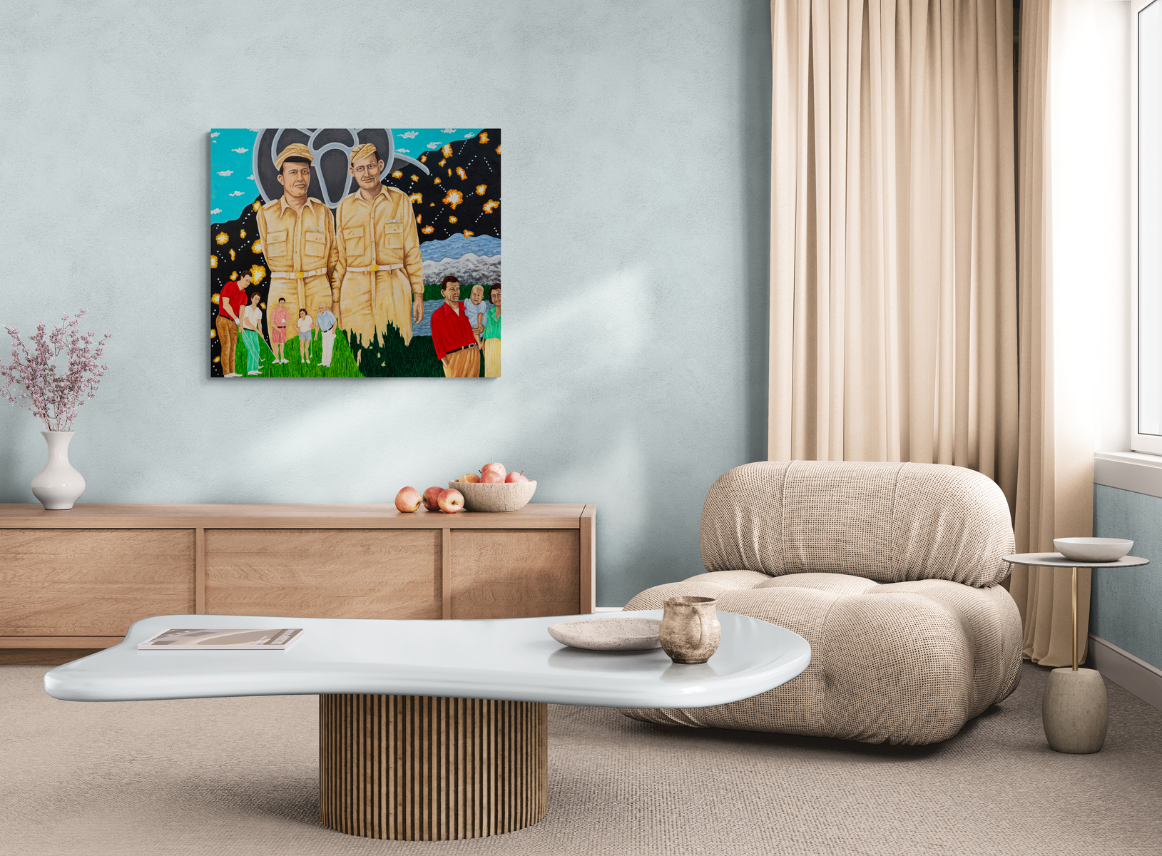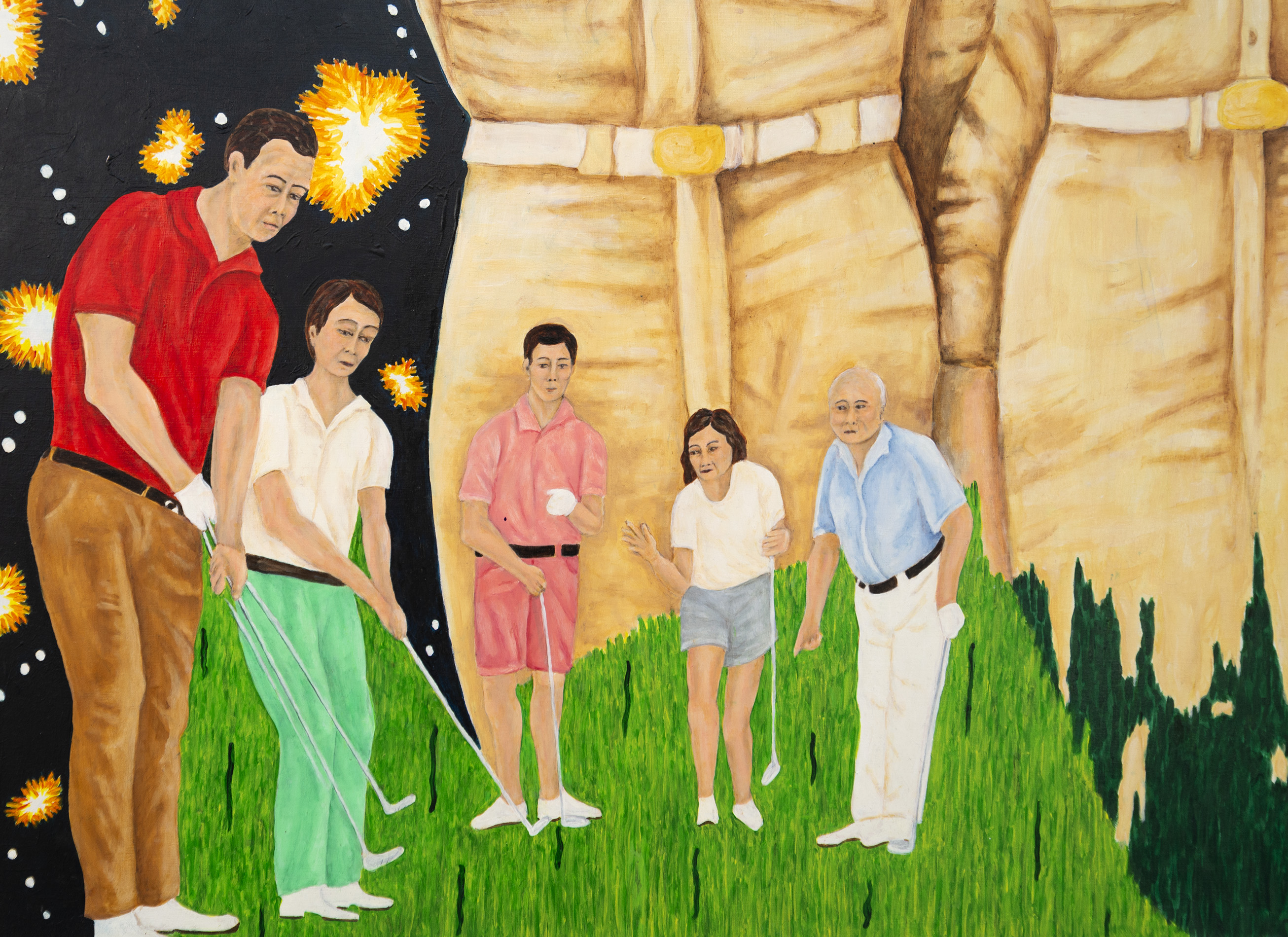 This contemporary figurative oil painting explores themes of politics and culture.Deborah Root’s dynamic colourful compositions tell an intimate story about her experience during socially relevant and politically important moments in time.
